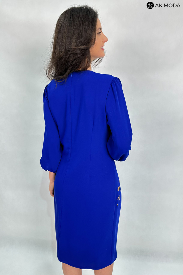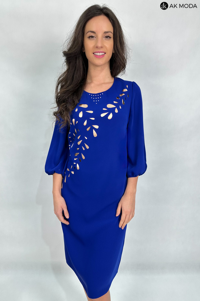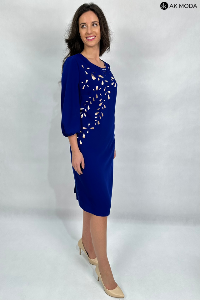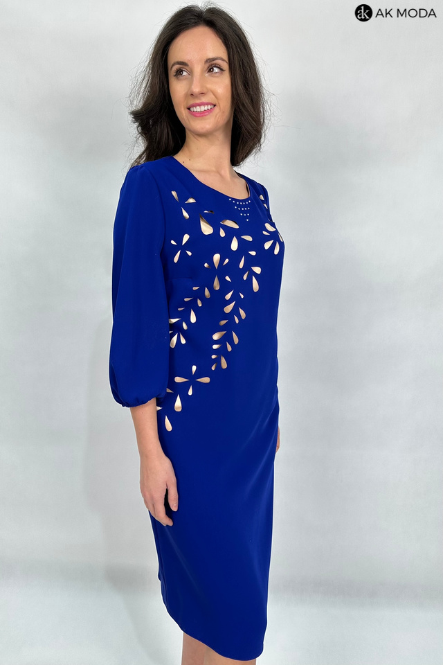 Elegancja sukienka w kolorze chabrowym z ażurowym ozdobnym wyzięciem z przodu. Dekolt okragły, luźne rękawy do łokcia, zakończone gumką.