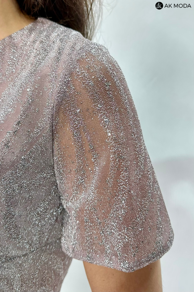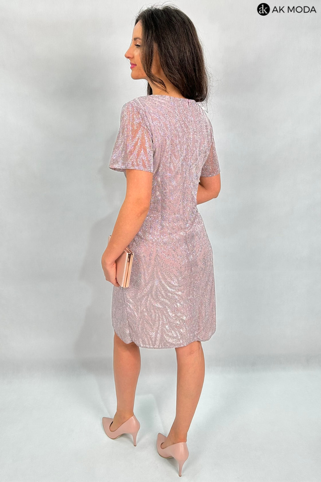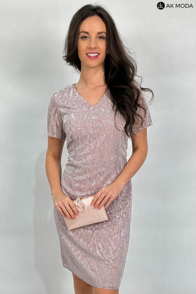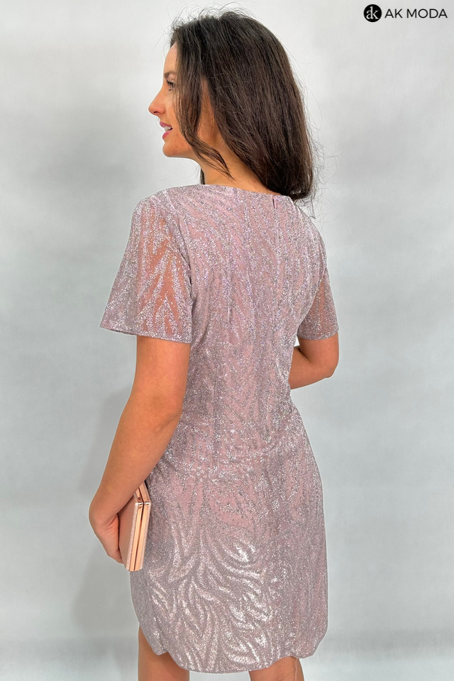 Elegancka, dopasowana sukienka w kolorze brudnego pudrowego różu z brokatowymi zdobieniami. Dekolt w szpic, transparentne krótkie rękawy.