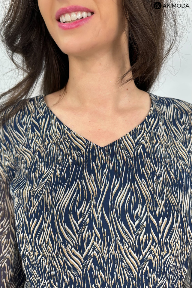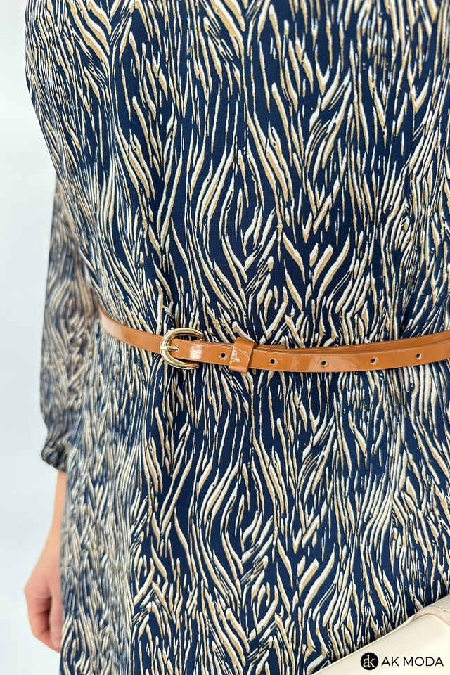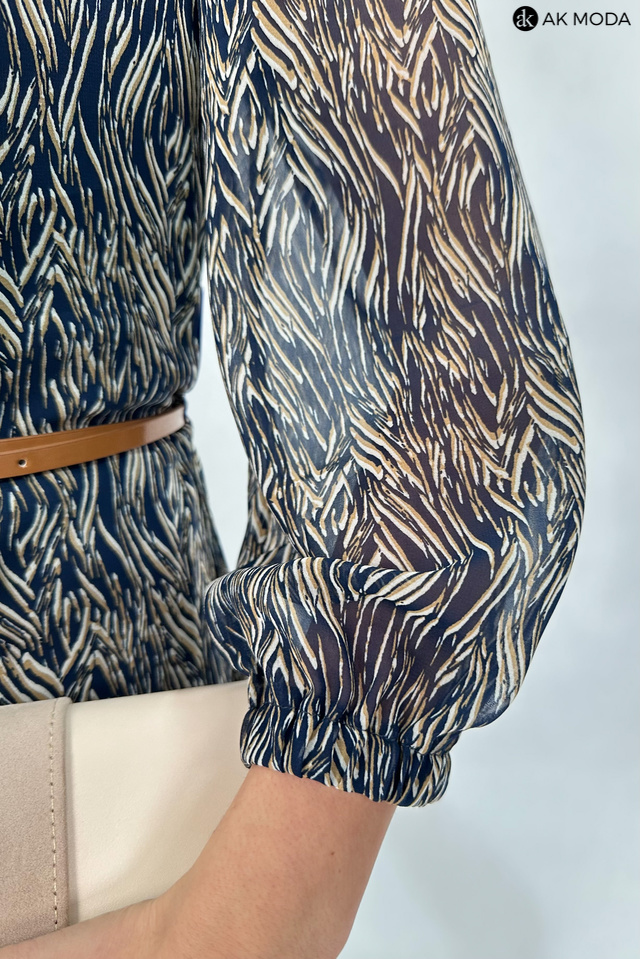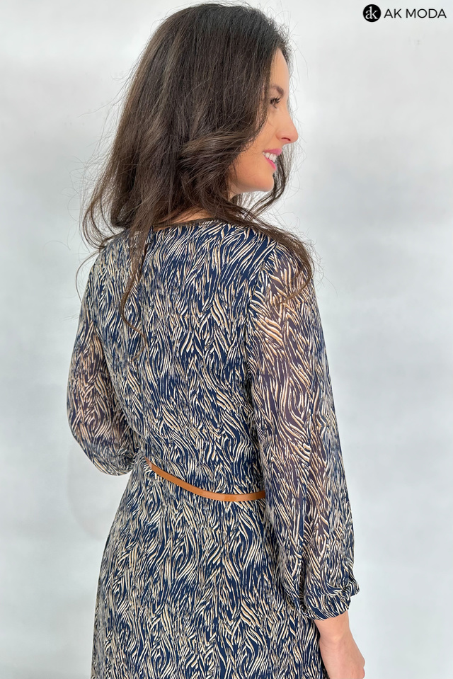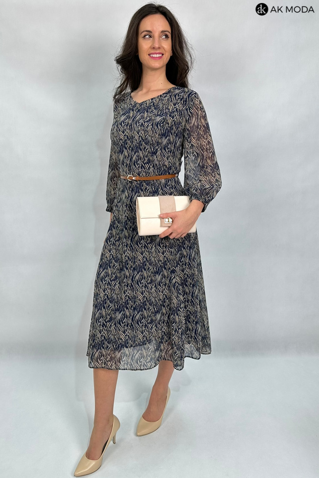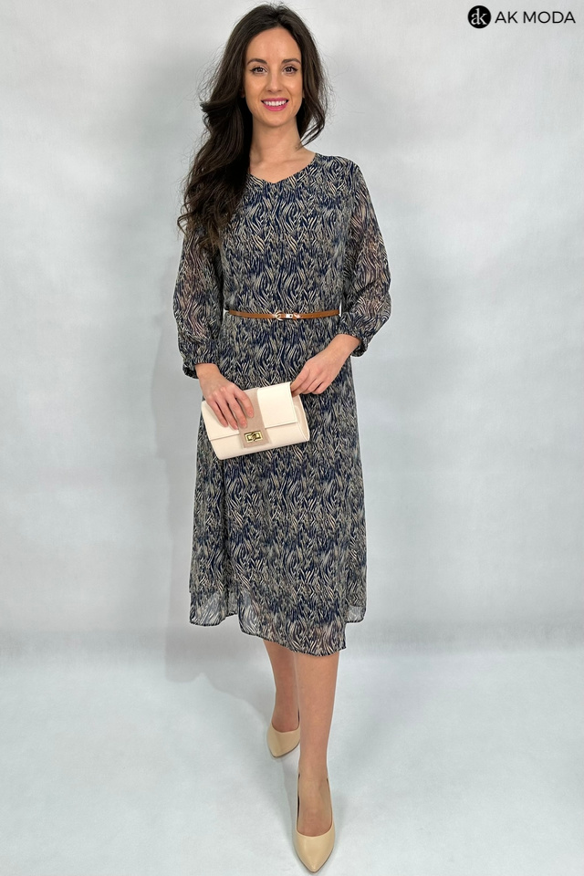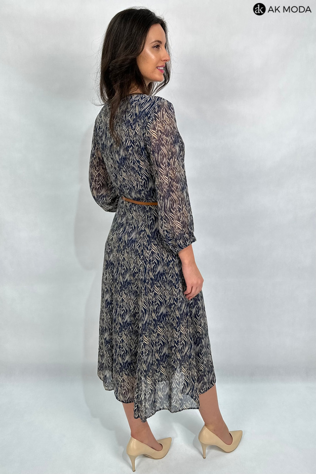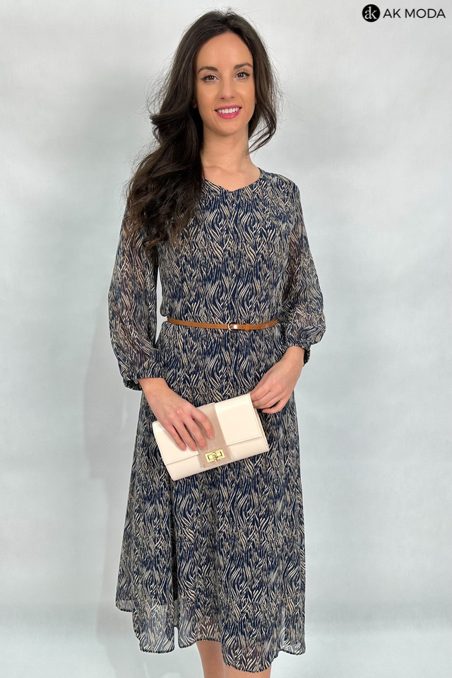 Rozkloszowana sukienka midi utrzymana w kolorystyce granatowo-beżowej. Dekolt w szpic, transparentne rękawy 3/4 zakończone gumką, w talii zapinany pasek.