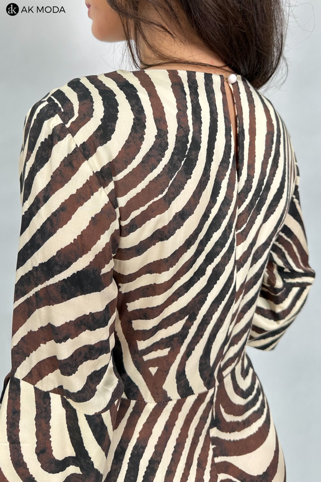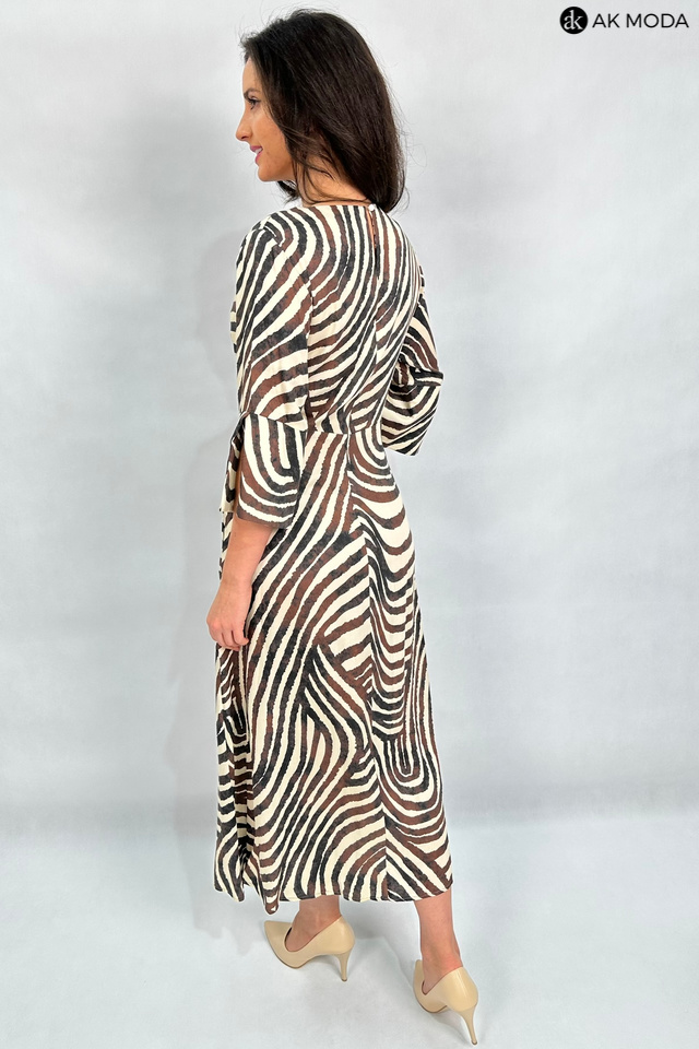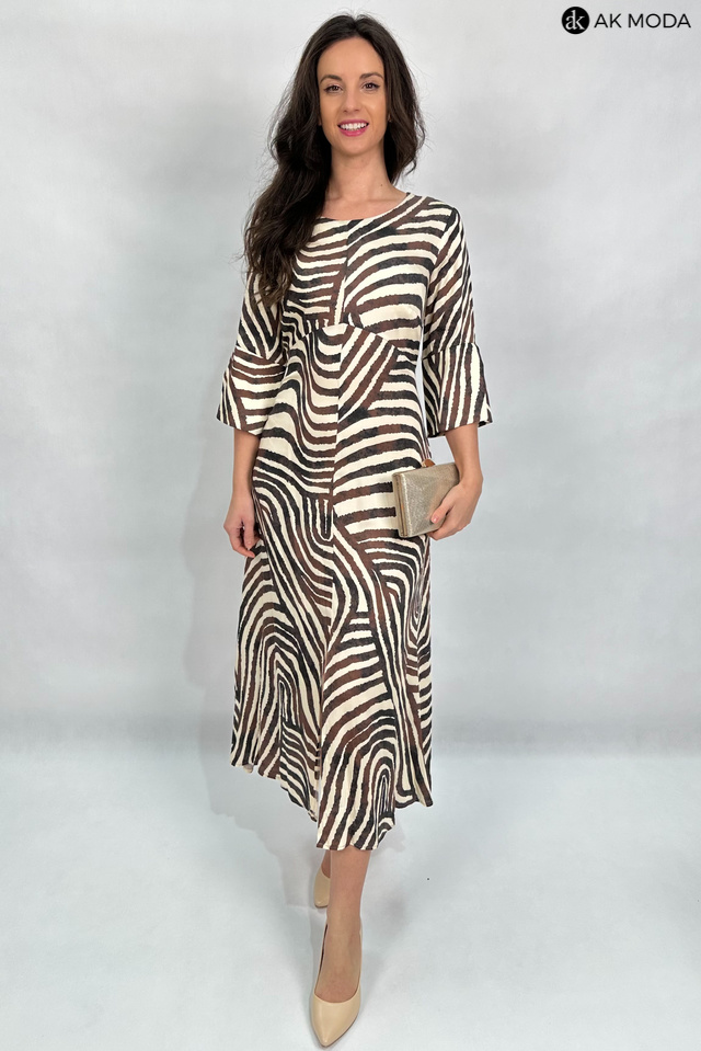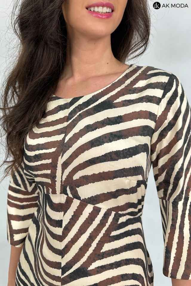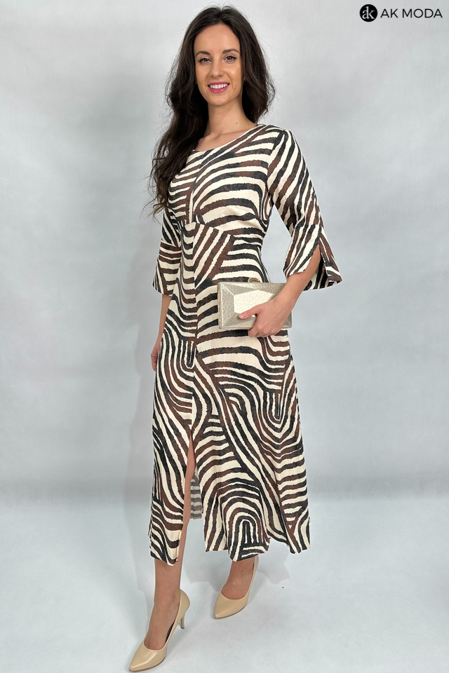 Elegancka sukienka o trapezowym kroju w beżowo-brązowej kolorystyce. Dekolt okrągły, luźne rękawy do łokcia, z przodu rozcięcie. Sukienka posiada kieszenie.