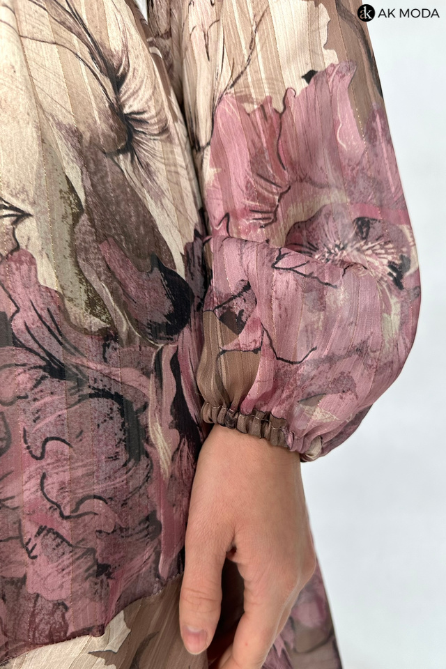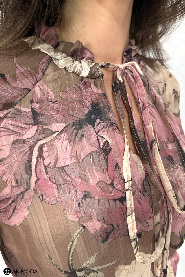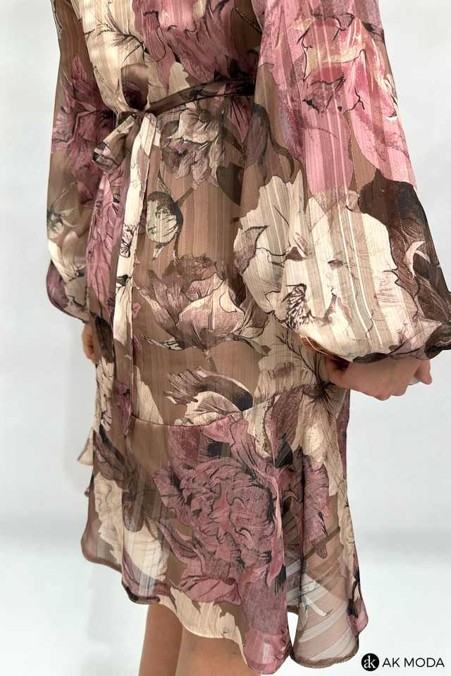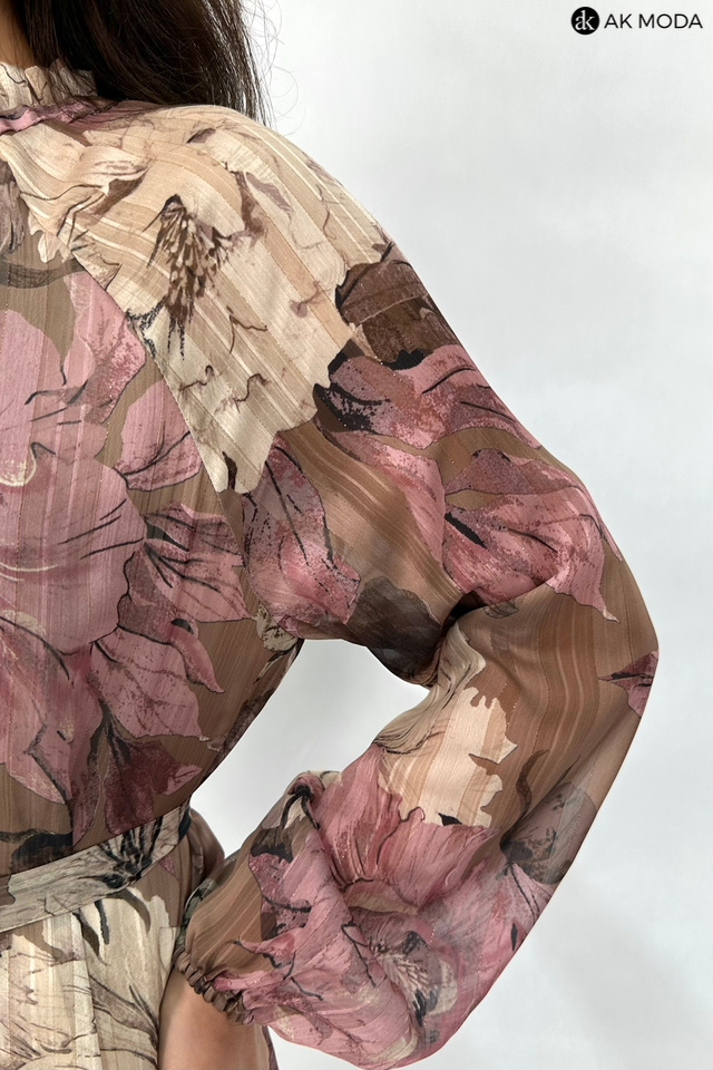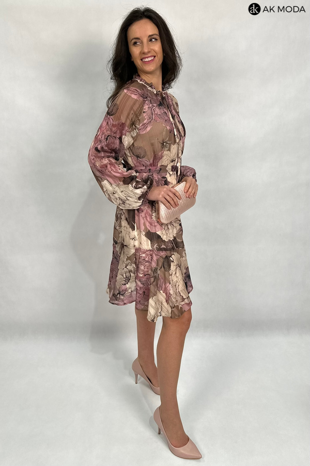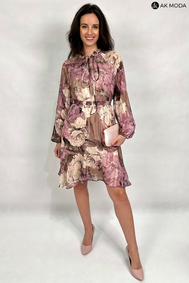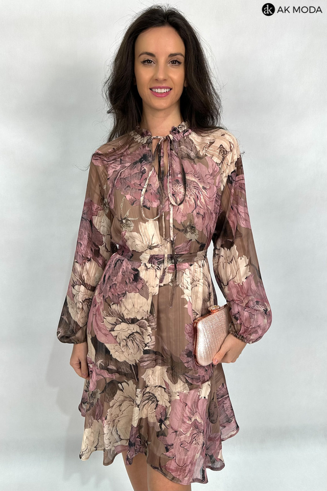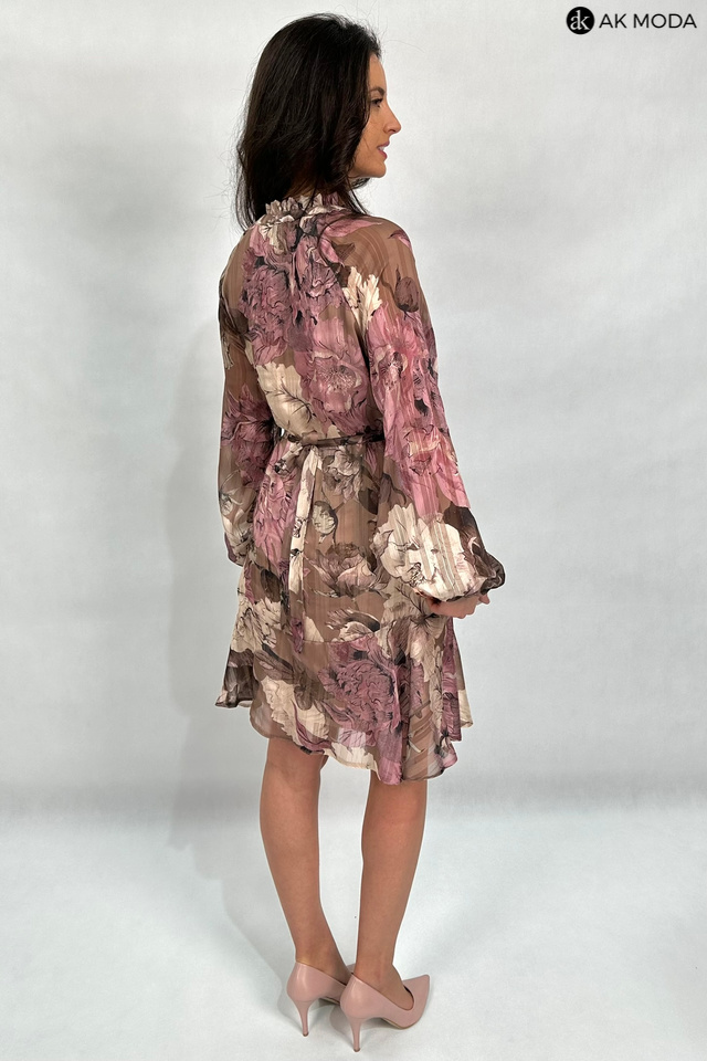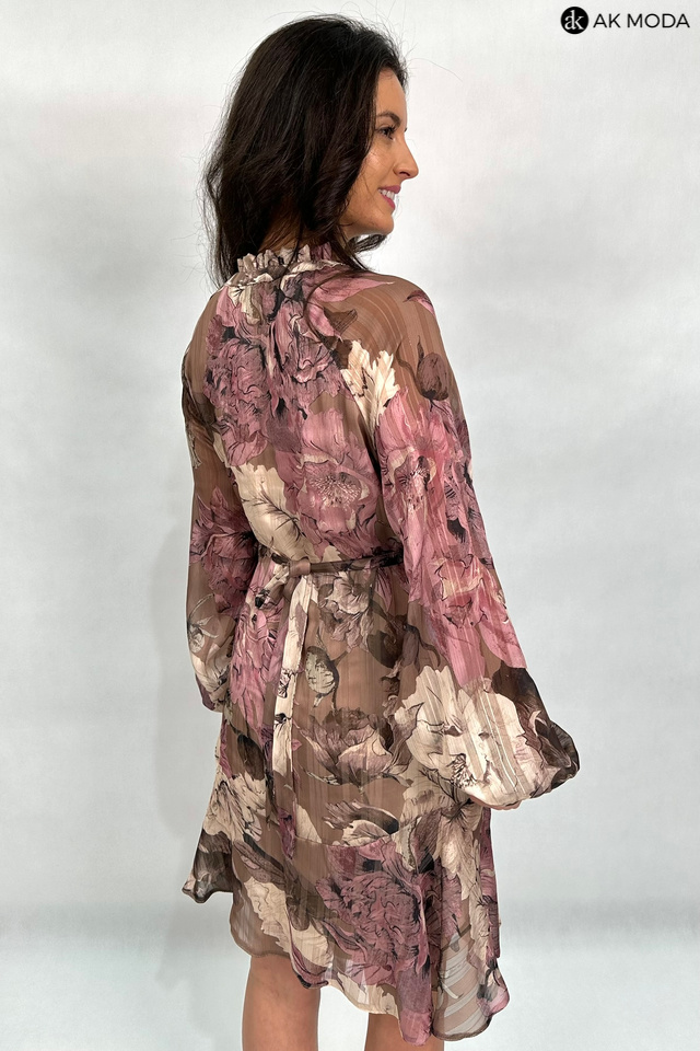 Zwiewna sukienka z kwiatowym printem w odcieniach brązu i różu, ze stójką i wiązaniem pod szyją. Długie, transparentne rękawy zakończone gumką, w talii wiązany pasek.