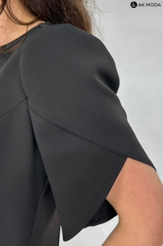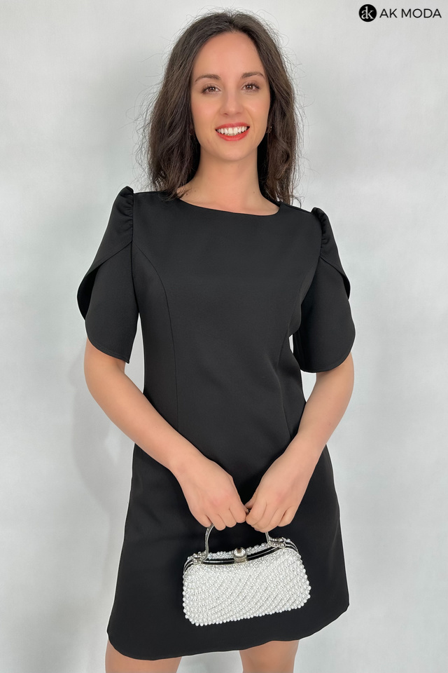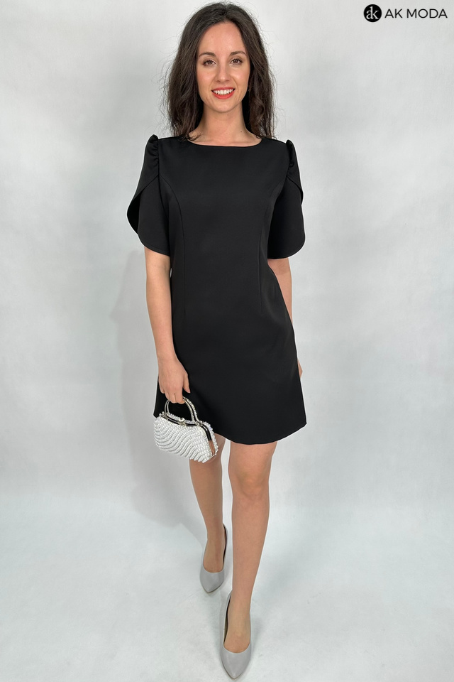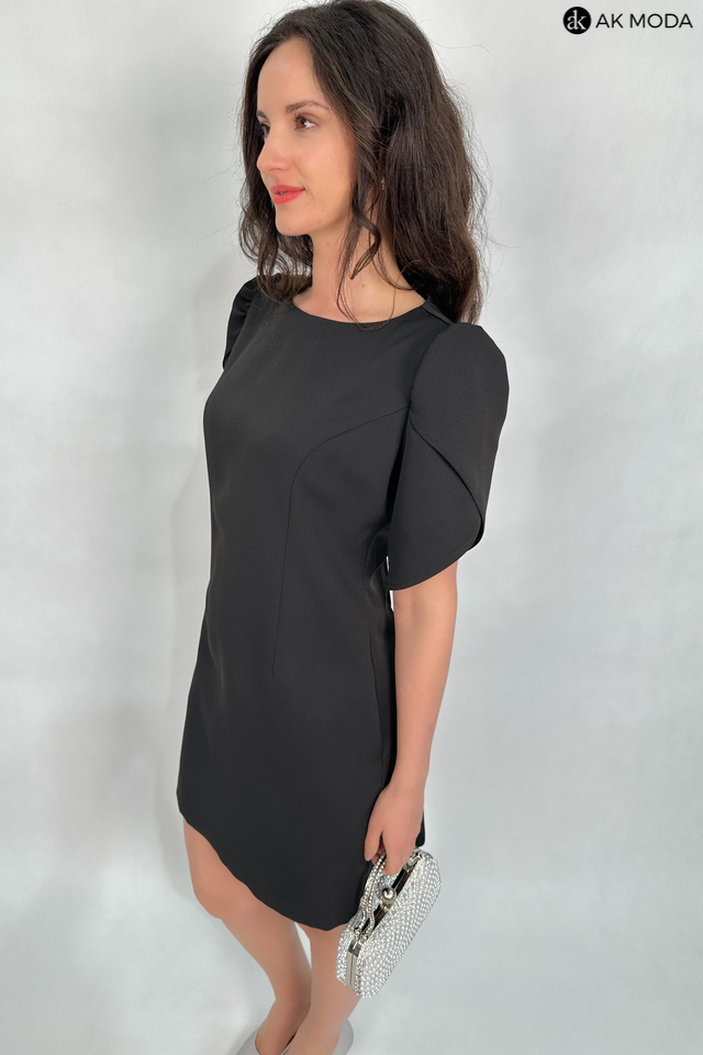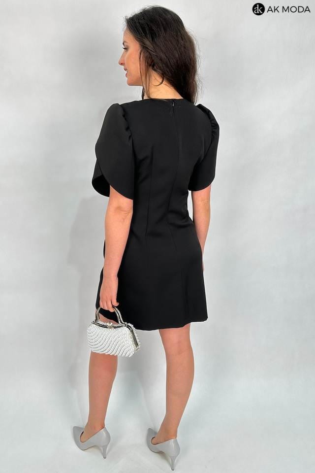 Elegancka sukienka mini w kolorze czarnym z okrągłym dekoltem i krótkimi, kopertowymi rękawkami. Sukienka posiada kieszenie.