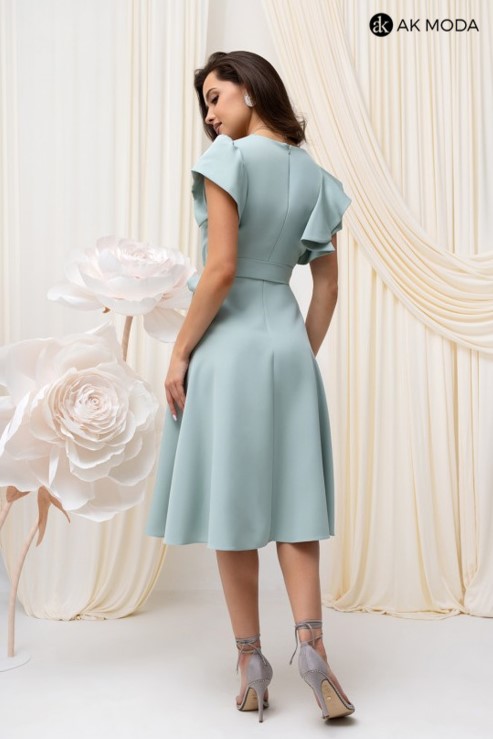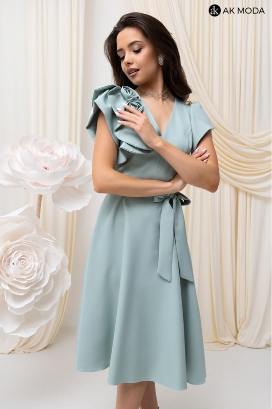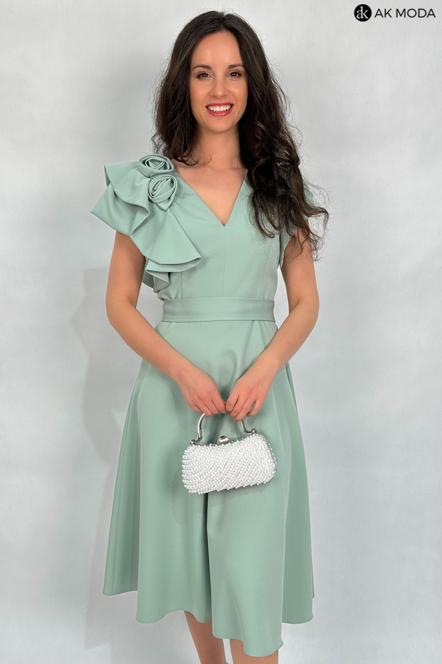 Rozkloszowana sukienka midi w kolorze miętowym, z efektownie upiętym materiałem na ramieniu. Dekolt w szpic, krótkie, luźne rękawki, w talii wiązany pasek.