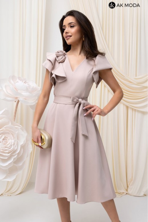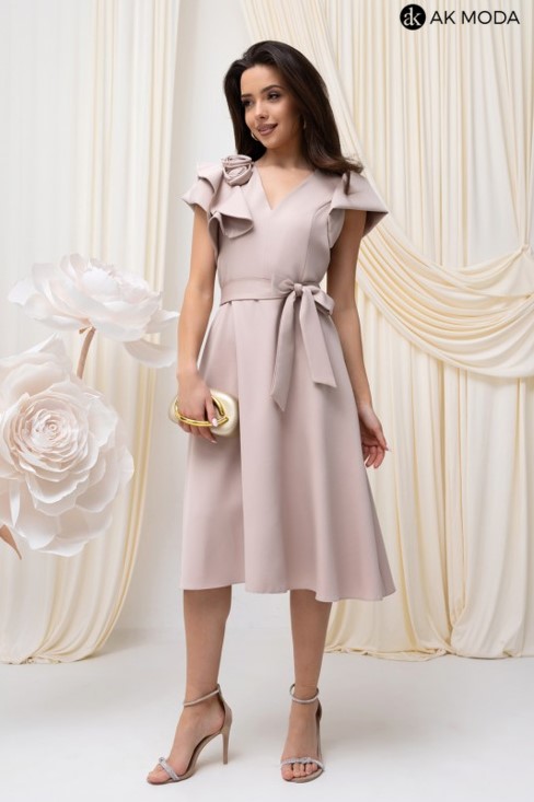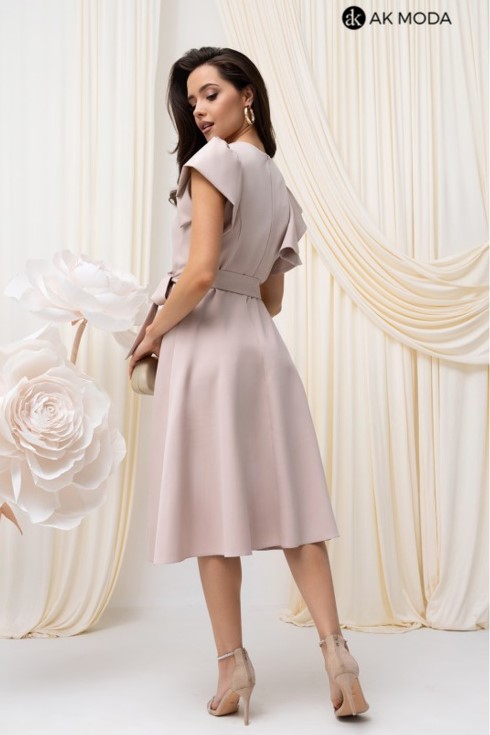 Rozkloszowana sukienka midi w kolorze beżowym, z efektownie upiętym materiałem na ramieniu. Dekolt w szpic, krótkie, luźne rękawki, w talii wiązany pasek.