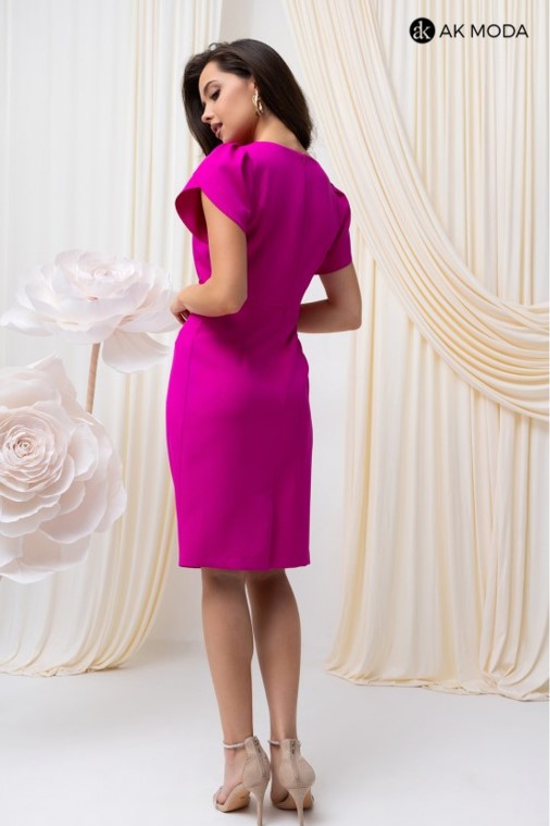 Elegancka, dopsowana sukienka w kolorze fuksjowym. Dekolt okrągły, krótkie kopertowe rękawki, w tali efektowne marszczenie.