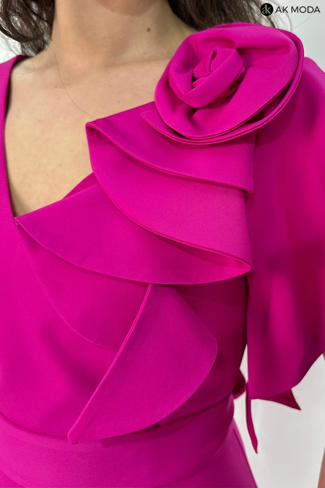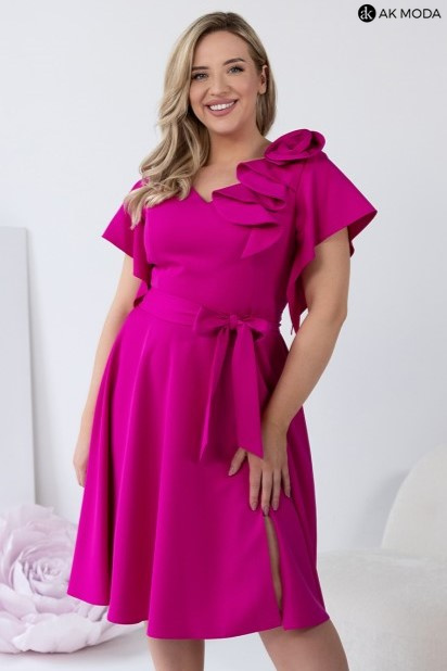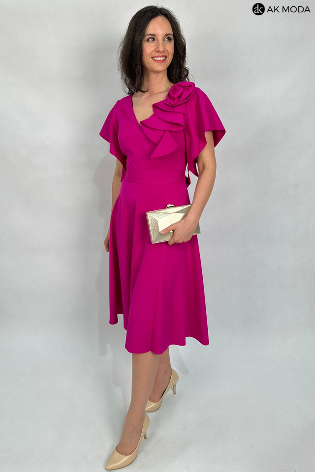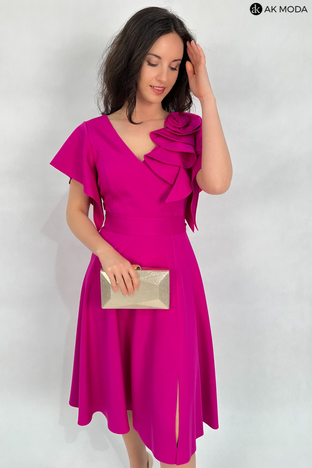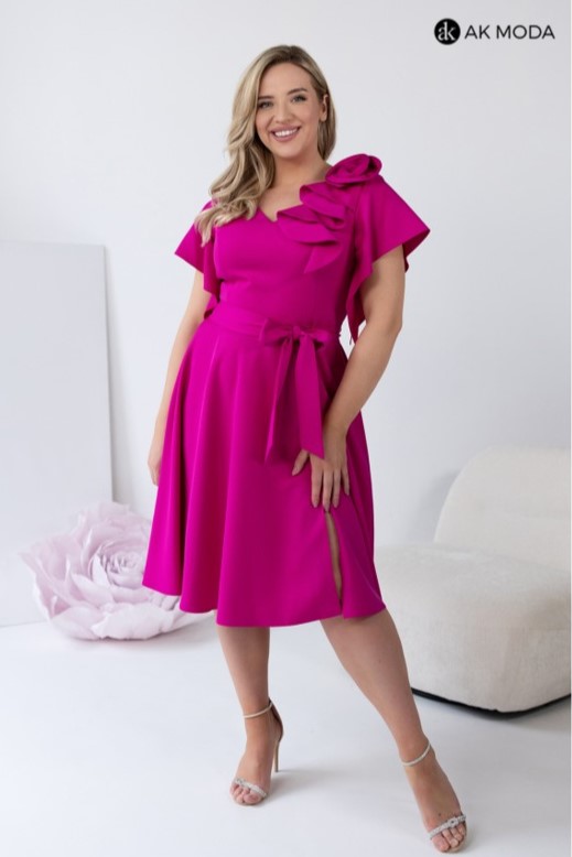 Rozkloszowana sukienka midi w kolorze różowym, z efektownie upiętym materiałem na ramieniu. Dekolt w szpic, krótkie, luźne rękawki w formie falbanki, w talii wiązany pasek.