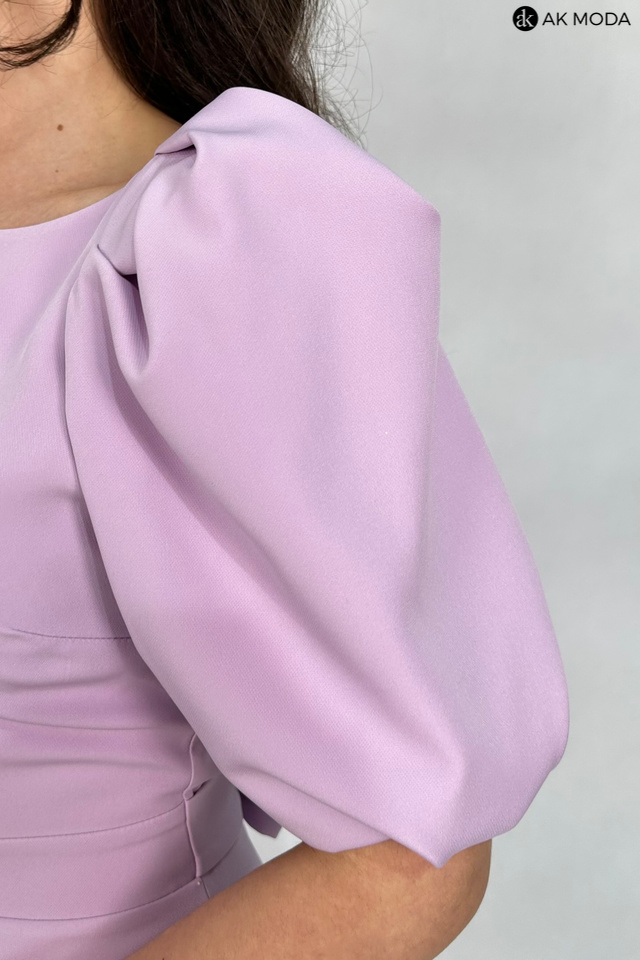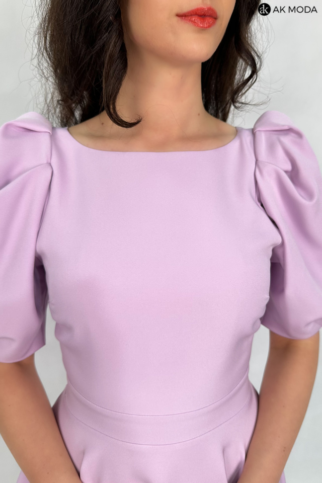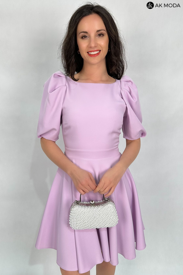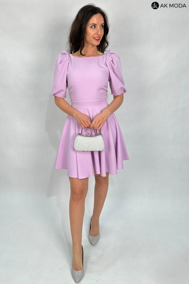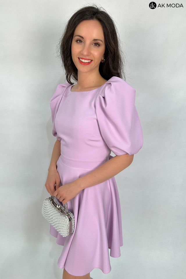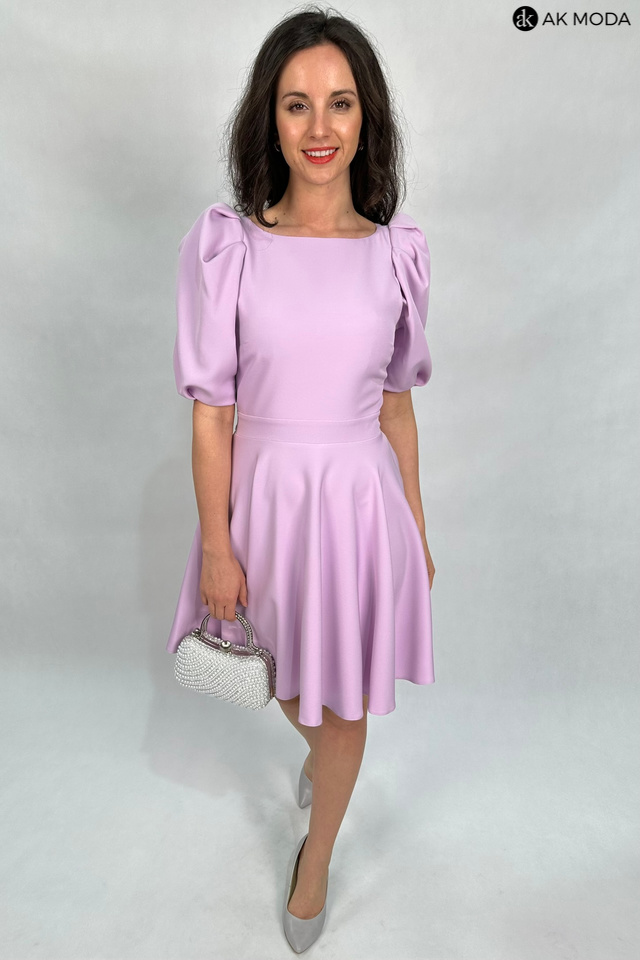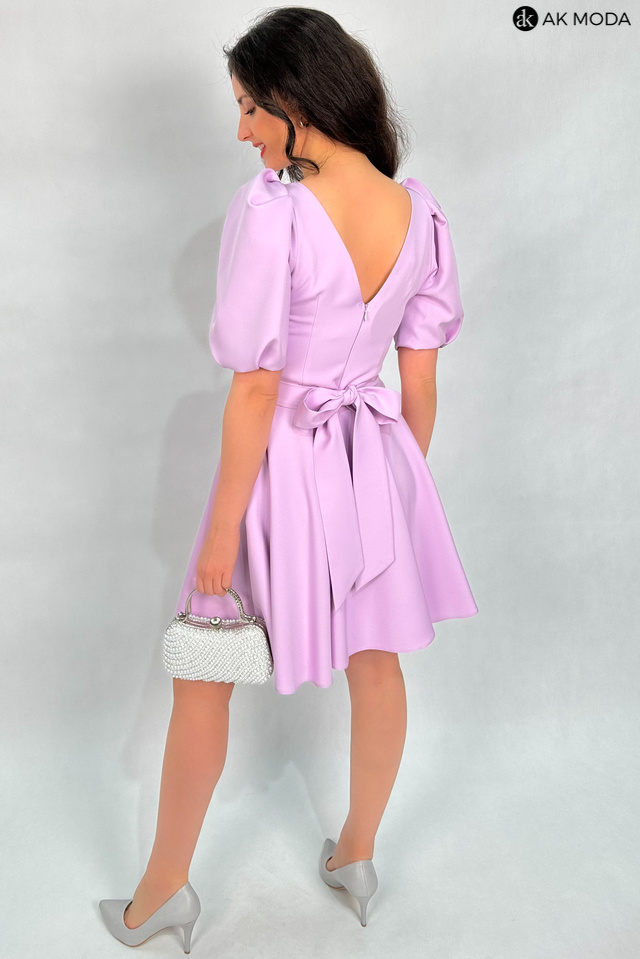 Rozkloszowana sukienka w kolorze jasnofioletowym. Dekolt okrągły, na plecach wycięcie, krótkie, lekko bufiaste rękawy, w talii wiązany pasek.