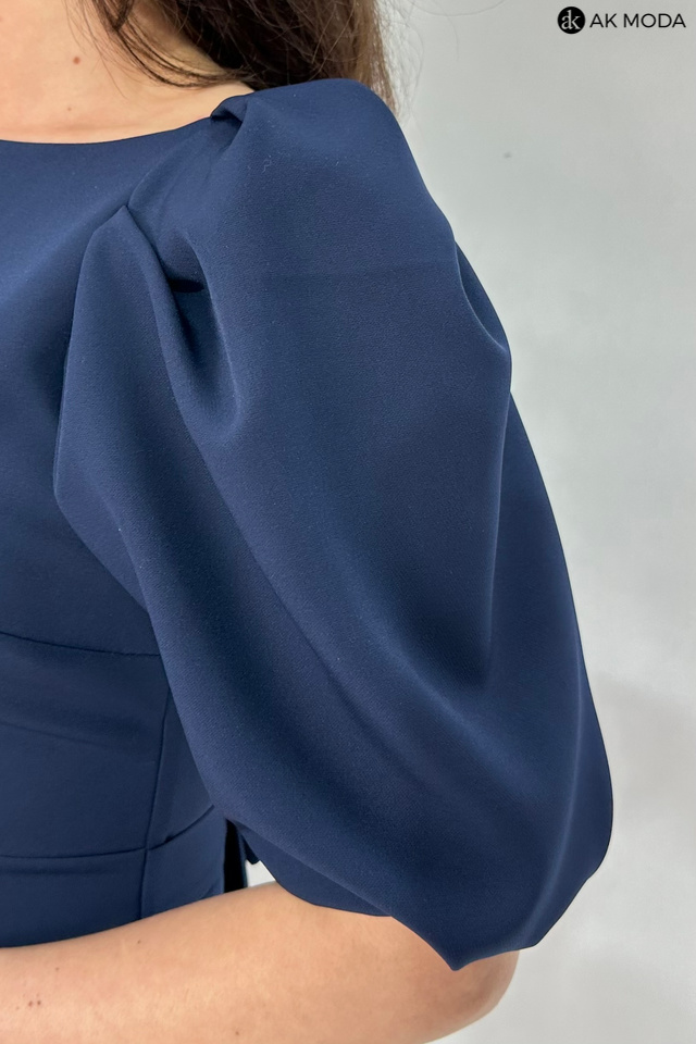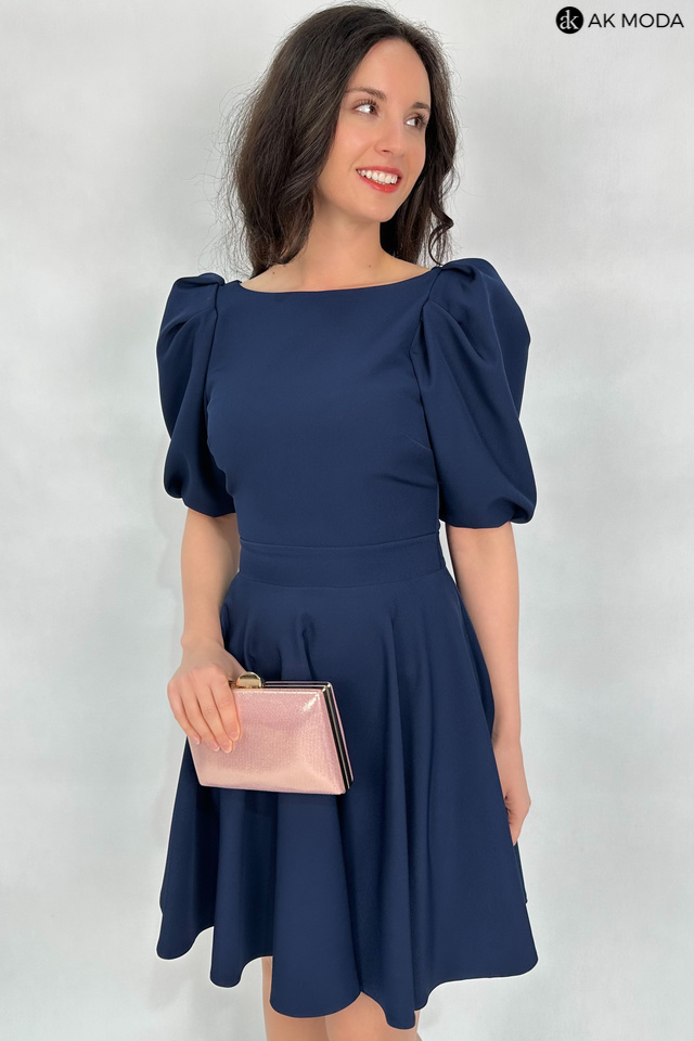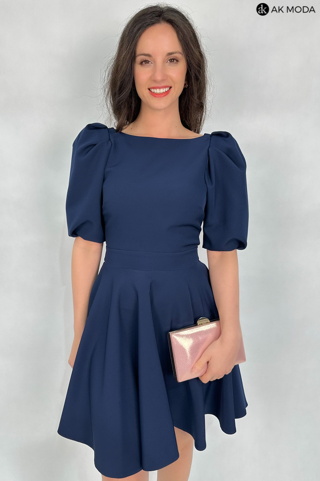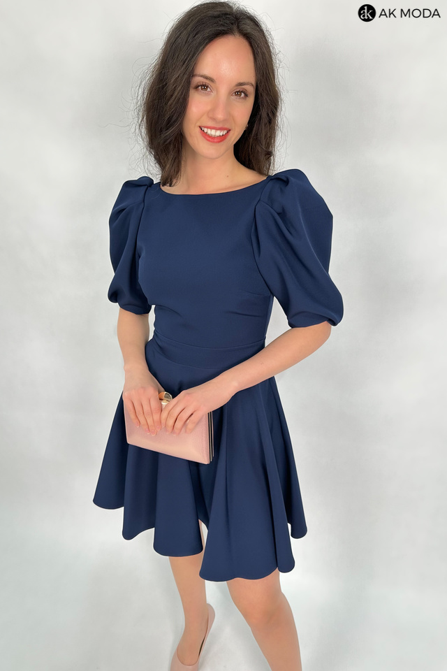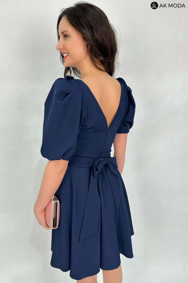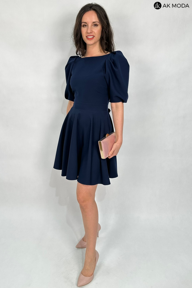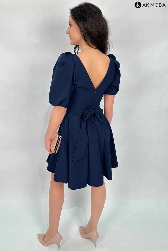 Rozkloszowana sukienka w kolorze granatowym. Dekolt okrągły, na plecach wycięcie, krótkie, lekko bufiaste rękawy, w talii wiązany pasek.