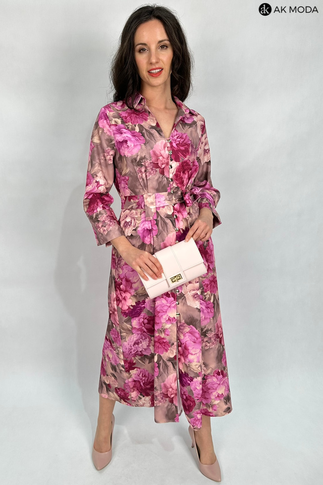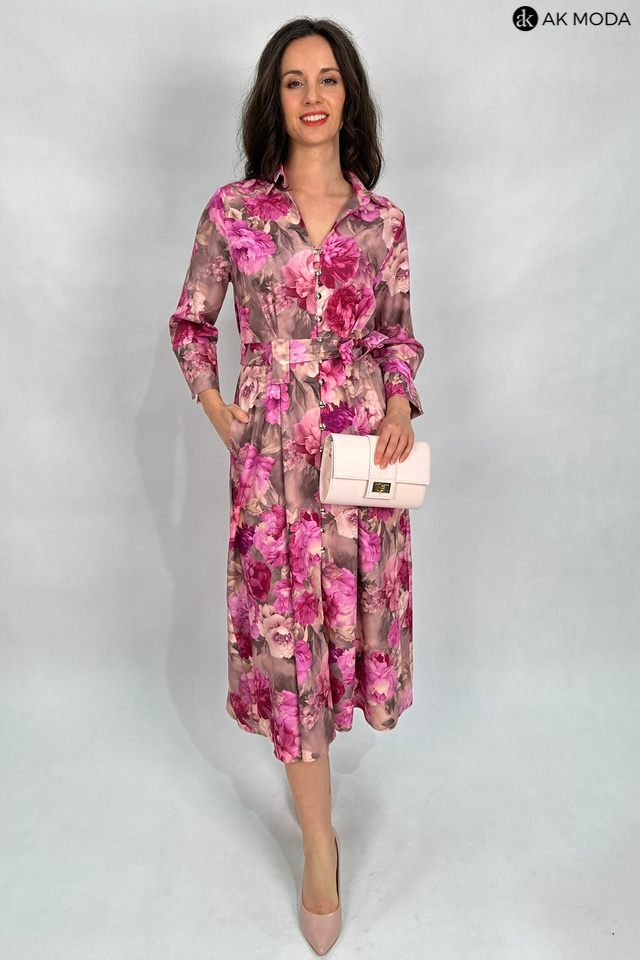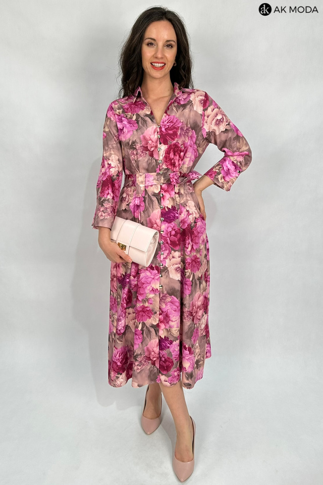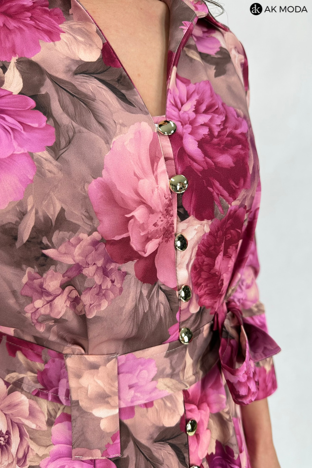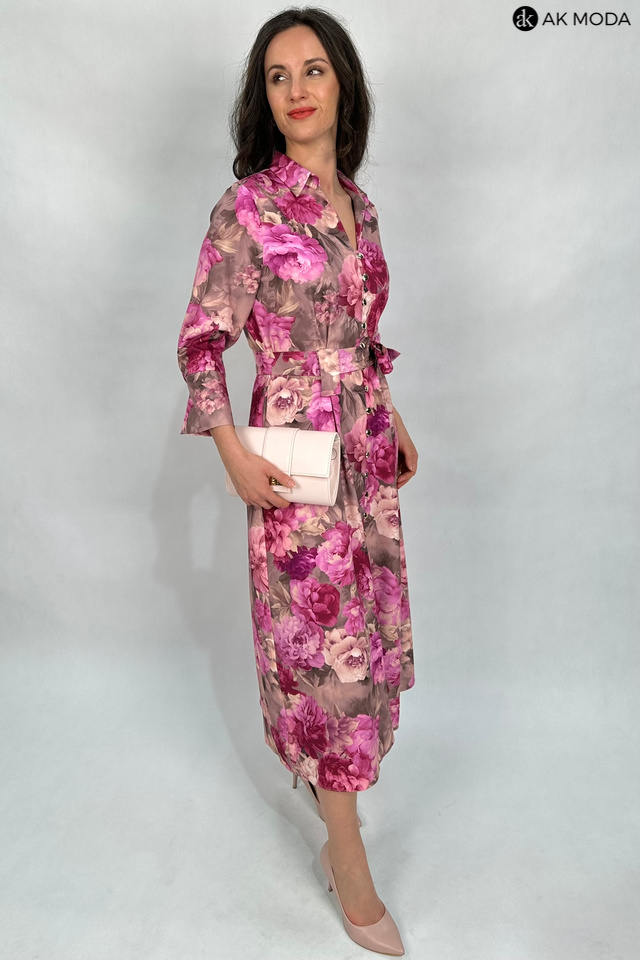 Elegancka sukienka midi z kwiatowym printem, utrzymana w różowo-beżowej kolorystyce. Rękawy 3/4 zakończone mankietami, w tali wiązany pasek. Sukienka posiada kieszenie.