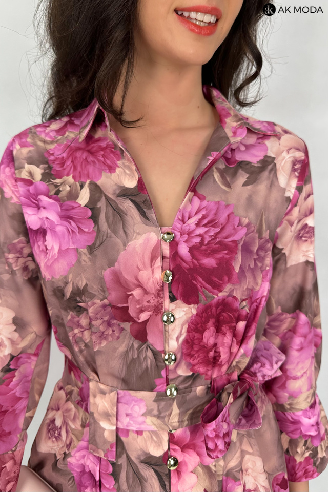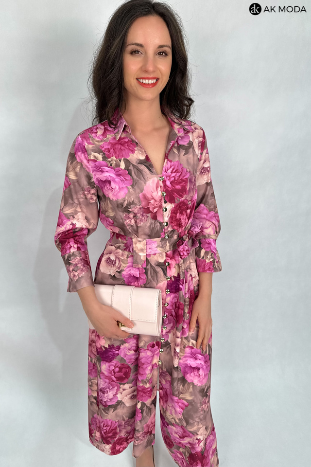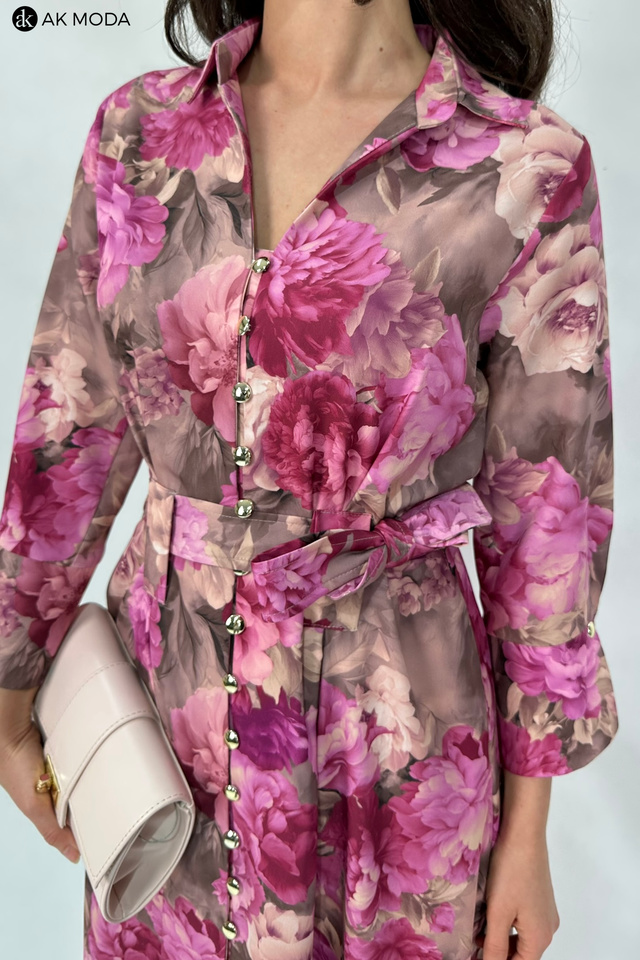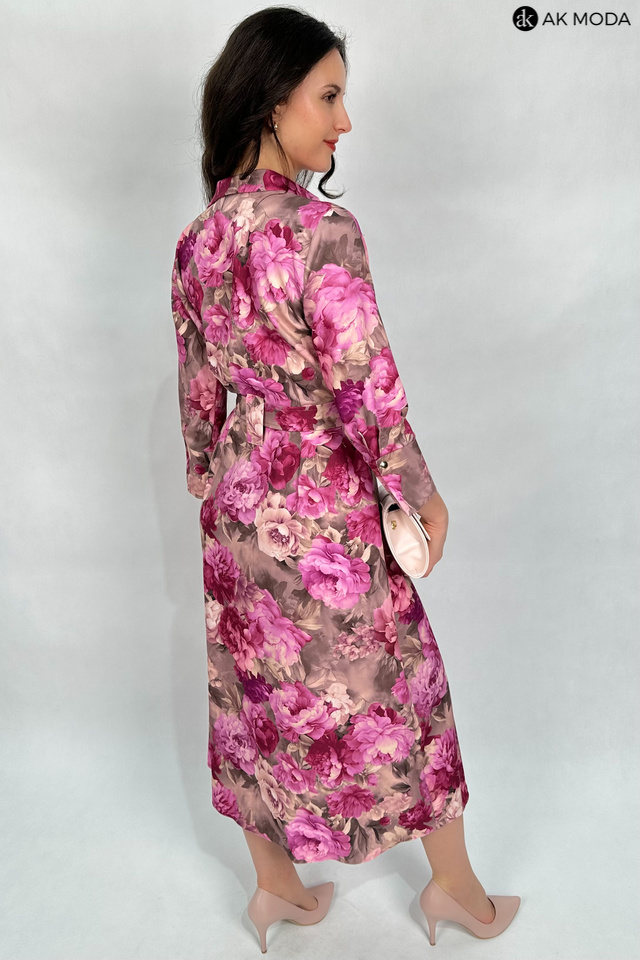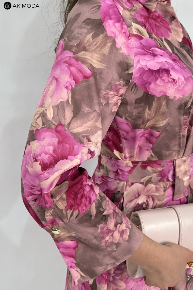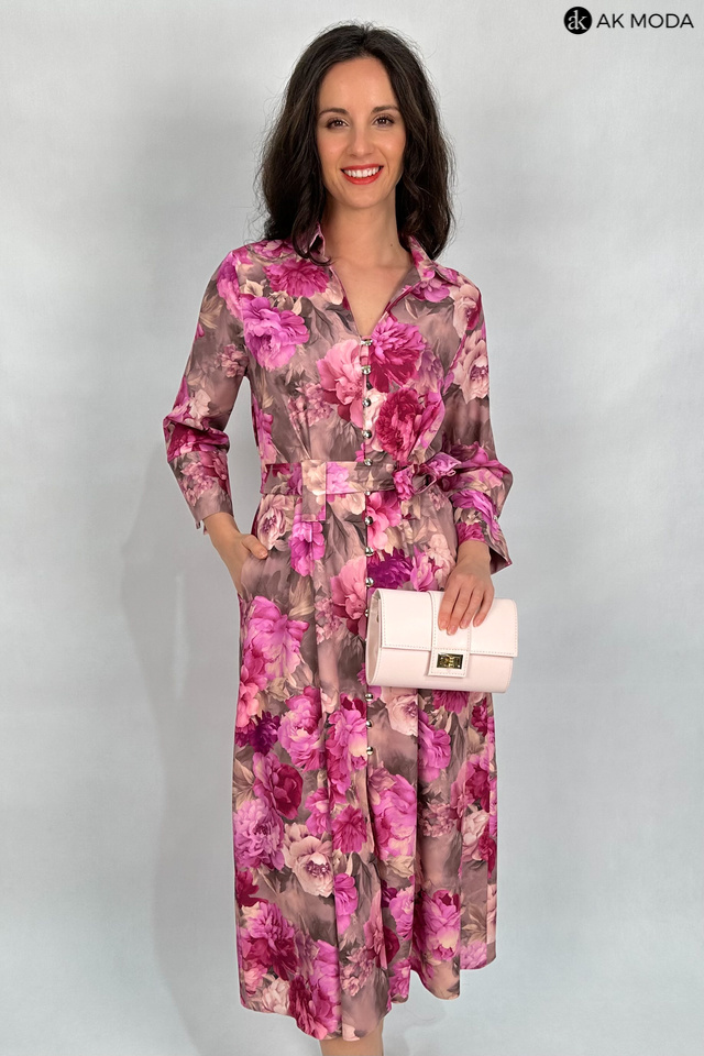 Elegancka sukienka midi z kwiatowym printem, utrzymana w różowo-beżowej kolorystyce. Rękawy 3/4 zakończone mankietami, w tali wiązany pasek. Sukienka posiada kieszenie.