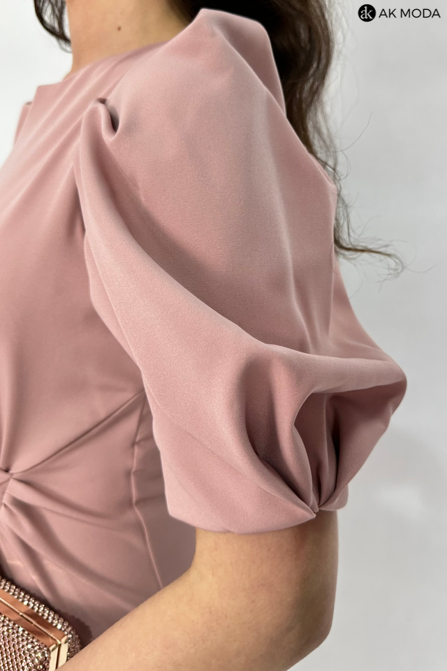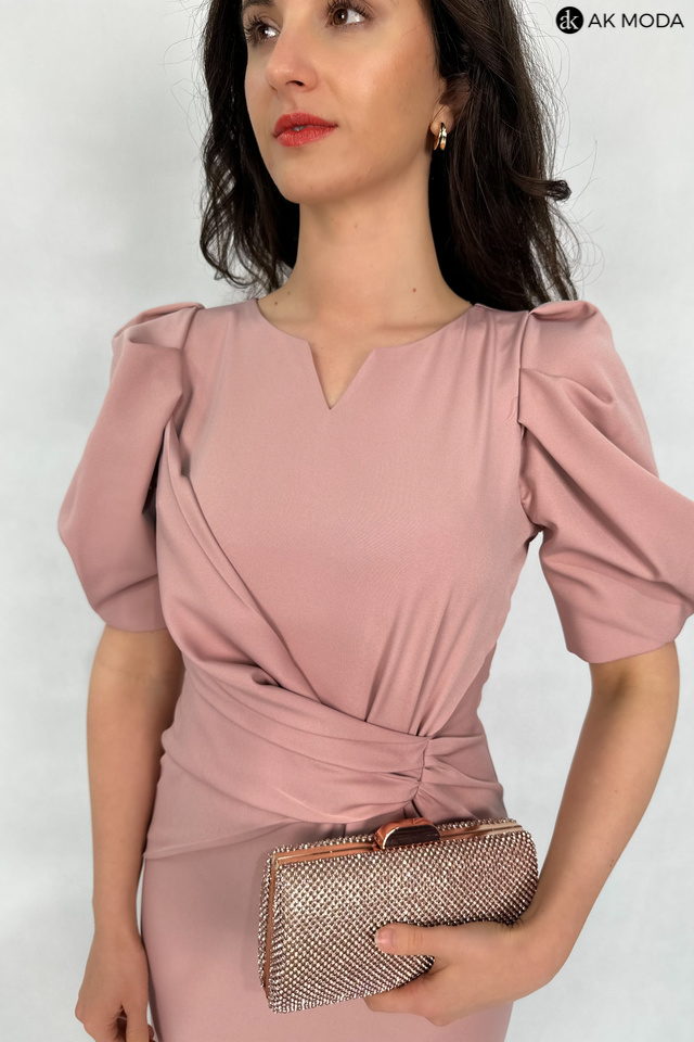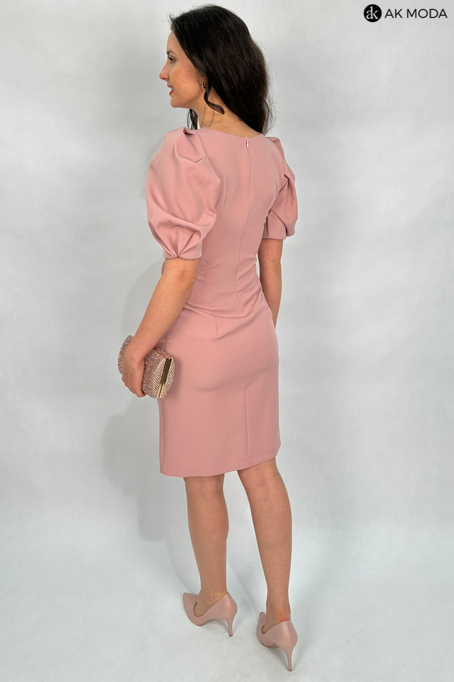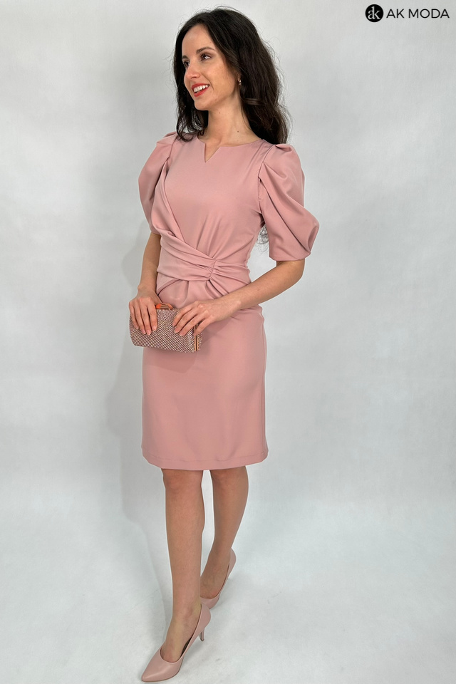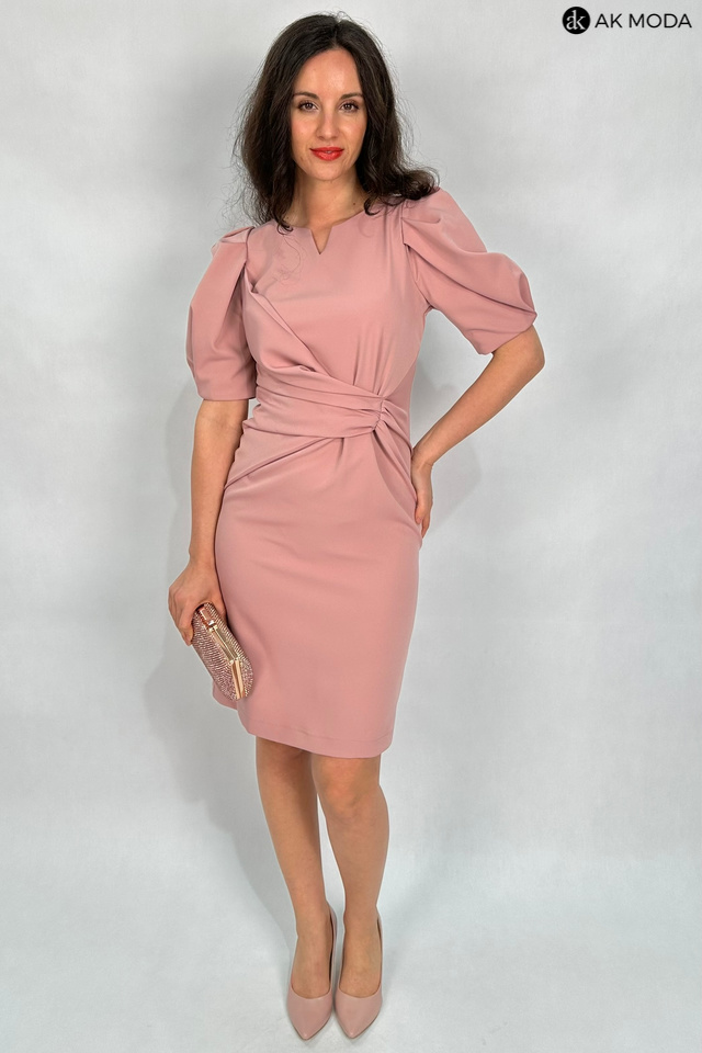 Elegancka, dopasowana sukienka w kolorze brudnego pudrowego różu. Dekolt okrągły z wycięciem, rękawy do łokcia, w talii efektownie upięty materiał.