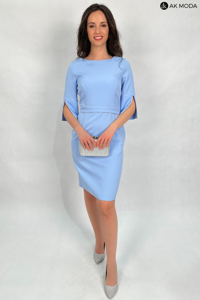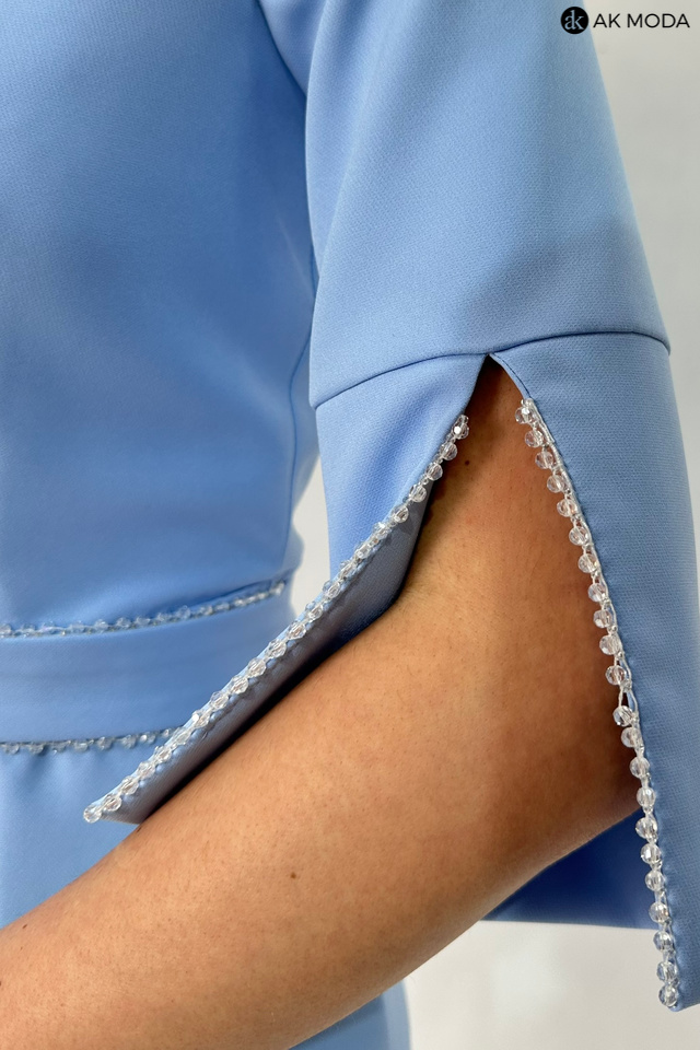 Elegancka, dopsowana sukienka w kolorze błękitnym. Dekolt okrągły, rękawy do łokcia z rozcięciem, w talii pasek. Przy rękawach i pasku ozdobne koraliki.