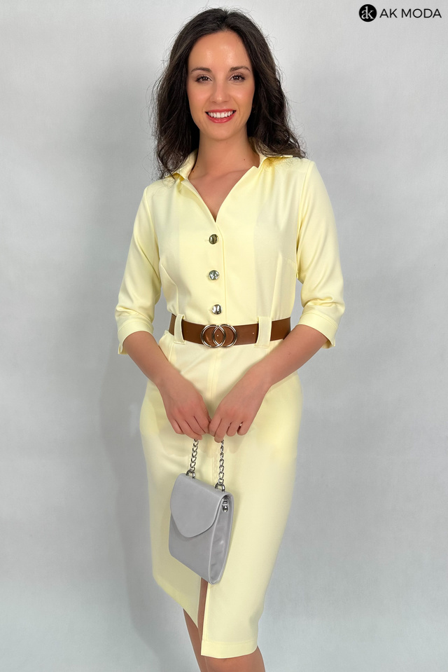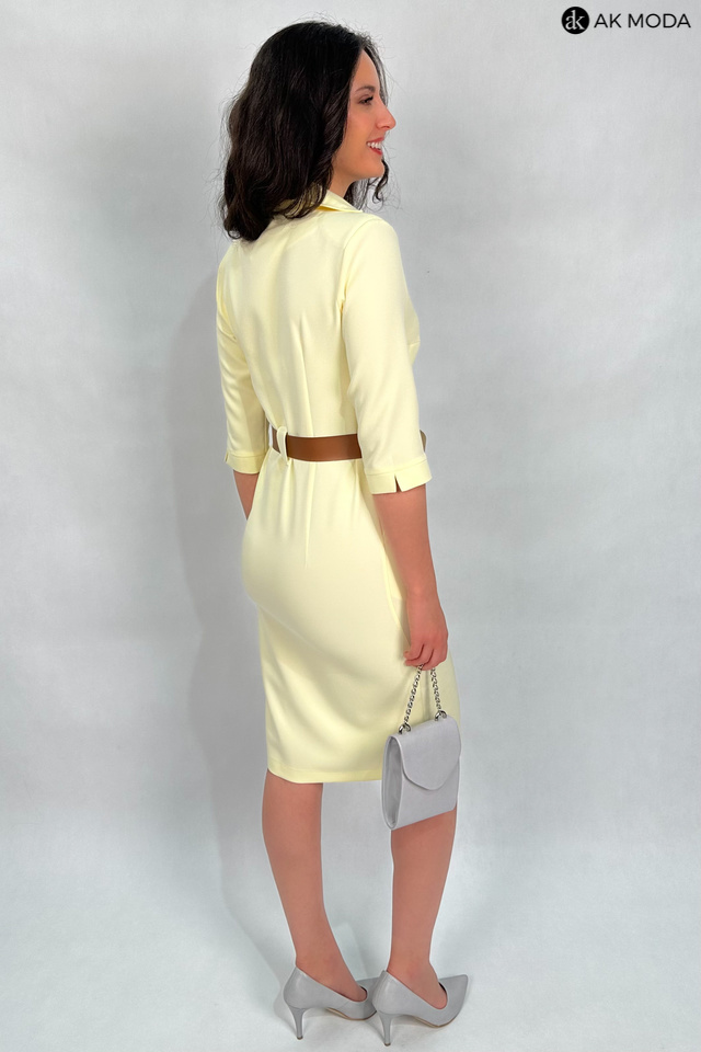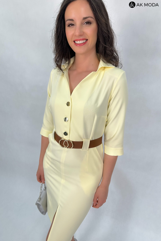 Elegancka sukienka w kolorze żółtym z kołnierzem i zapięciem na guziki. Rękawy do łokcia, w talii ozdobny pasek. Sukienka posiada kieszenie.