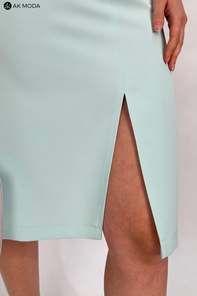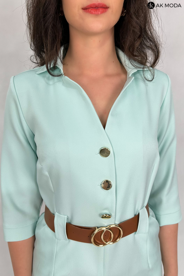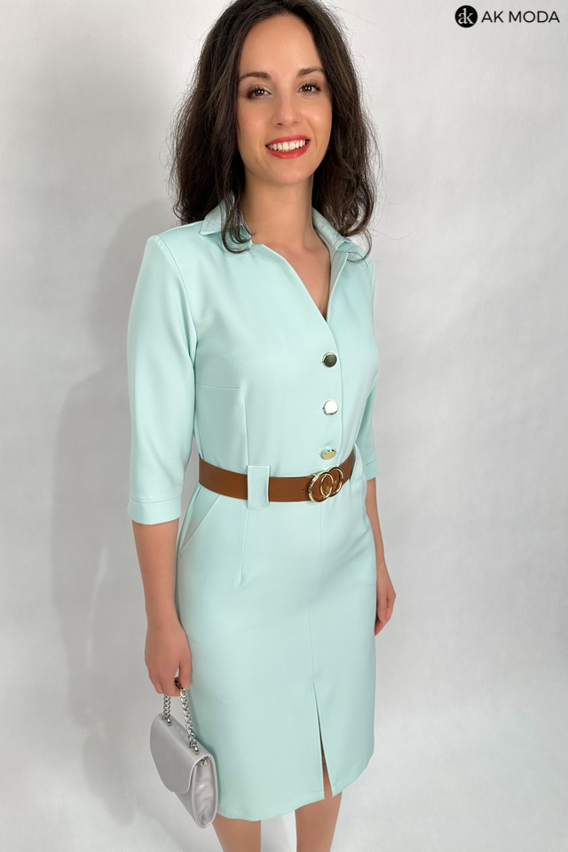 Elegancka sukienka w kolorze miętowym z kołnierzem i zapięciem na guziki. Rękawy do łokcia, w talii ozdobny pasek. Sukienka posiada kieszenie.