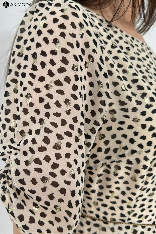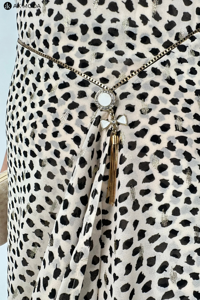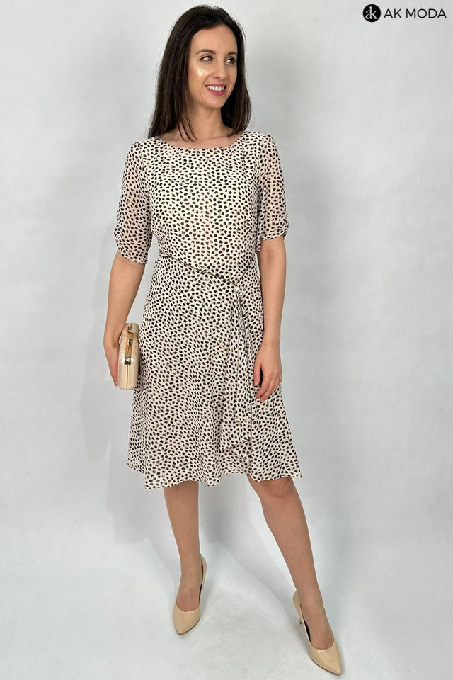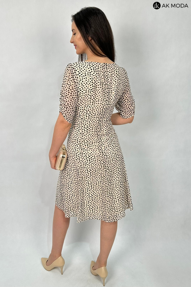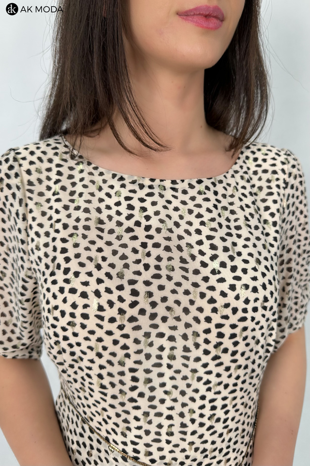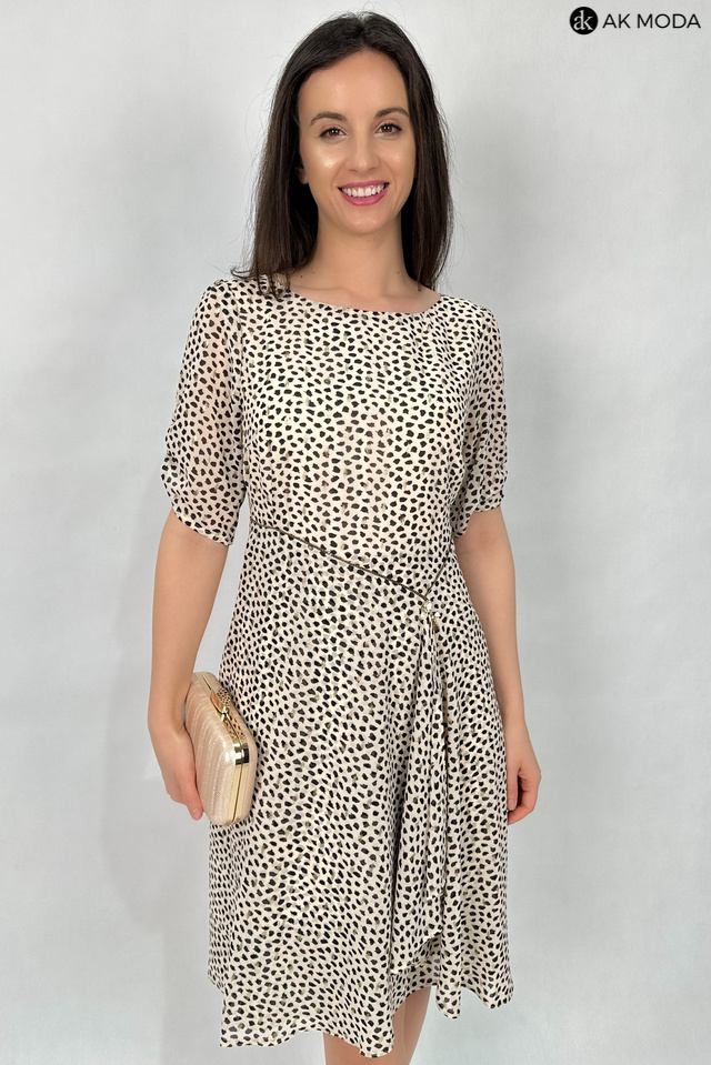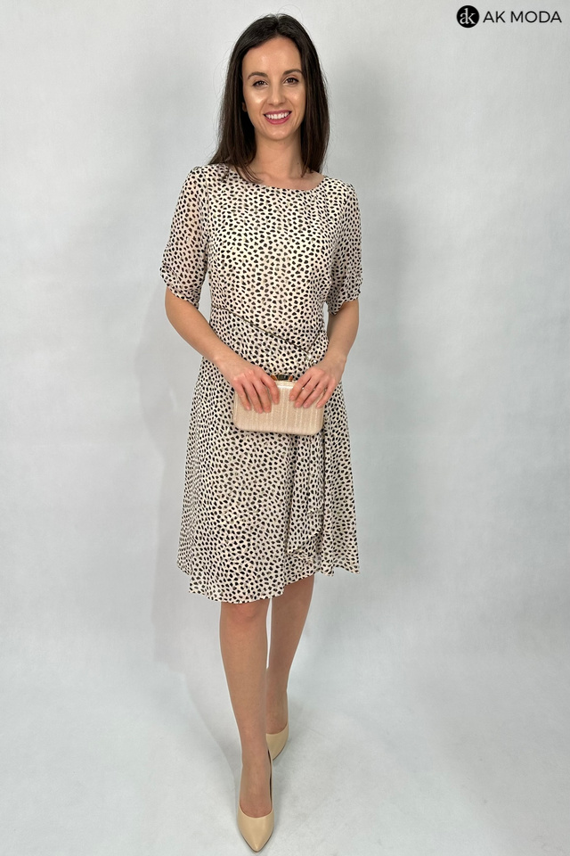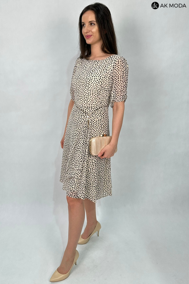 Elegancka rozkloszowana sukienka w kolorze beżowym w czarno - złote cętki. Dekolt okrągły, krótkie rękawy z marszczeniem, w talii ozdobny łańcuszek.