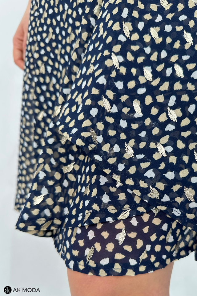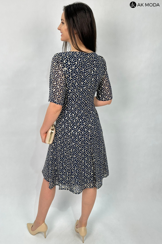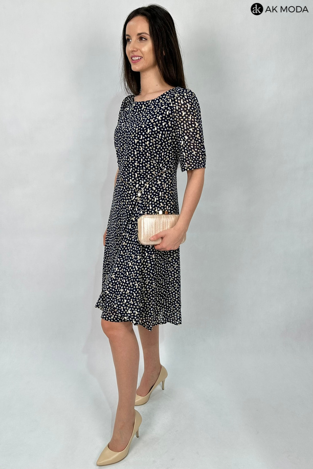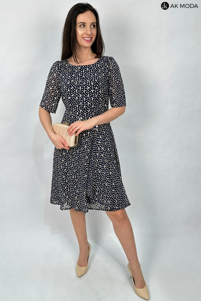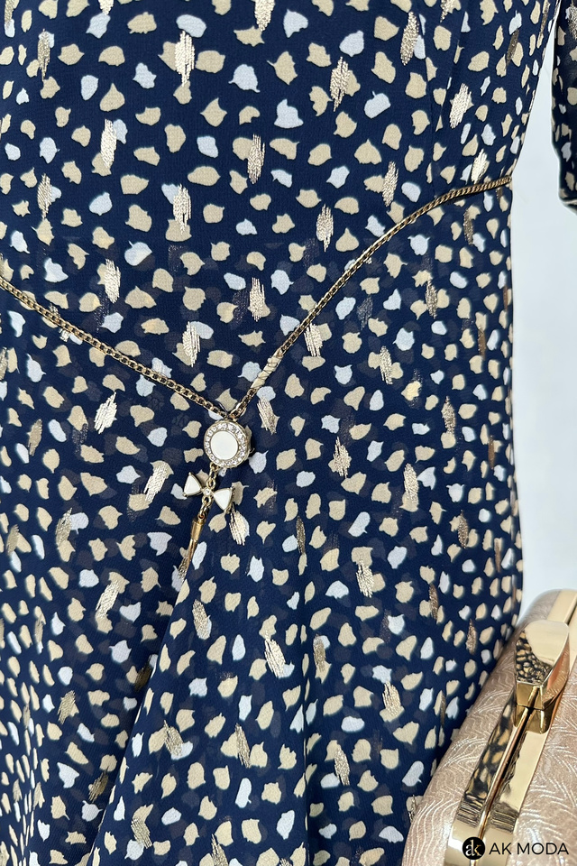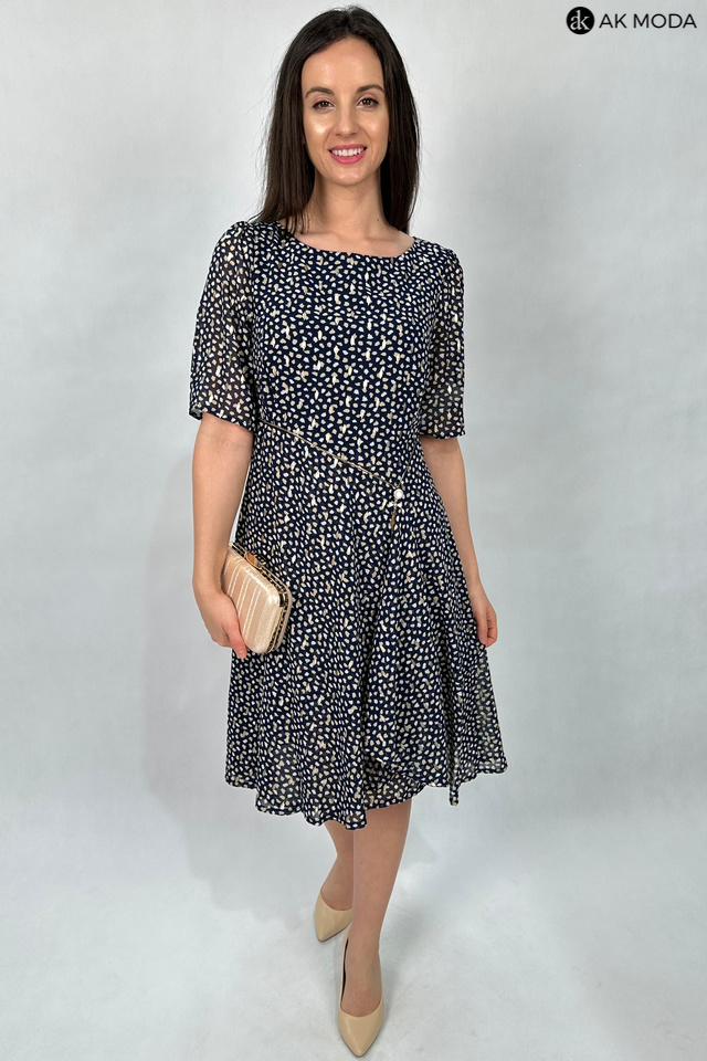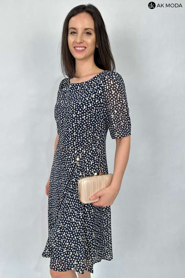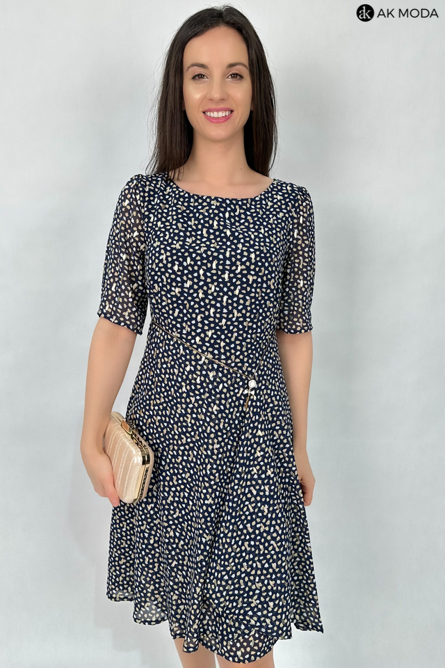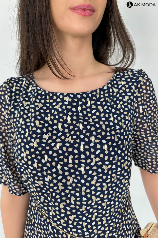 Elegancka rozkloszowana sukienka w kolorze granatowym w beżowo - złote cętki. Dekolt okrągły, krótkie rękawy, w talii ozdobny łańcuszek.