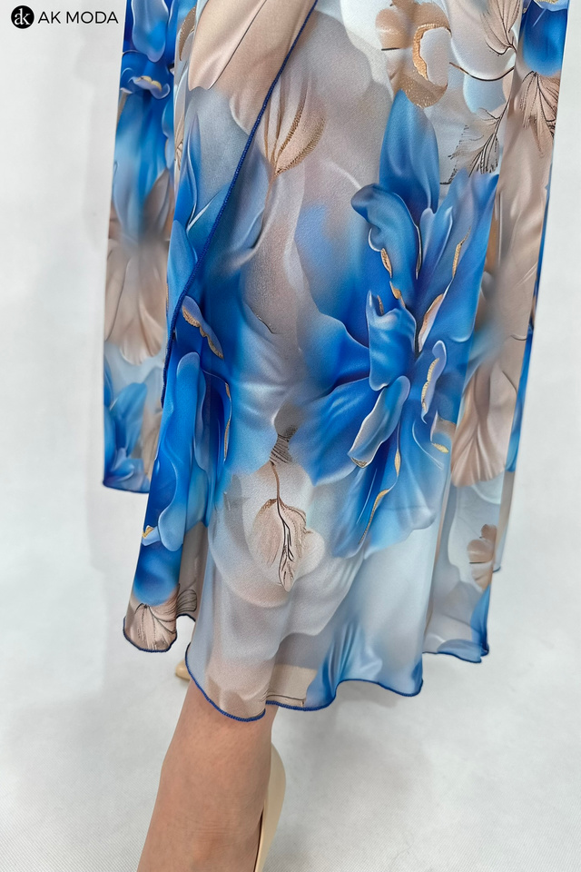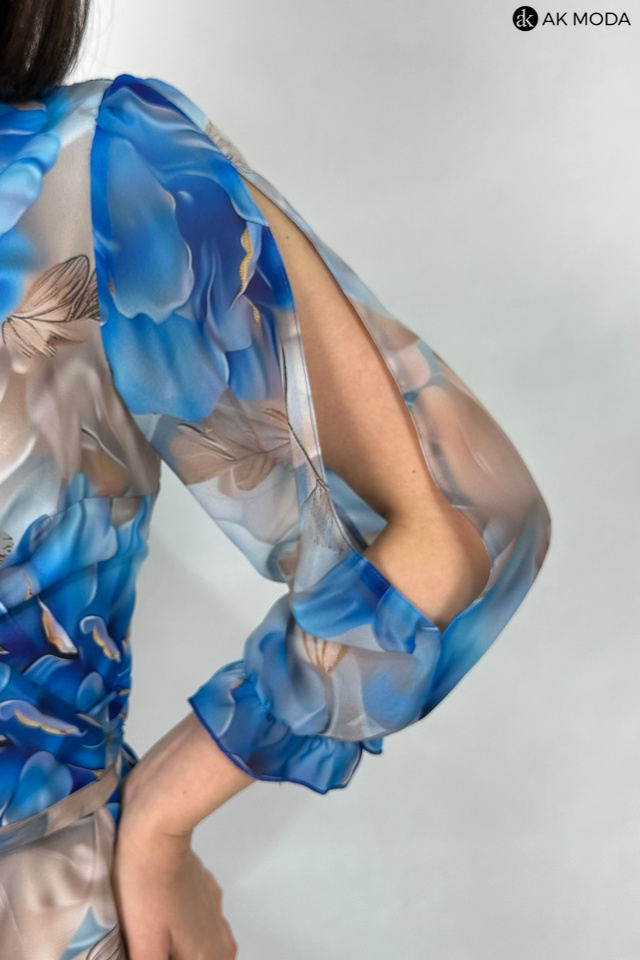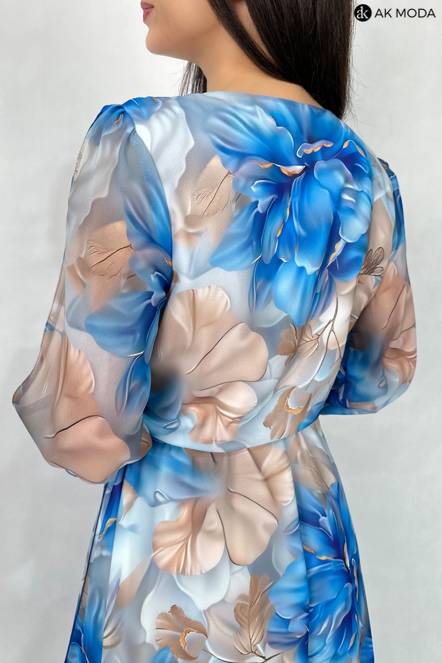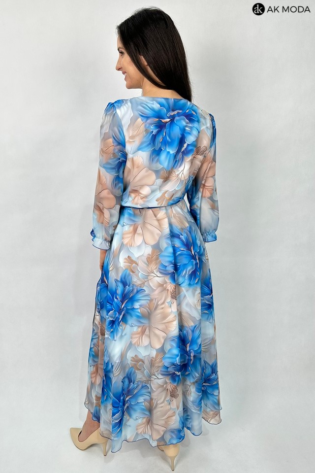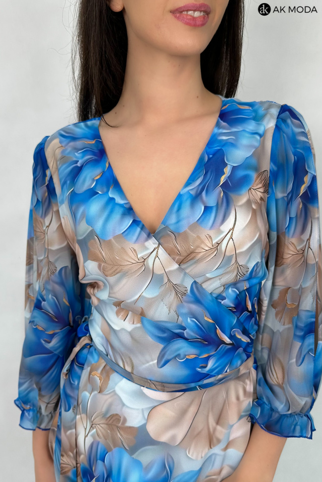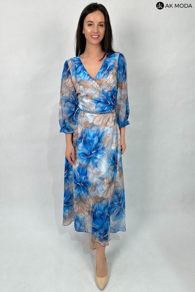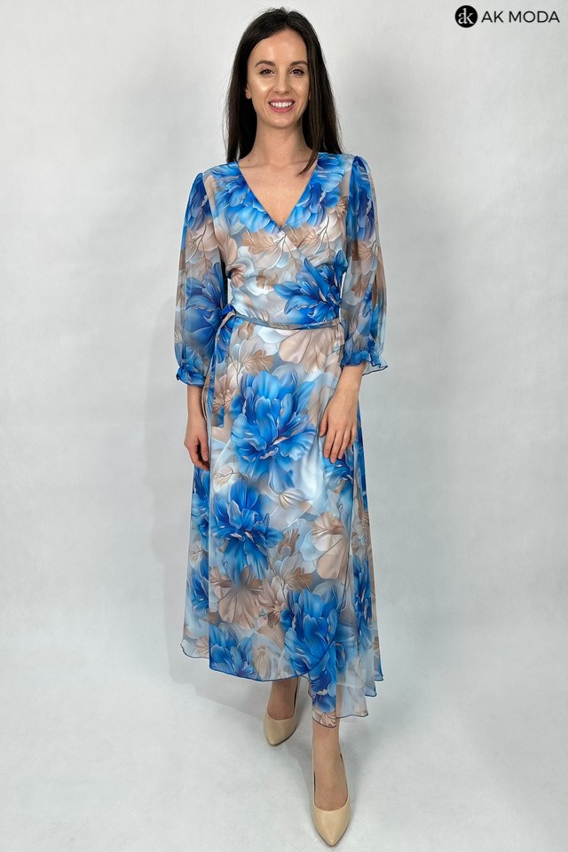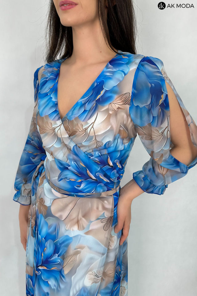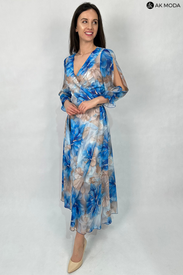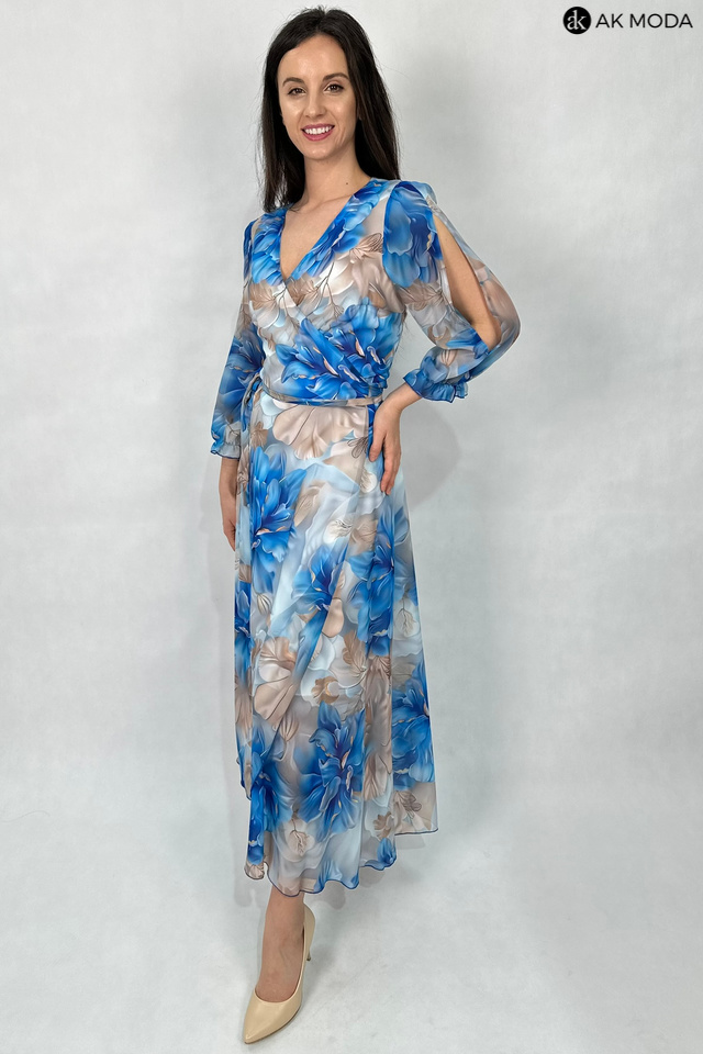 Długa, rozkloszowana sukienka z kwiatowym printem w odcieniach błękitu i beżu. Transparentne rękawy 3/4 z rozcięciem, zakończone gumką, fason kopertowy - dopasowuje się do sylwetki.