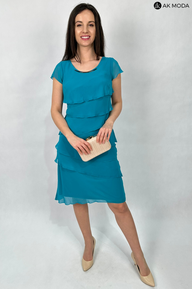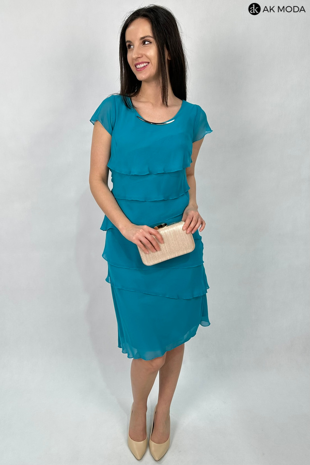Elegancka sukienka w kolorze turkusowym, uszyta z asymetrycznie układających się warst tiulu. Dekolt okrągły, krótkie rękawki w formie motylków.