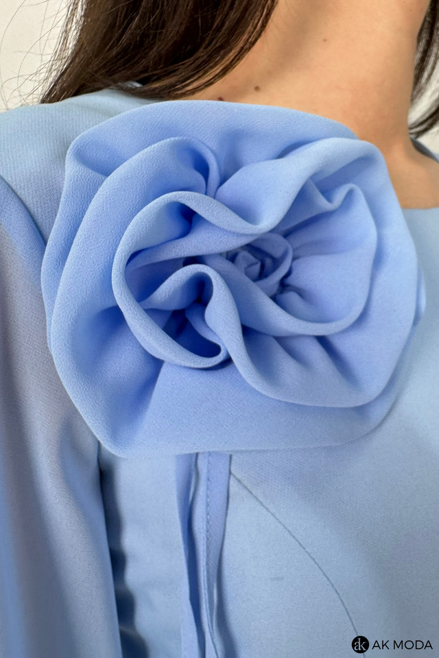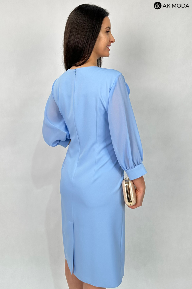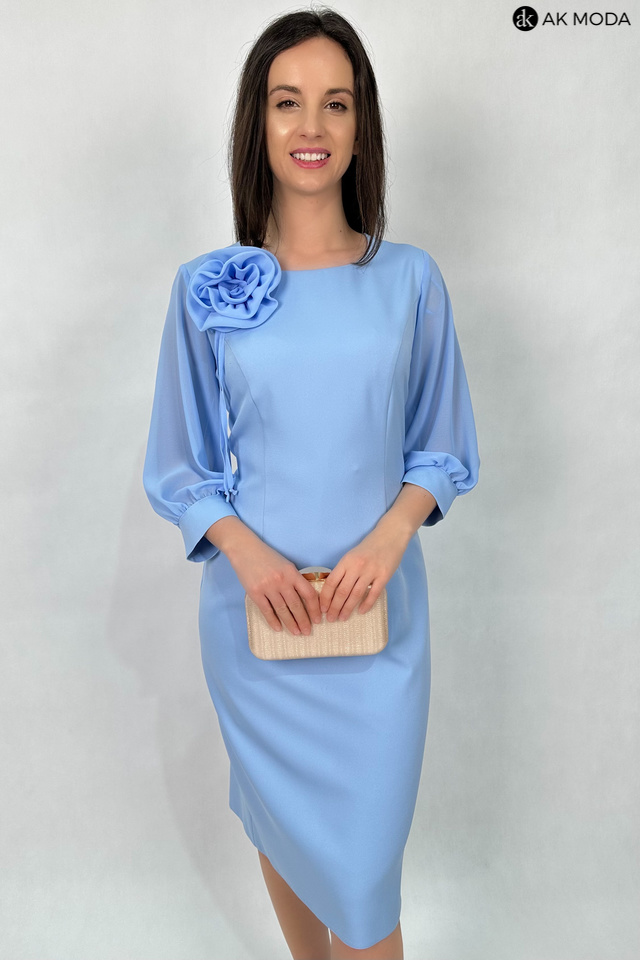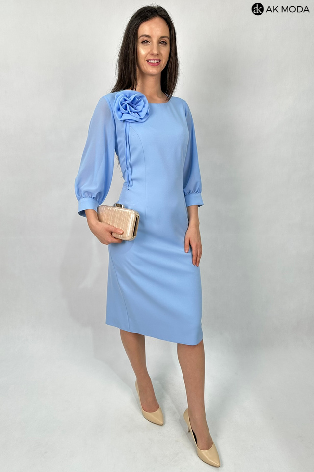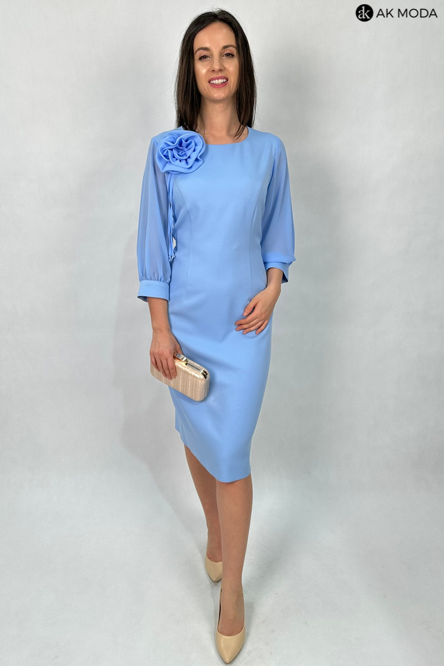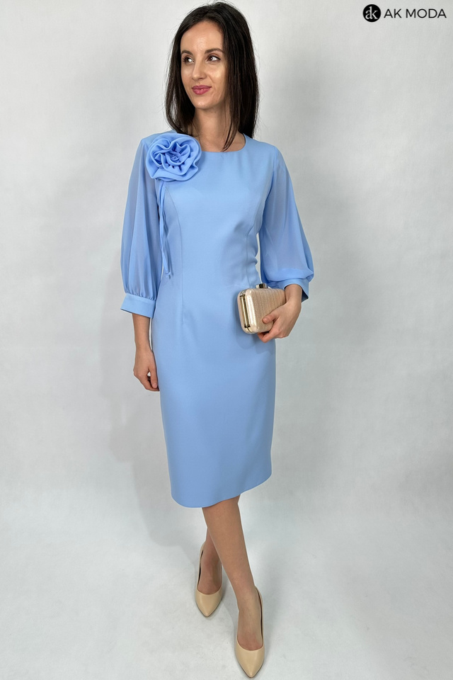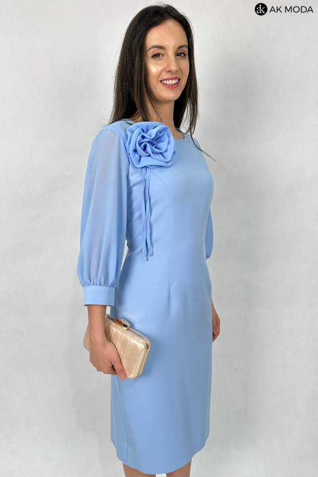 Elegancka, dopasowana sukienka w kolorze niebieskim. Dekolt okrągły, transparentne rękawy do łokcia, w zestawie odpinany ozdobny kwiatek.