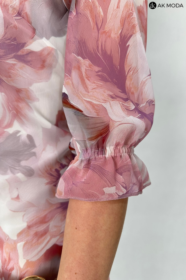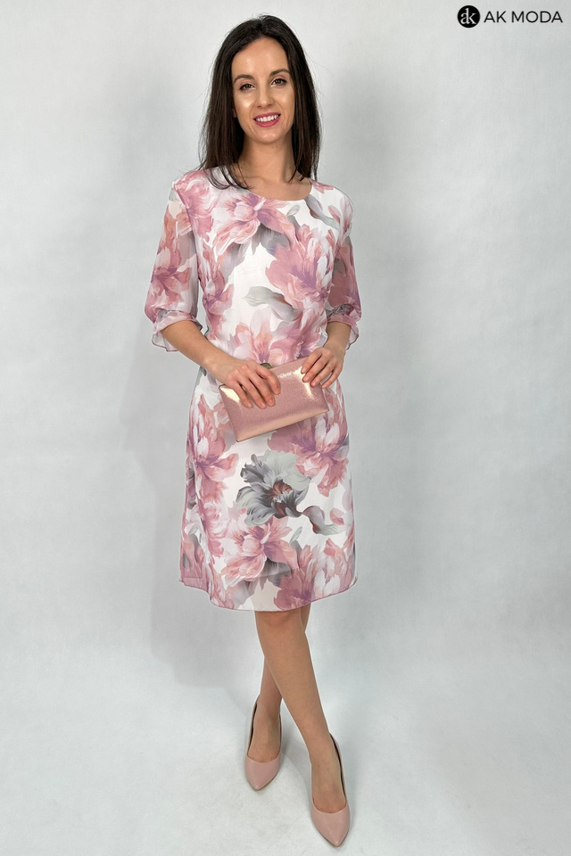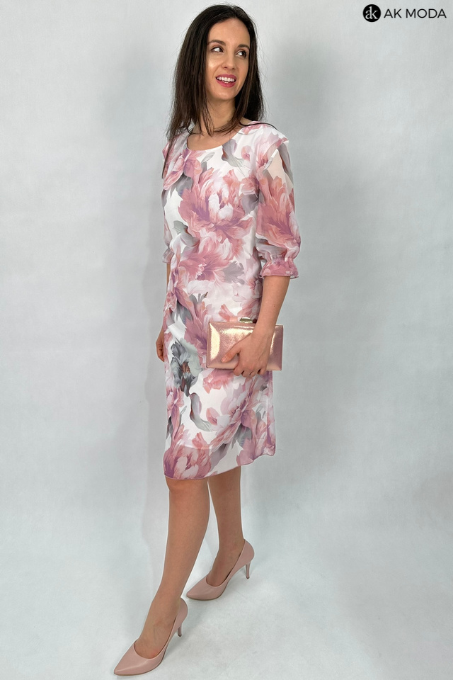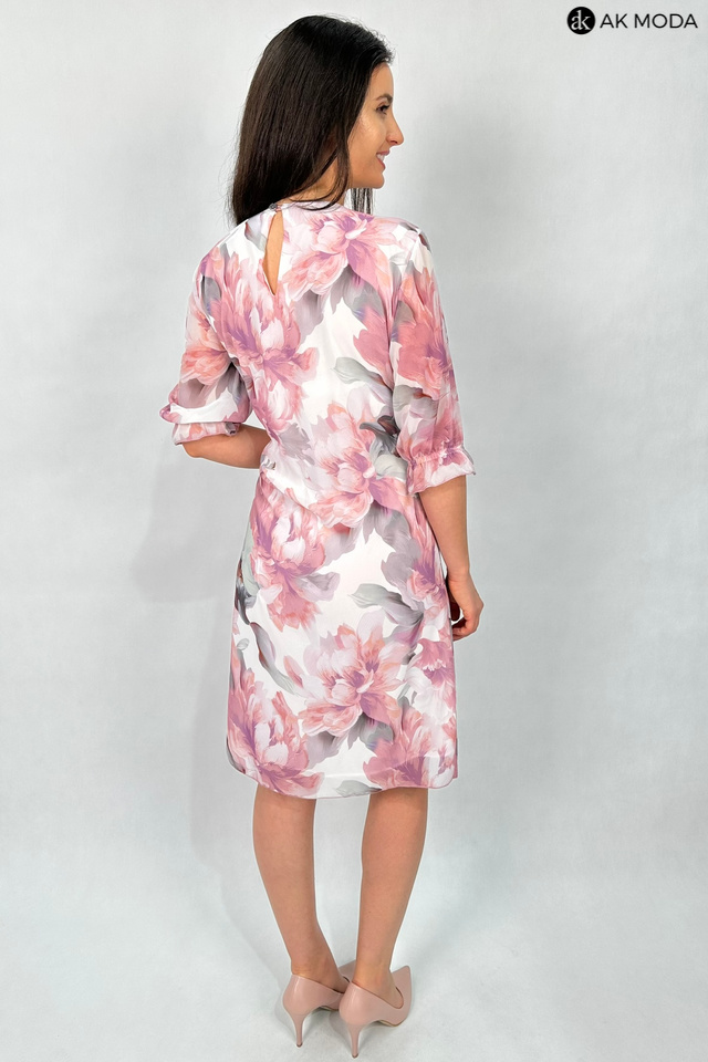 Elegancka, trapezowa sukienka w kolorze śmietankowym z kwiatowym printem. Dekolt okrągły, transparentne rękawy do łokcia, zakończone gumką.