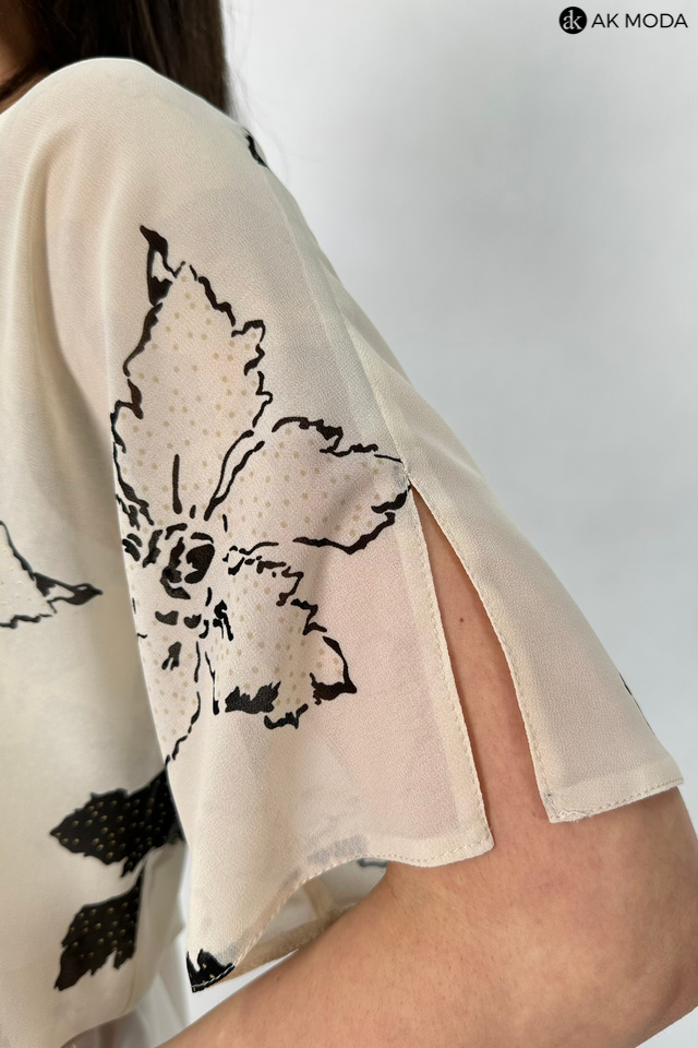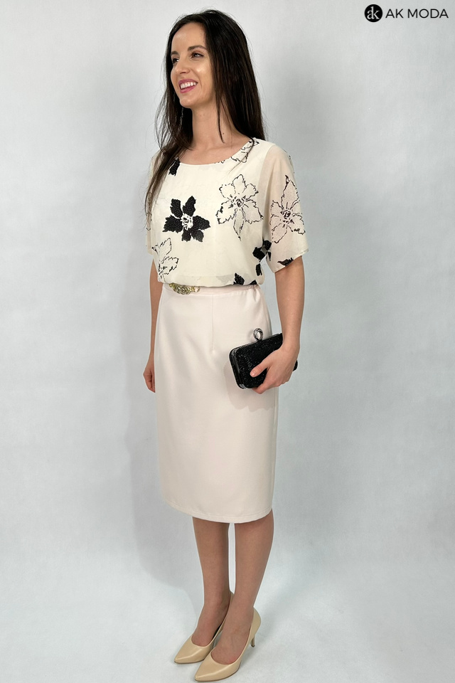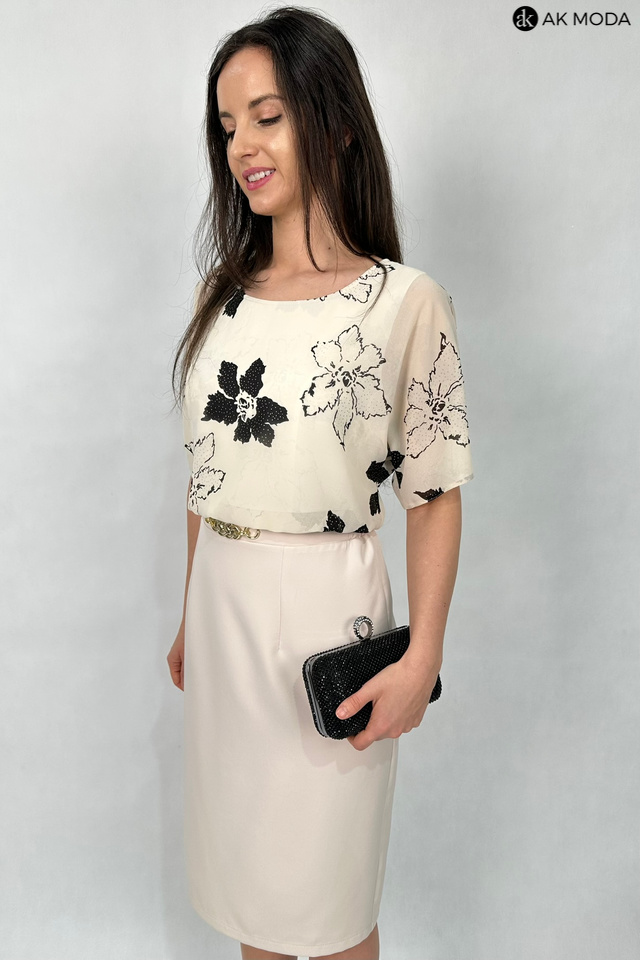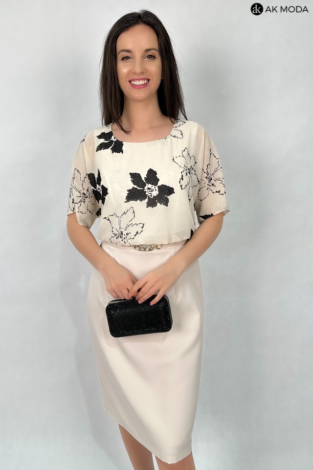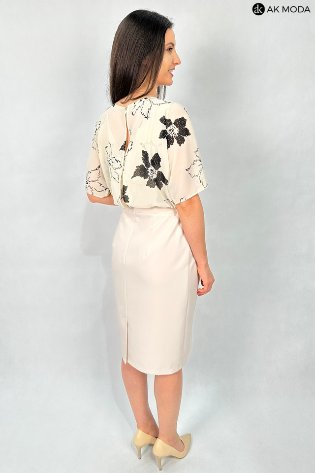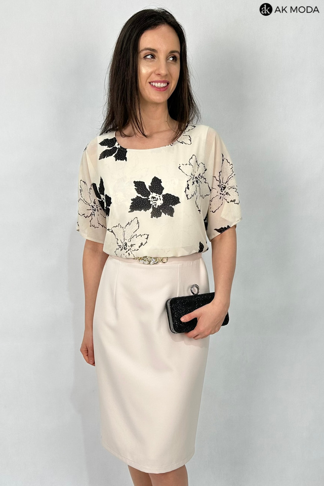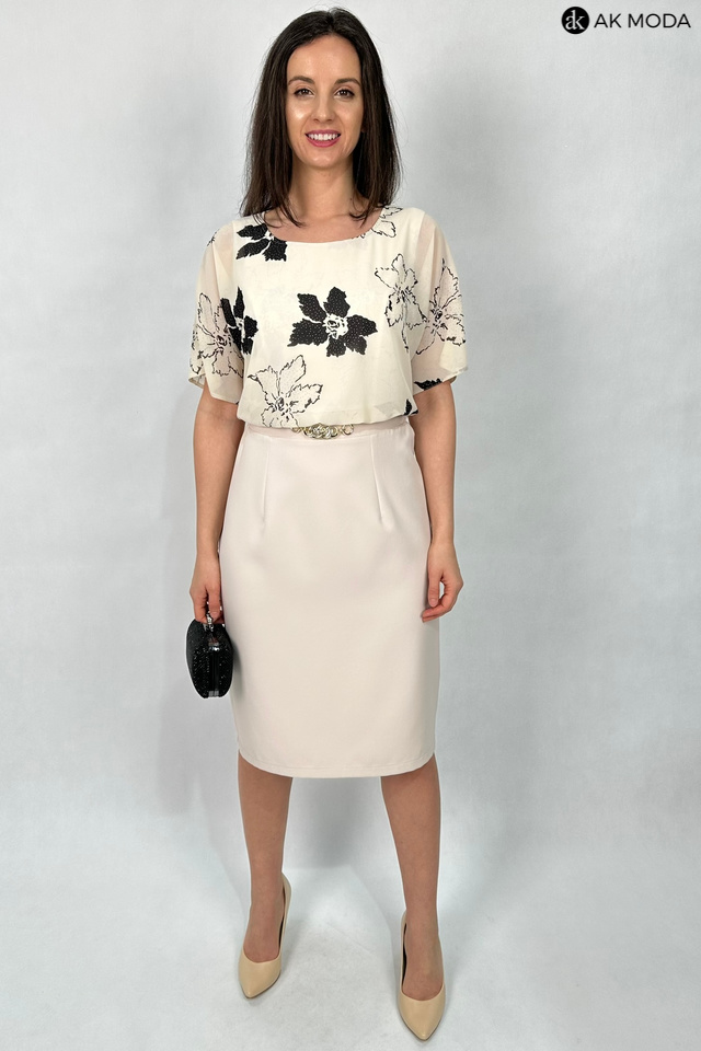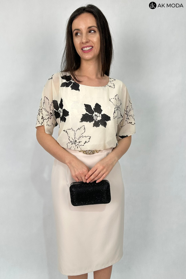 Elegancka sukienka w kolorze beżowym z okrągłym dekoltem i kimonowymi, krótkimi rękawami. Góra luźniejsza, z kwiatowym printem w kolorze czerni i złota, dół gładki, dopasowany, w talii po bokach gumki.
