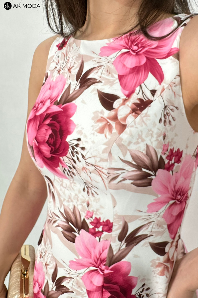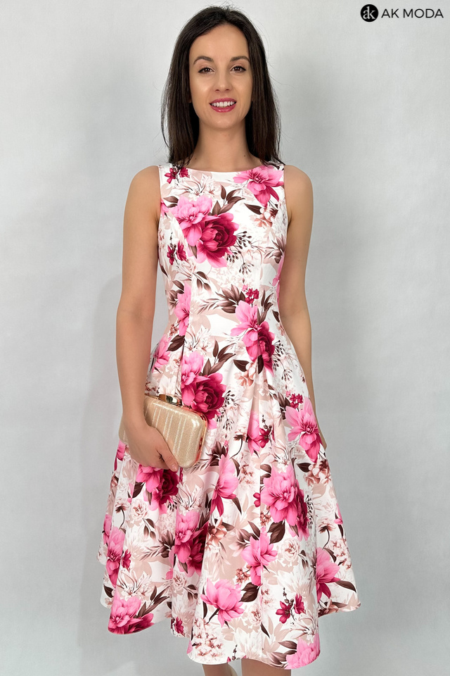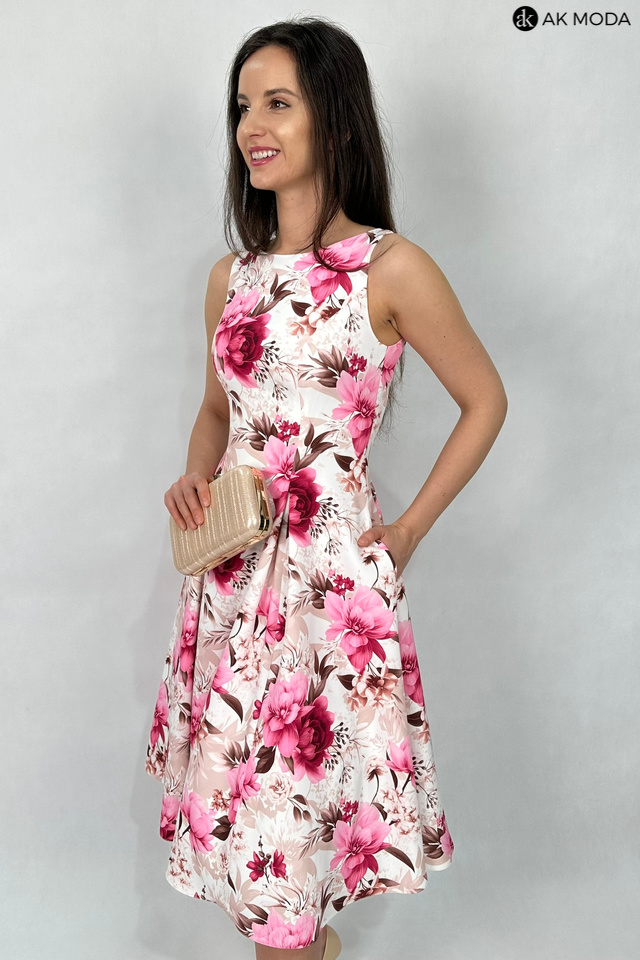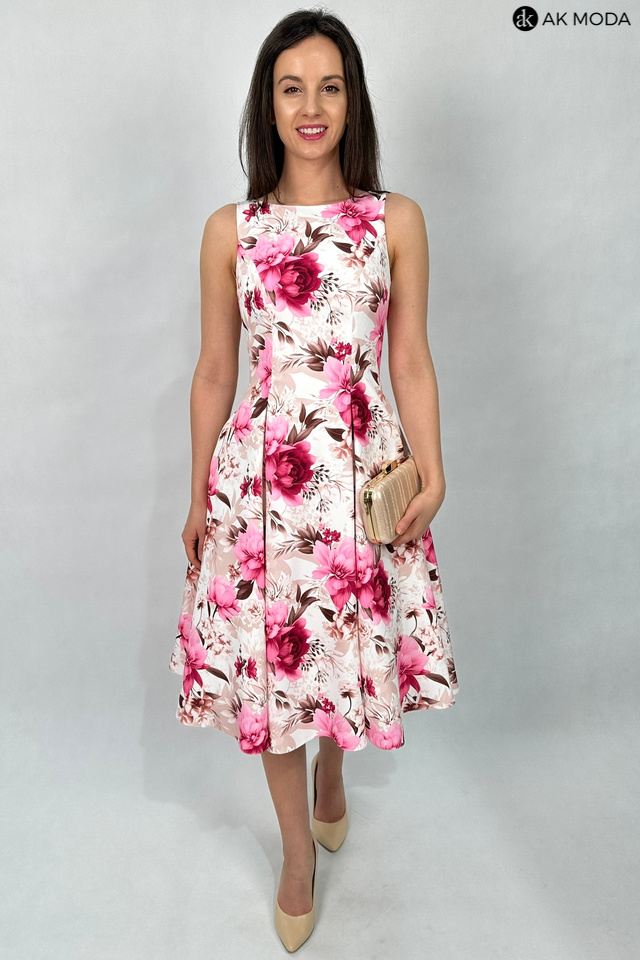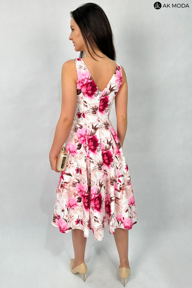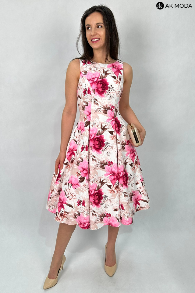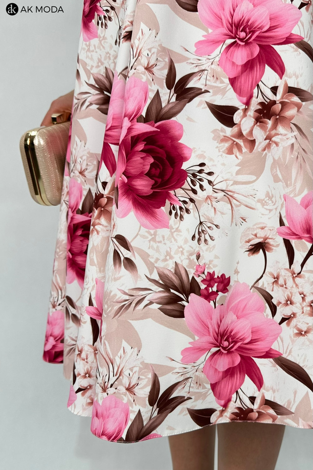 Elegancka sukienka midi w kolorze śmietankowym z kwiatowym printem. Dekolt okrągły, na plecach wycięcie w serek. Fason rozkloszowany z usztywnionym dołem i kieszeniami.