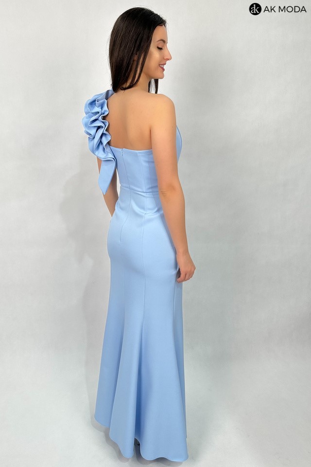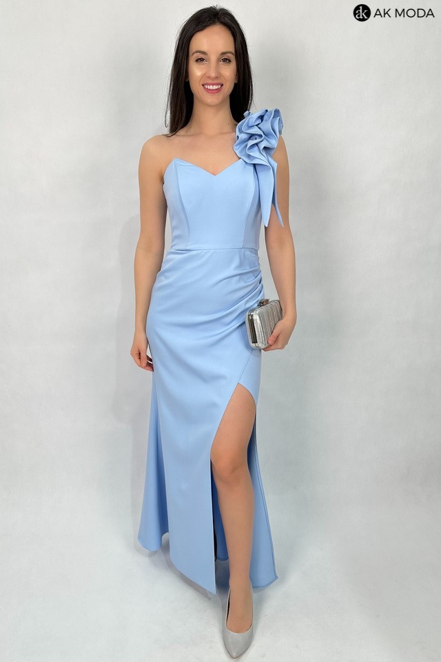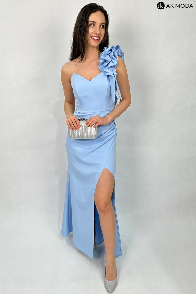 Elegancka, długa sukienka w kolorze błękitnym, na jedno ramię z efektownie upiętym materiałem. Dekolt w kształcie serca, rozcięcie na nodze, na biuście i po bokach wszyte fiszbiny.
