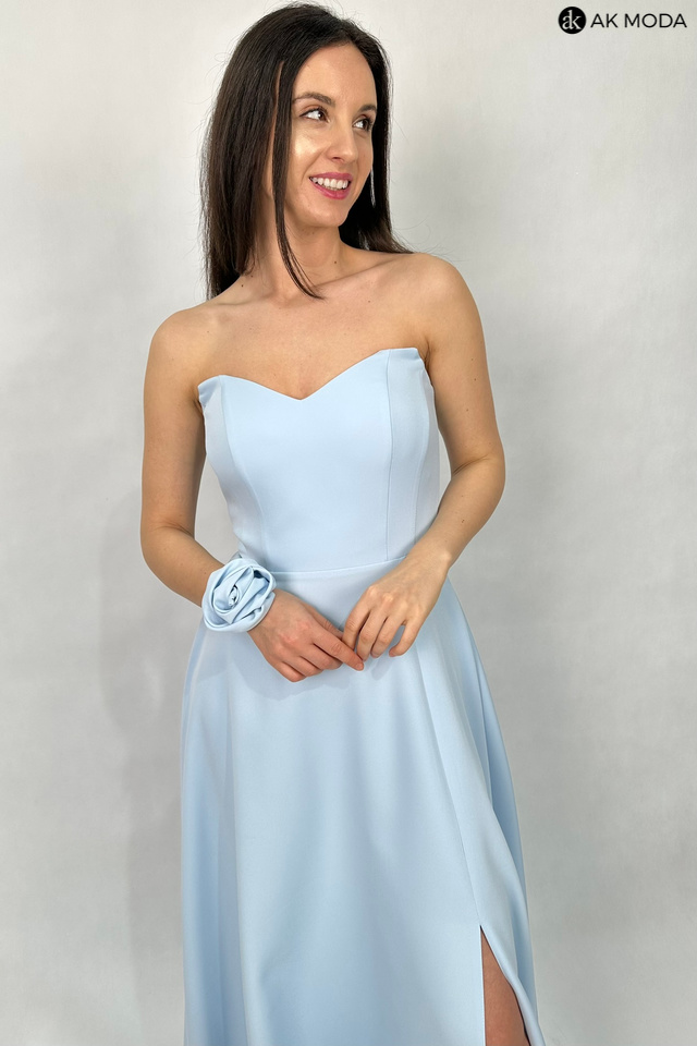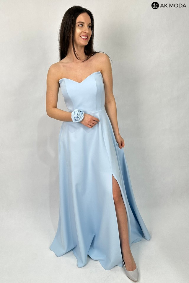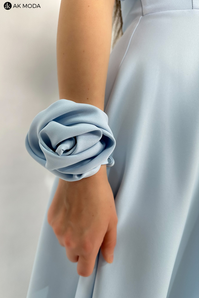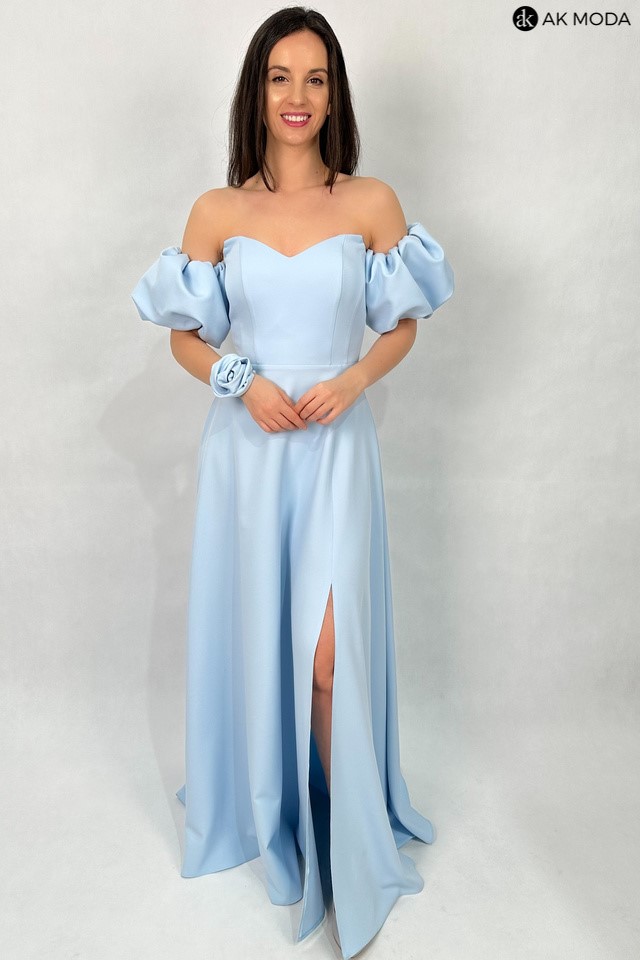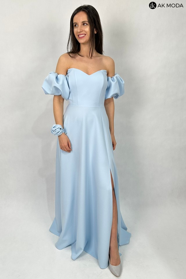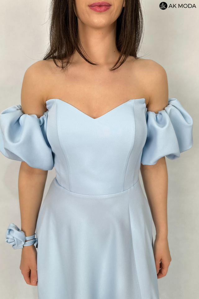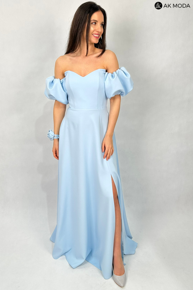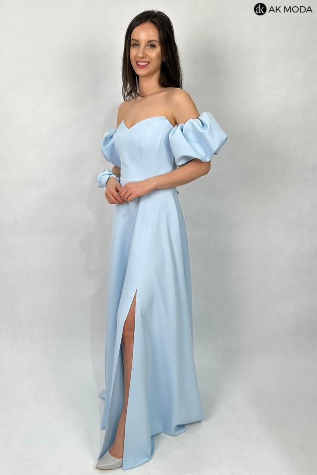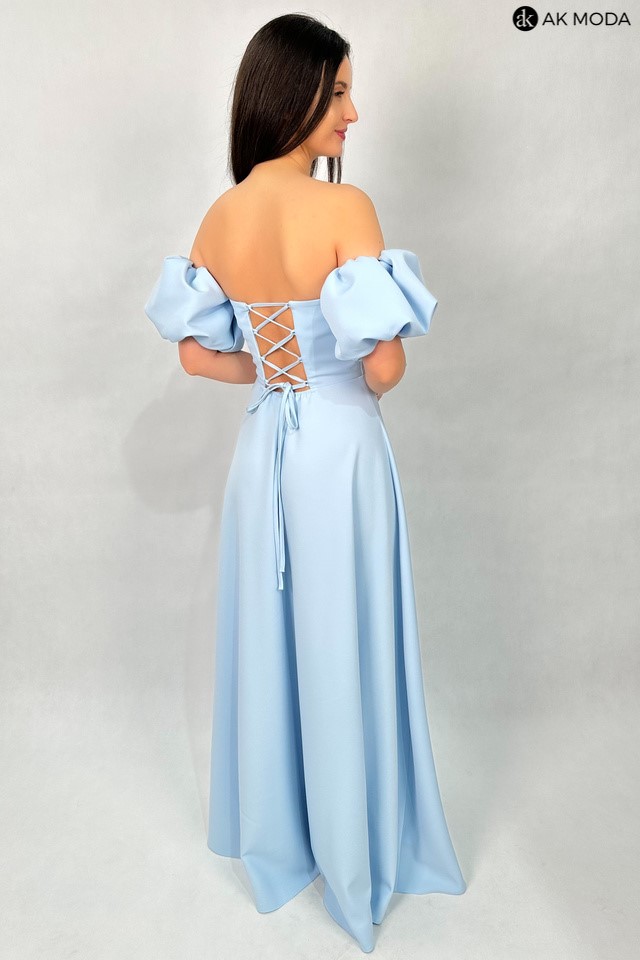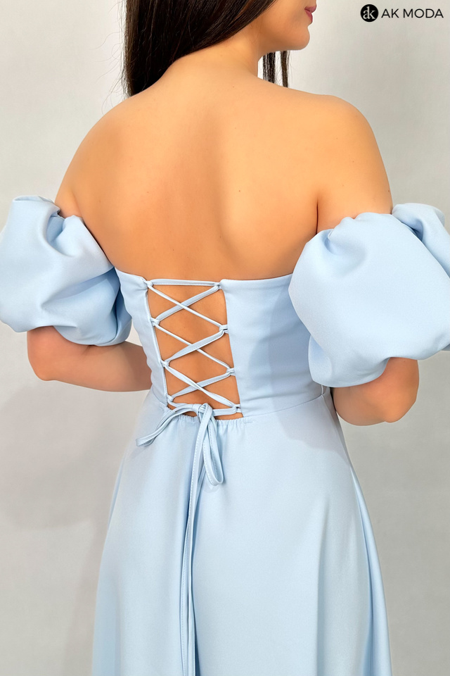 Rozkloszowana sukienka maxi w kolorze błękitnym, z efektownym sznurowaniem na plecach i gumką w talii. W zestawie osobne bufiaste rękawki. Sukienka posiada wszyte fiszbiny.