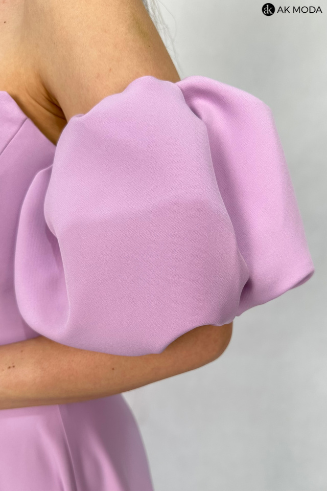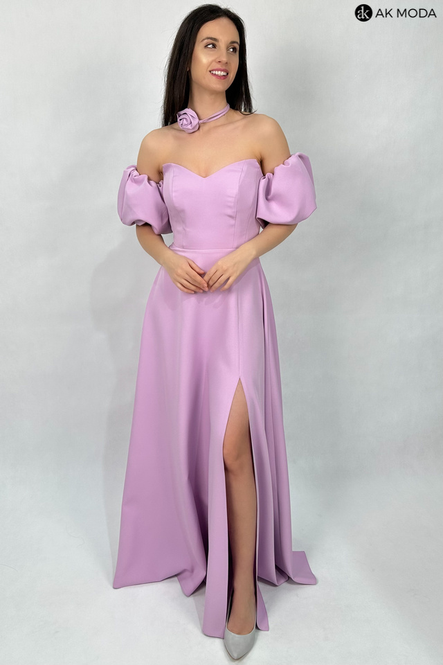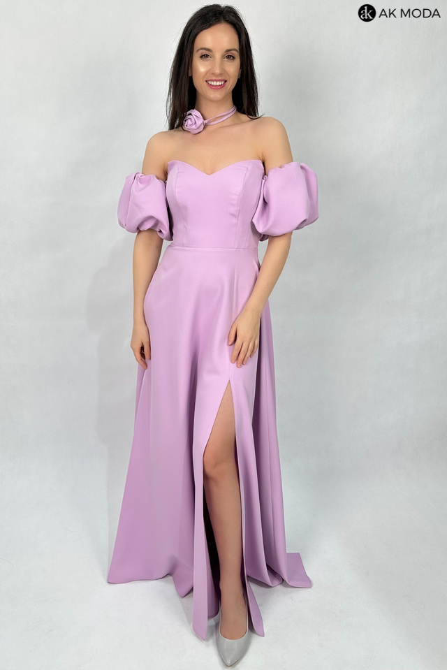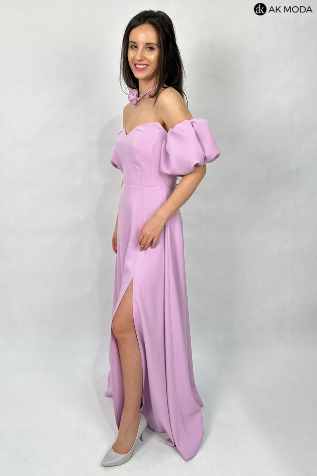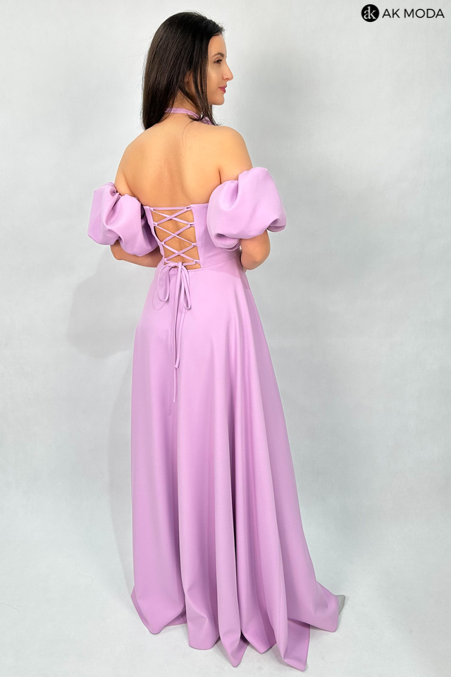 Rozkloszowana sukienka maxi w kolorze liliowym, z efektownym sznurowaniem na plecach i gumką w talii. W zestawie osobne bufiaste rękawki. Sukienka posiada wszyte fiszbiny.