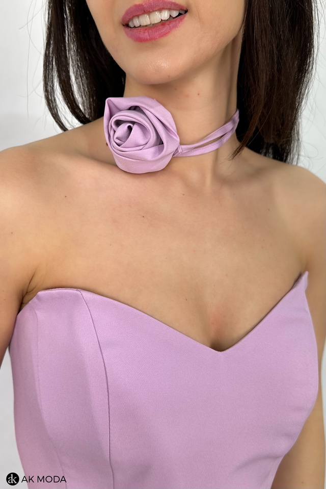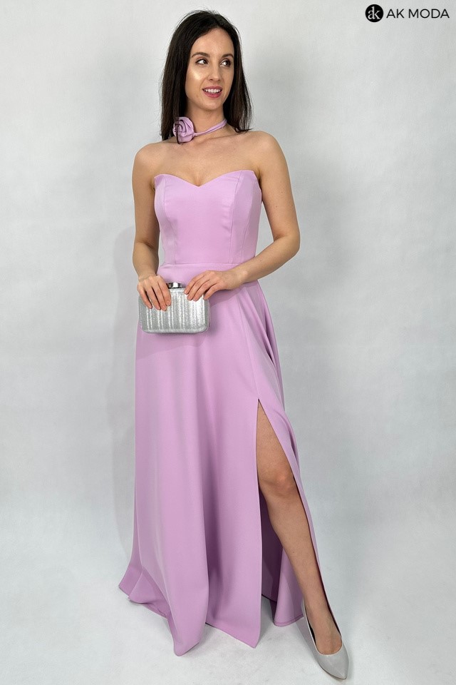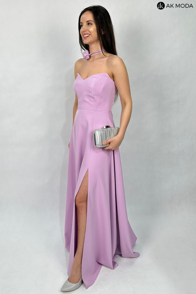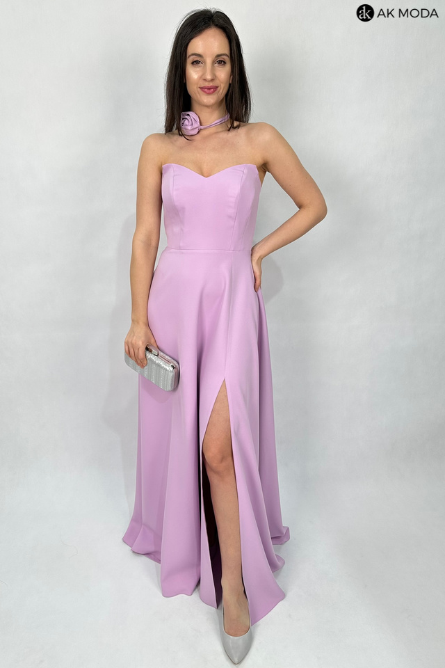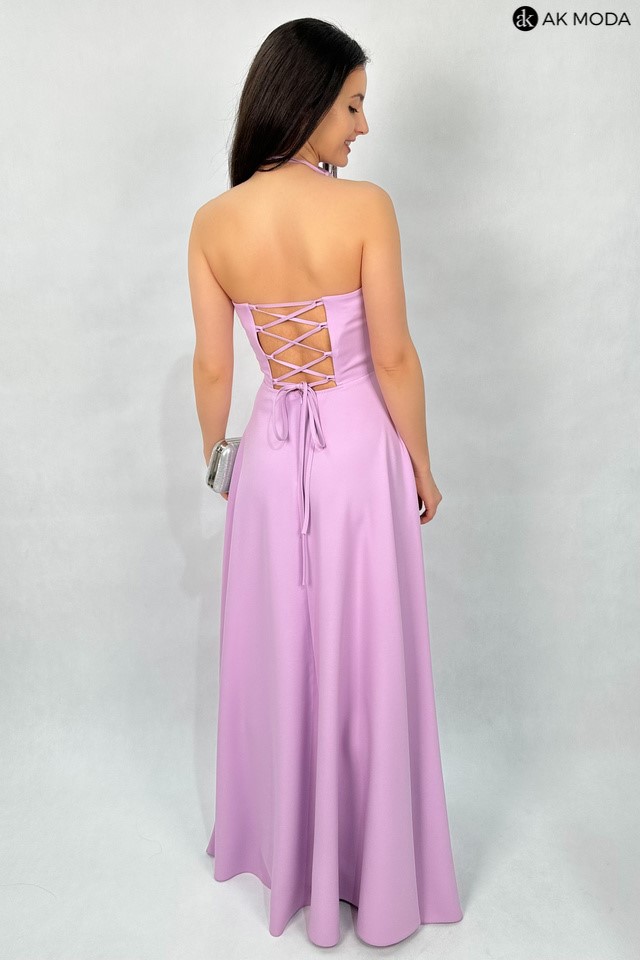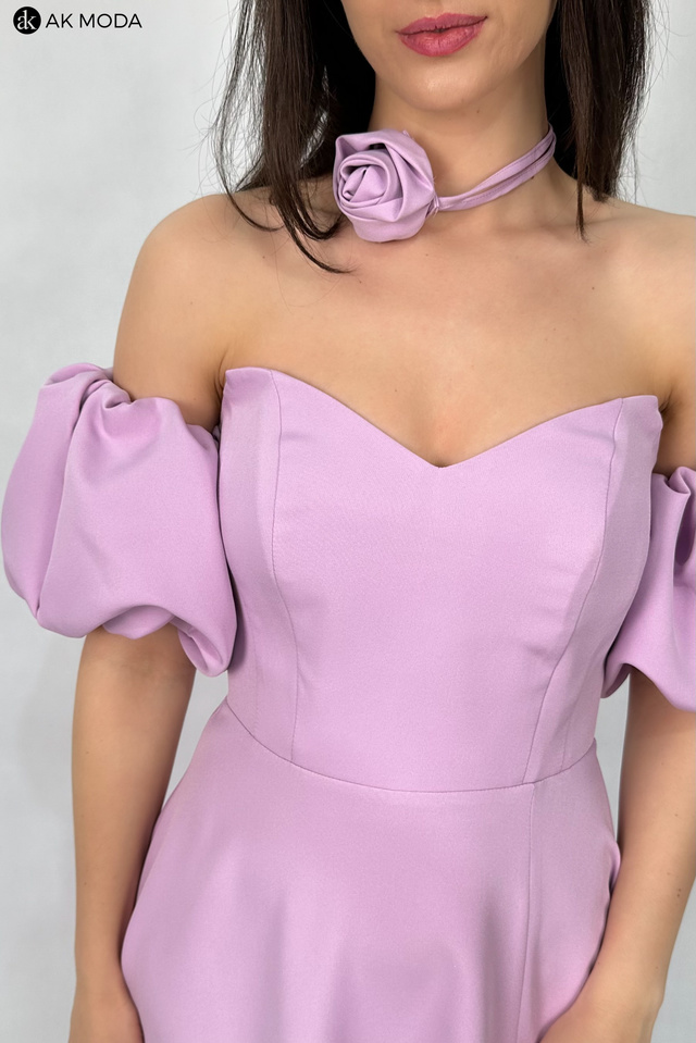 Rozkloszowana sukienka maxi w kolorze liliowym, z efektownym sznurowaniem na plecach i gumką w talii. W zestawie osobne bufiaste rękawki. Sukienka posiada wszyte fiszbiny.