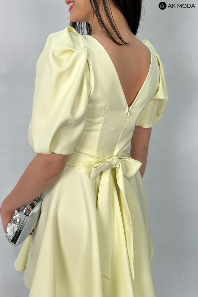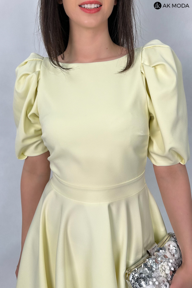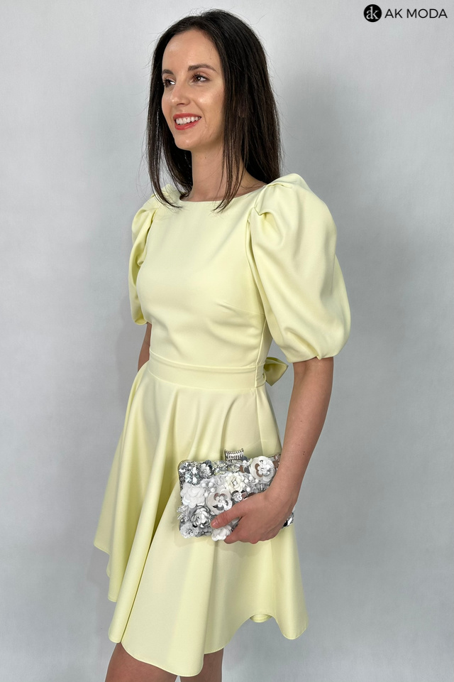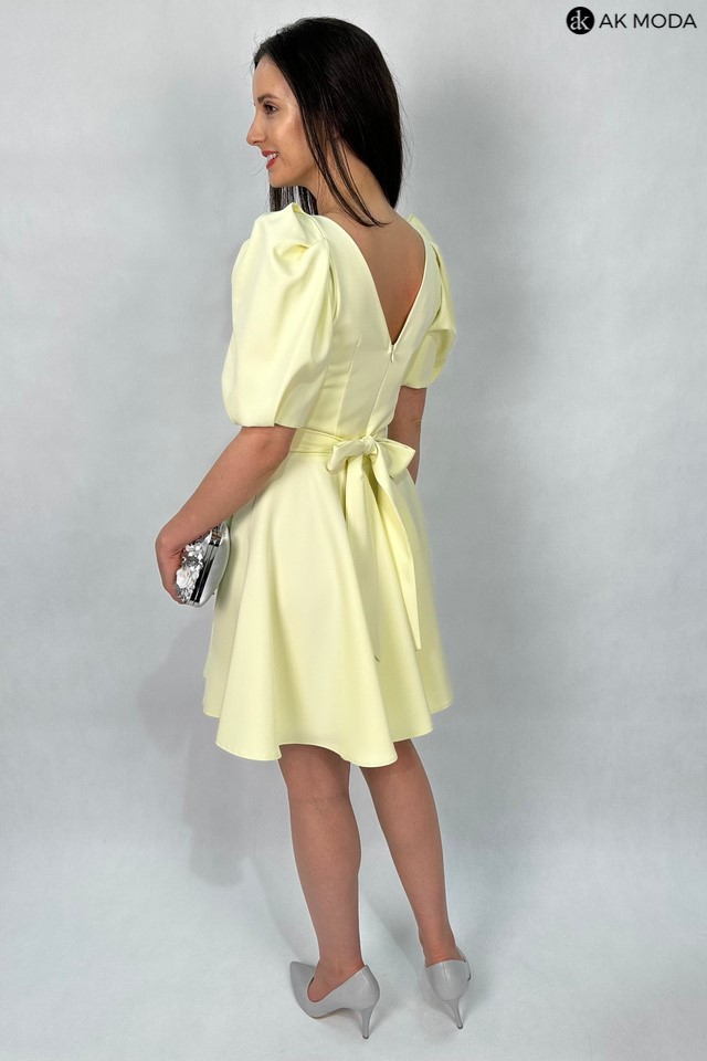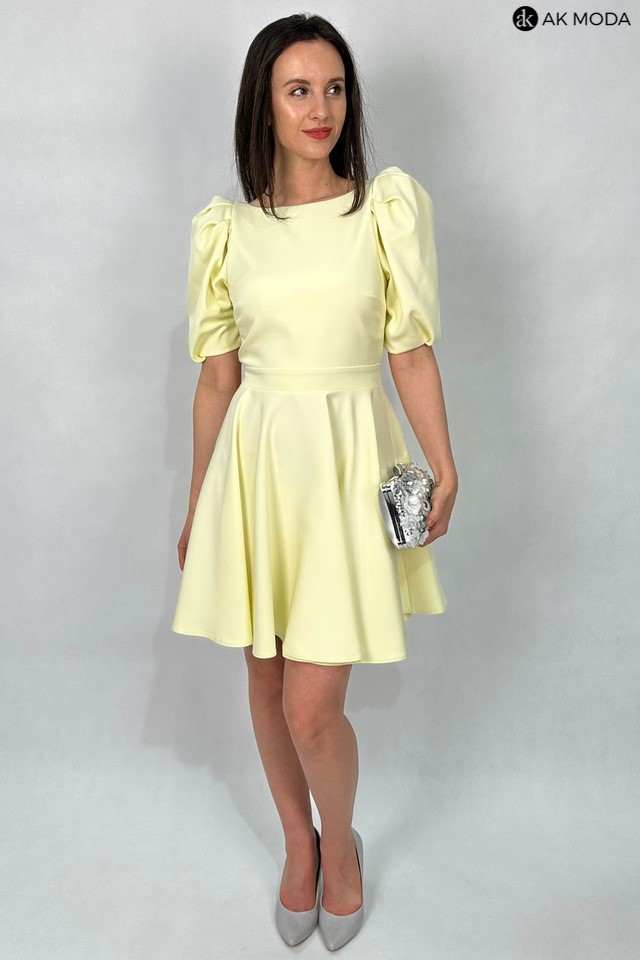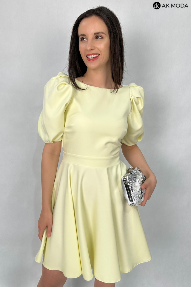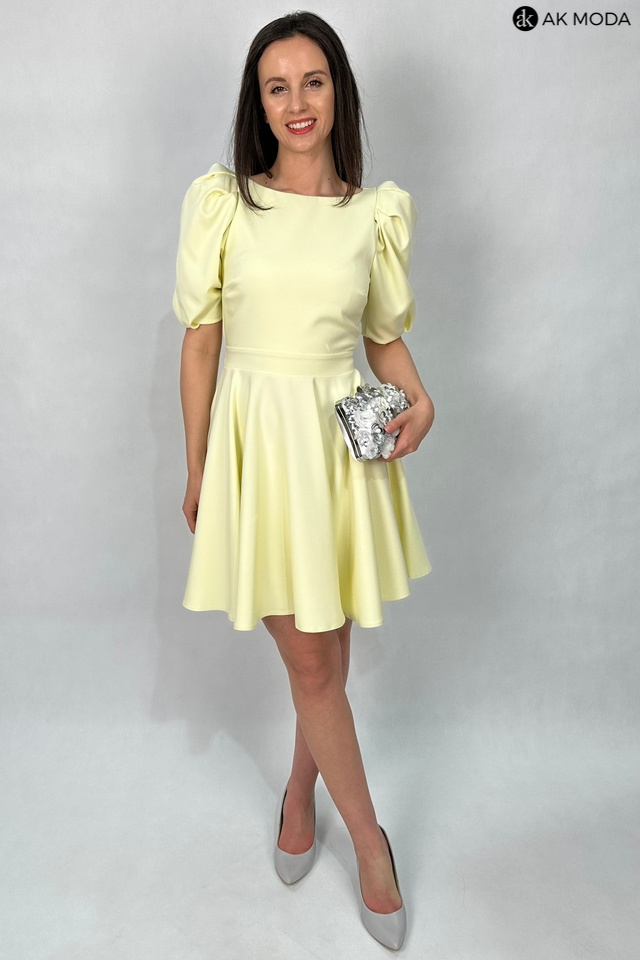 Rozkloszowana sukienka w kolorze żółtym. Dekolt okrągły, na plecach wycięcie, krótkie, lekko bufiaste rękawy, w talii wiązany pasek.
