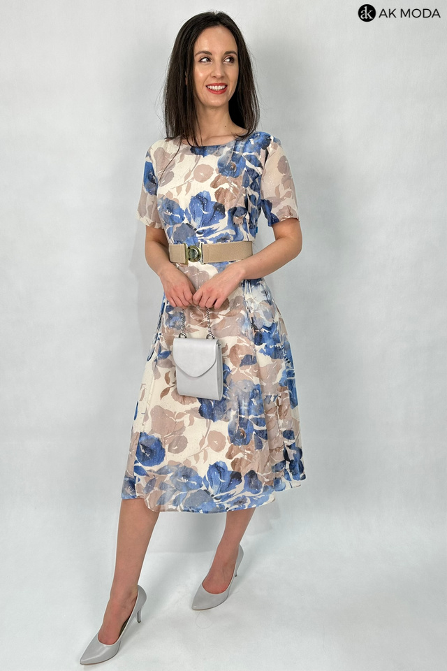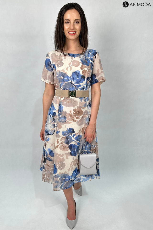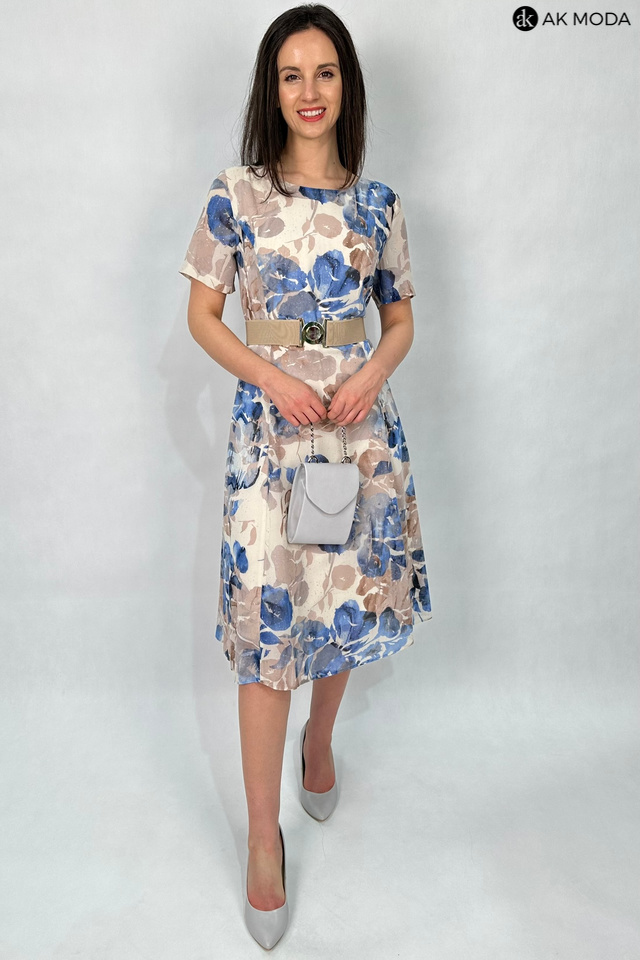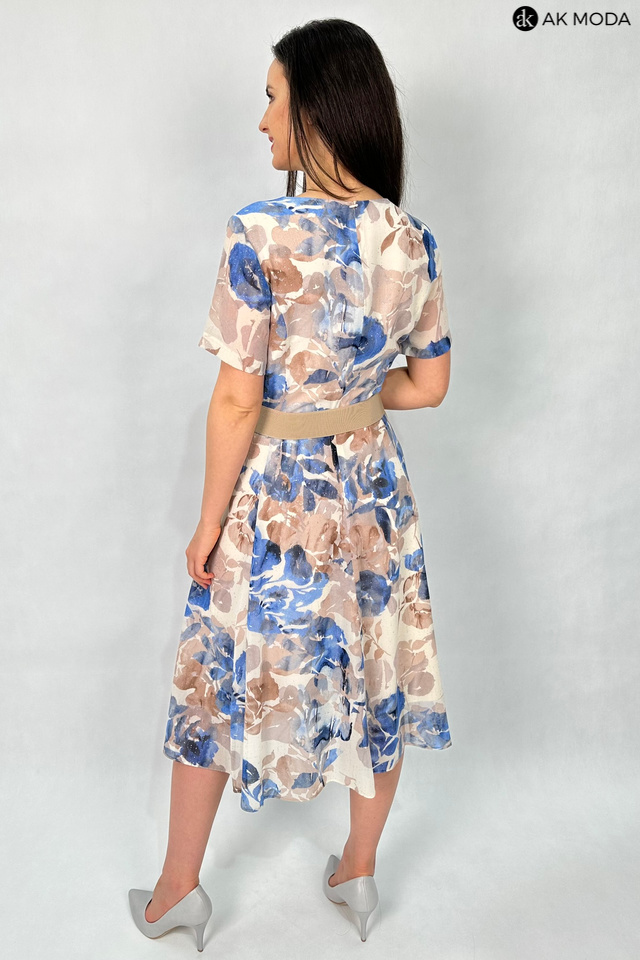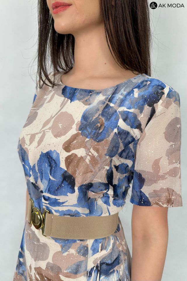 Rozkloszowana sukienka z kwiatowym printem, utrzymana w beżowo-błękitnej kolystyce ze złotymi akcentami. Dekolt okrągły, krótkie transparentne rękawy, w talii elastyczny pasek.