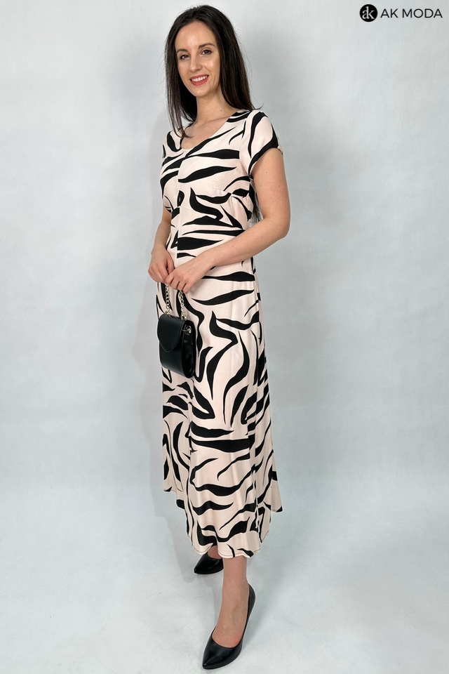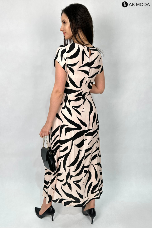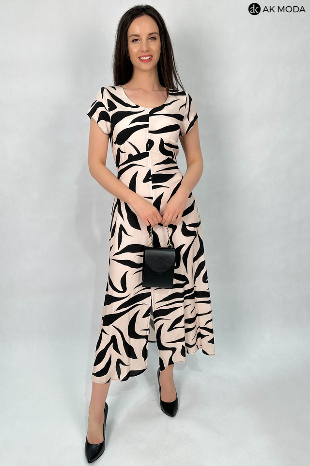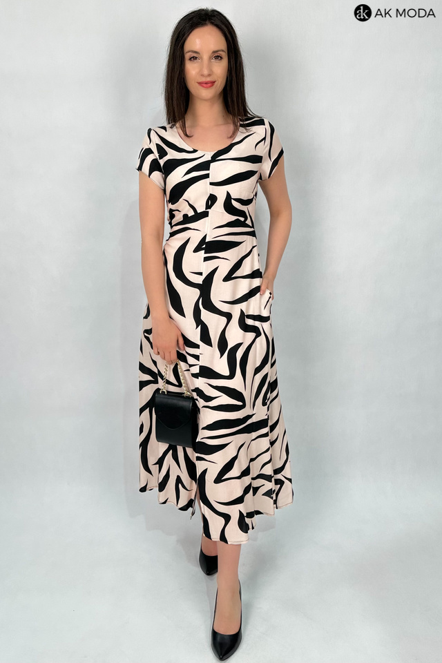 Rozkloszowana sukienka midi w beżowo-czarnej kolorystyce. Dekolt okrągły, krótkie rękawki, z przodu rozcięcie. Sukienka posiada kieszenie.
