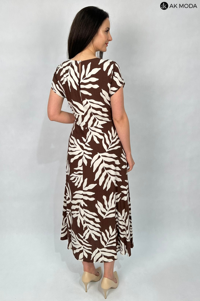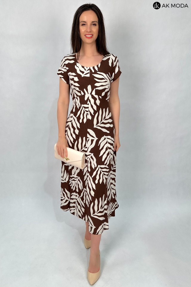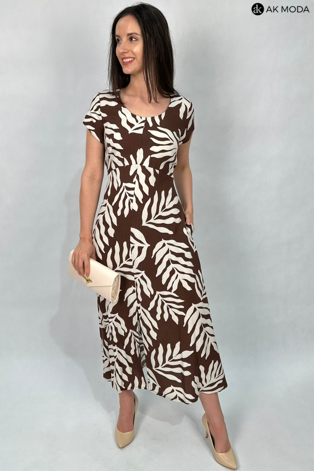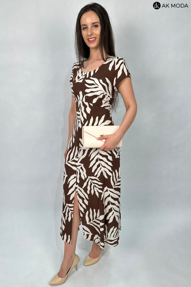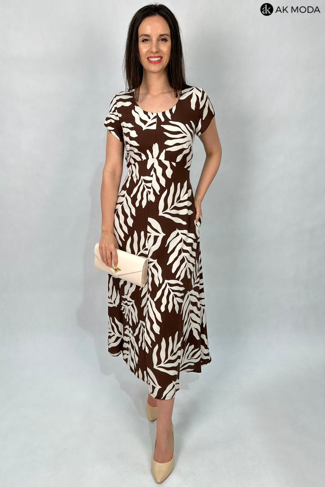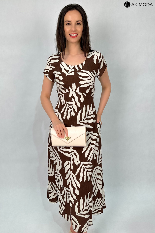 Rozkloszowana sukienka midi w brązowo-beżowej kolorystyce. Dekolt okrągły, krótkie rękawki, z przodu rozcięcie. Sukienka posiada kieszenie.