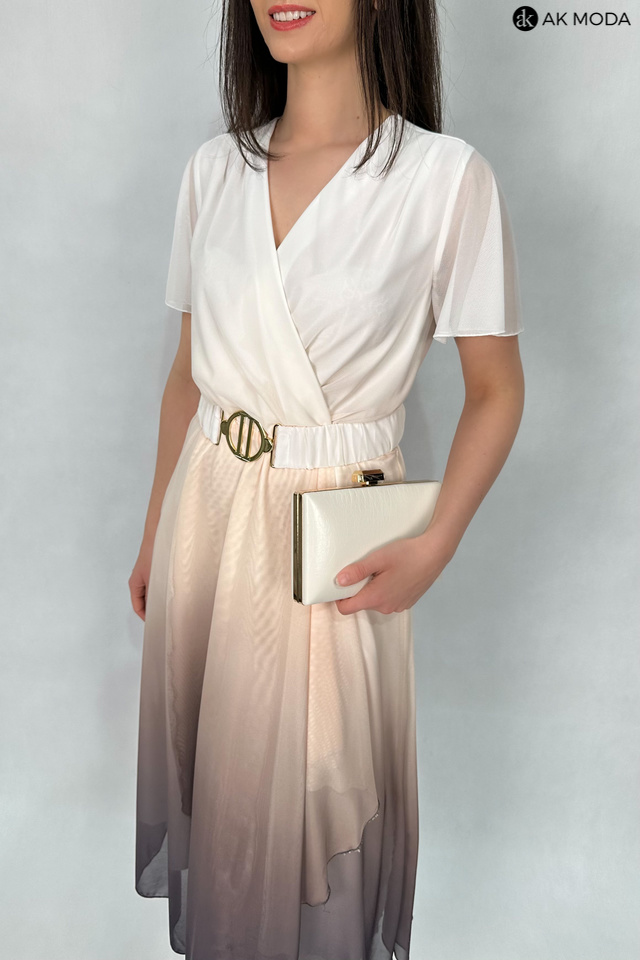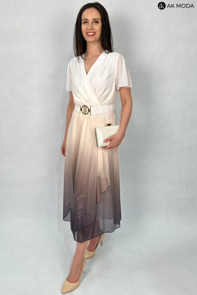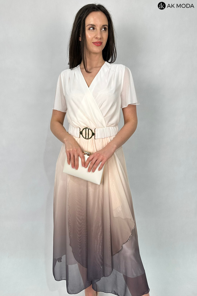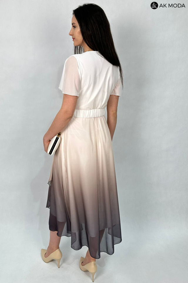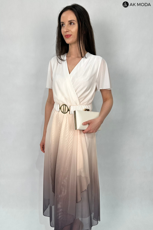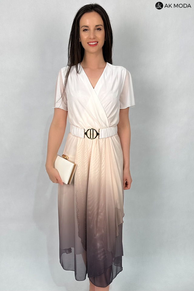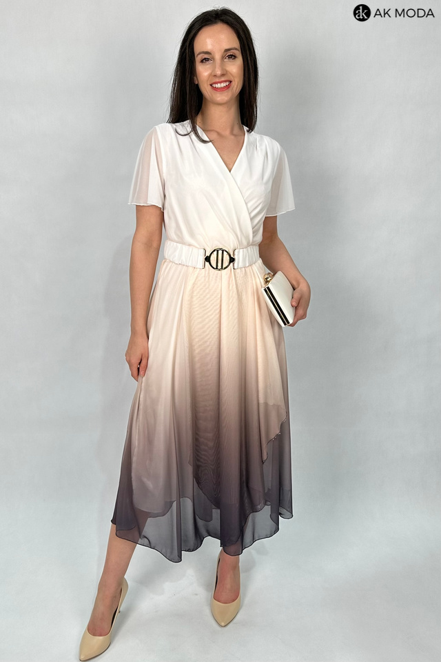 Rozkloszowana sukienka midi uszyta z siateczkowego materiału w odcieniach brązu i beżu. Dekolt kopertowy - dopasowuje się do biustu, krótkie transparentne rękawy, w talii gumka i elastyczny pasek.