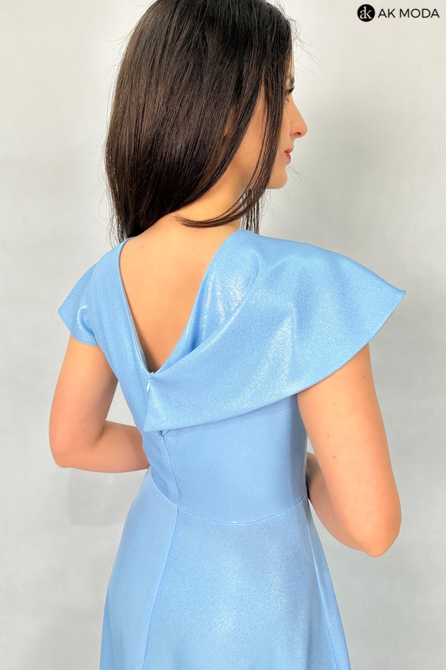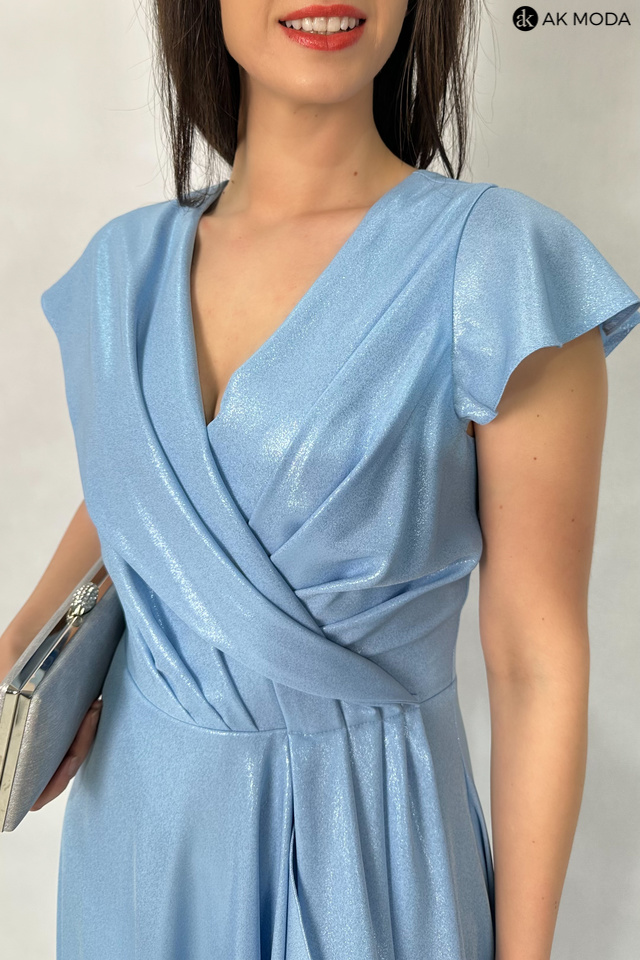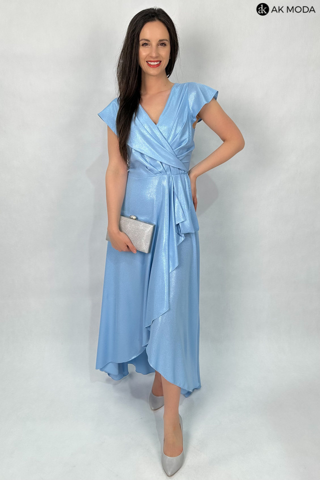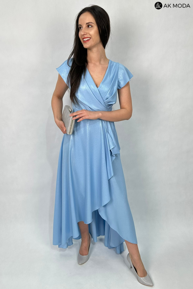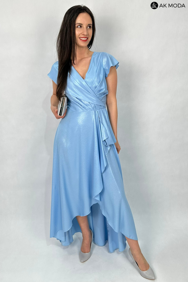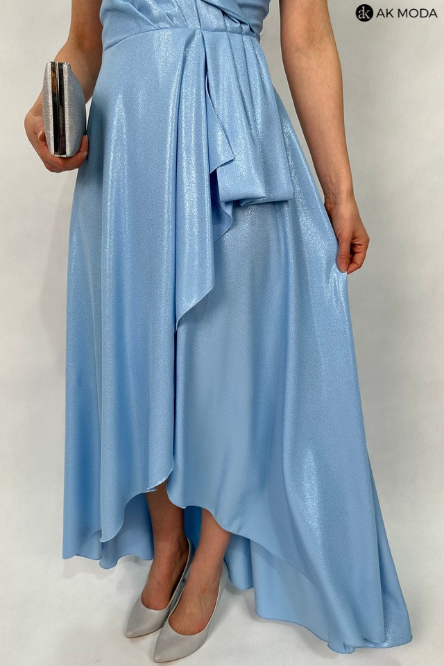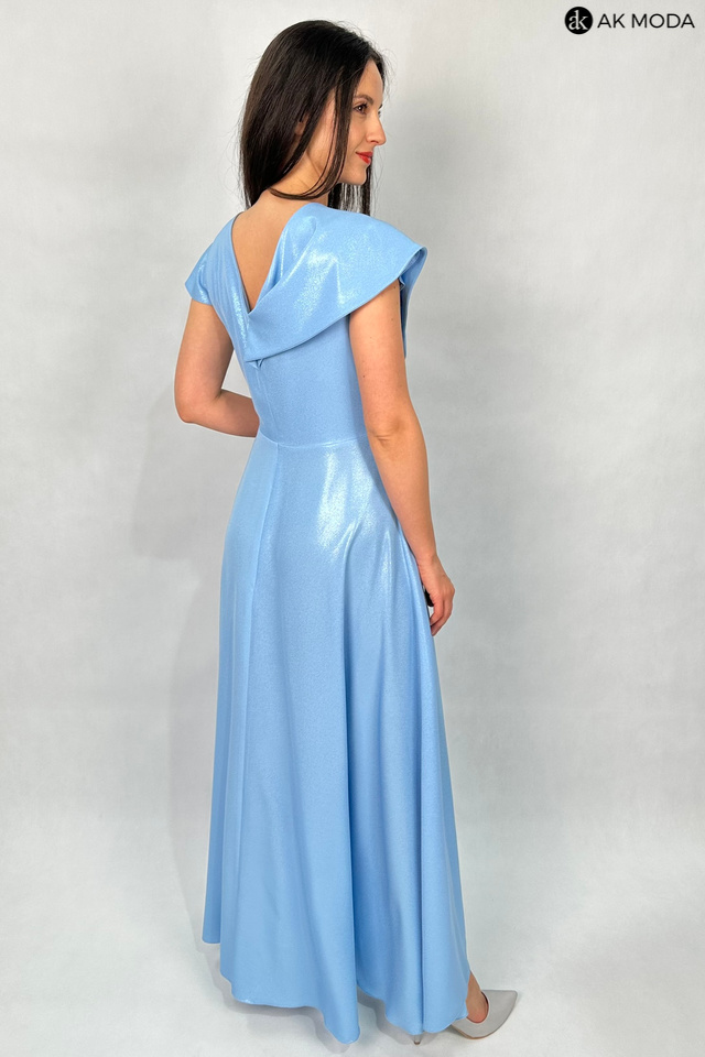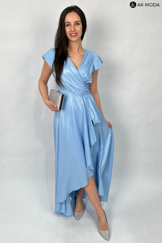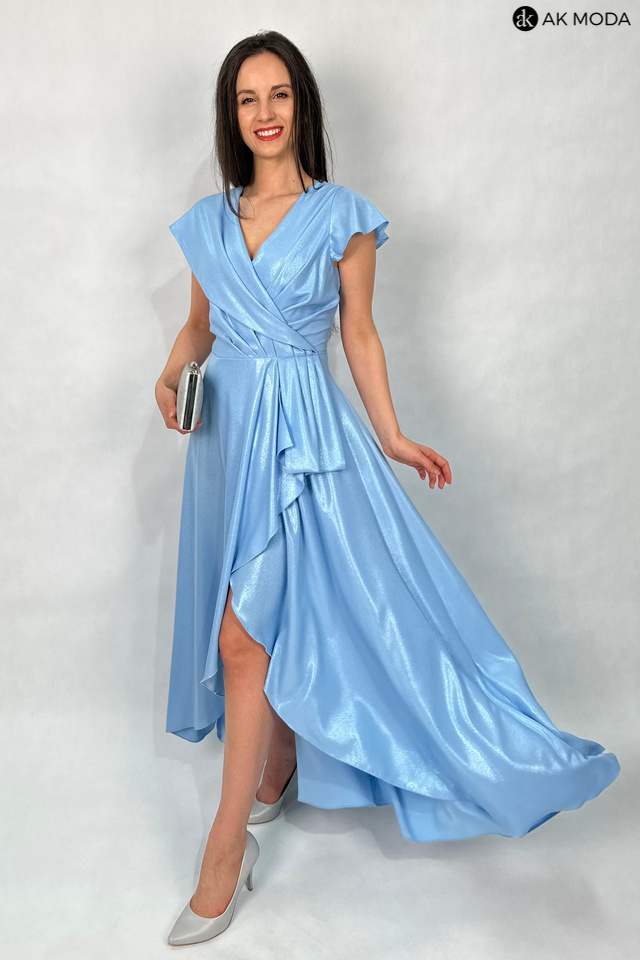 Długa, rozkloszowana sukienka w kolorze niebieskim z asymetrycznym, zakładanym dołem. Dekolt w szpic, w talii marszczenie. Sukienka uszyta z delikatnie błyszcxzącego materiału.