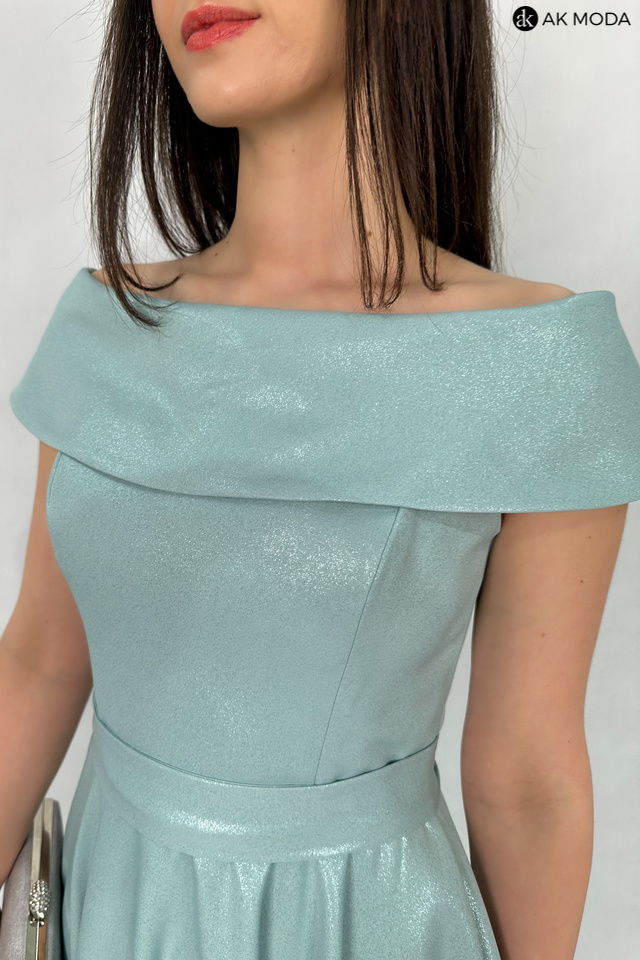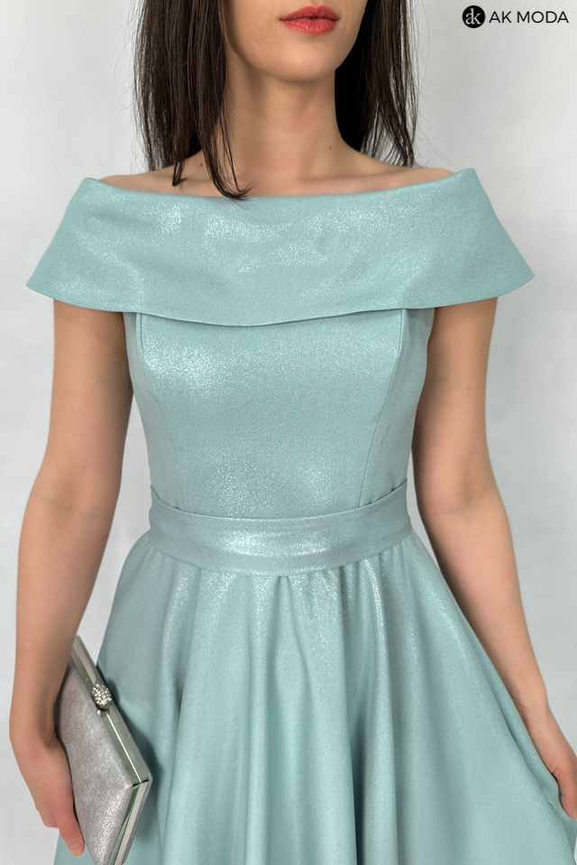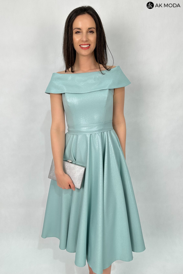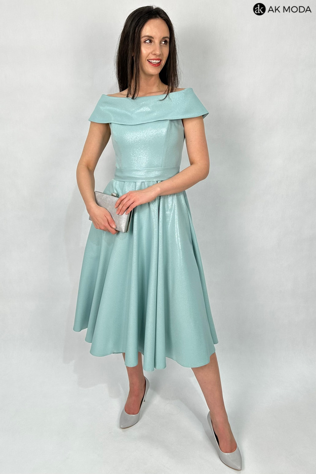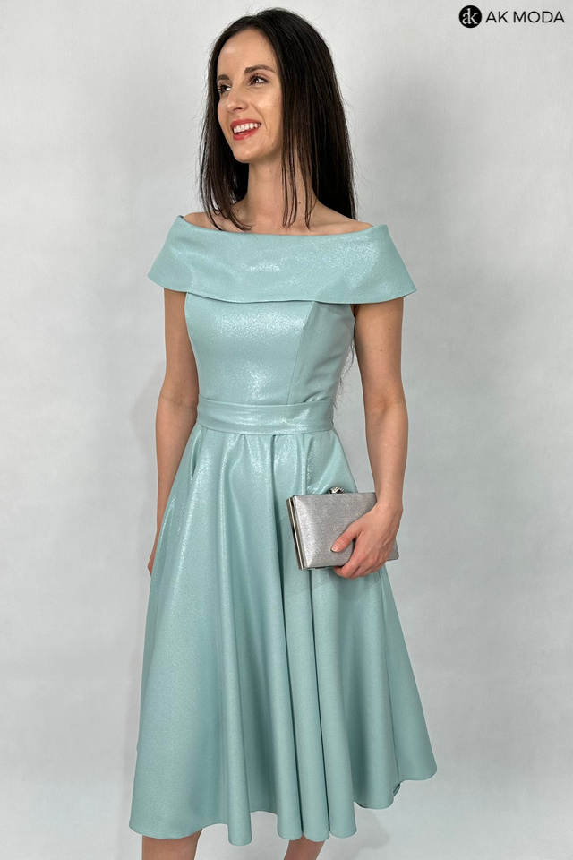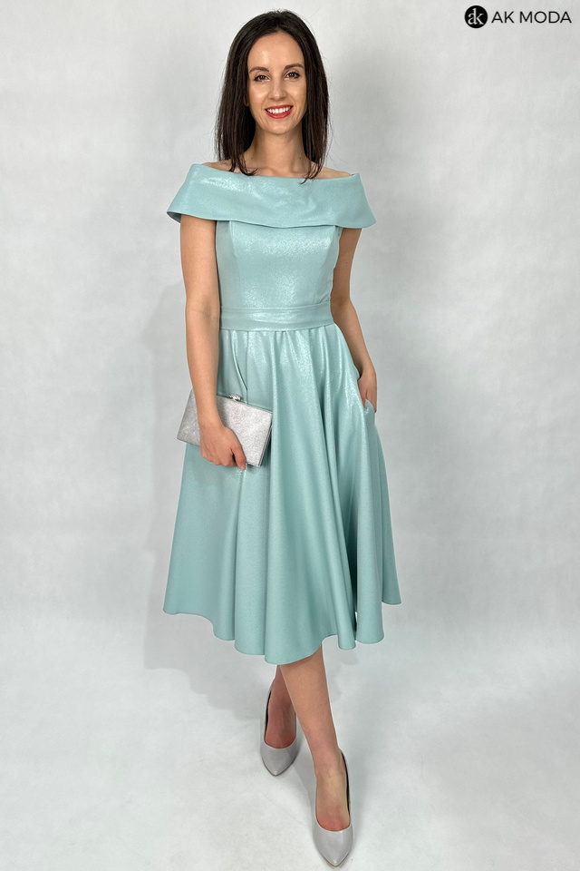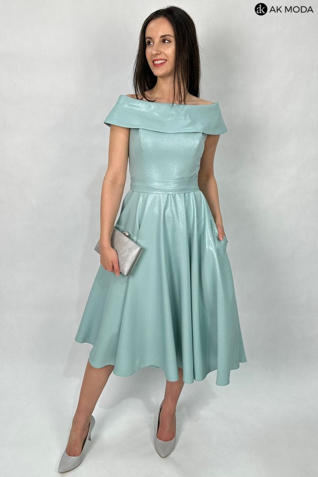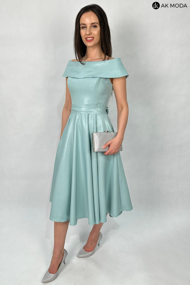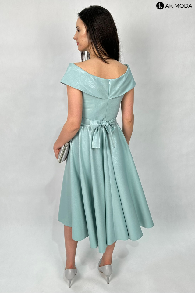 Rozkloszowana sukienka midi w kolorze miętowym z delikatnym połyskiem. Dekolt okrągły z kołnierzem, w talii wiązany pasek, na biuście wszyte fiszbiny. Sukienka posiada kieszenie.