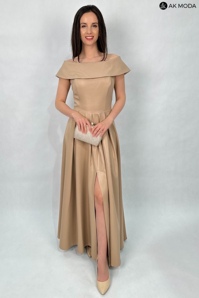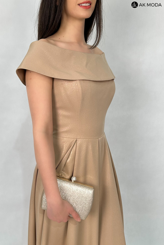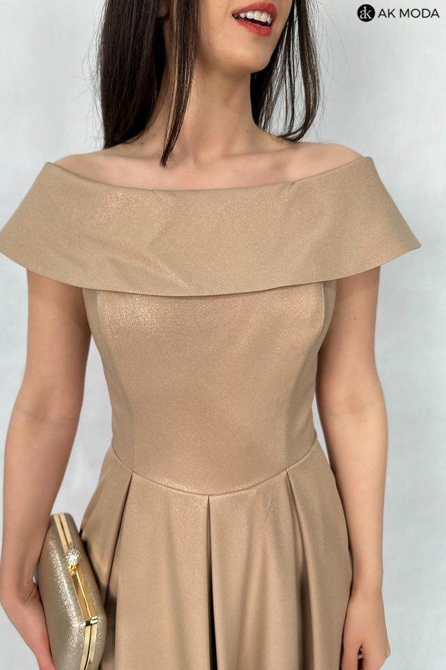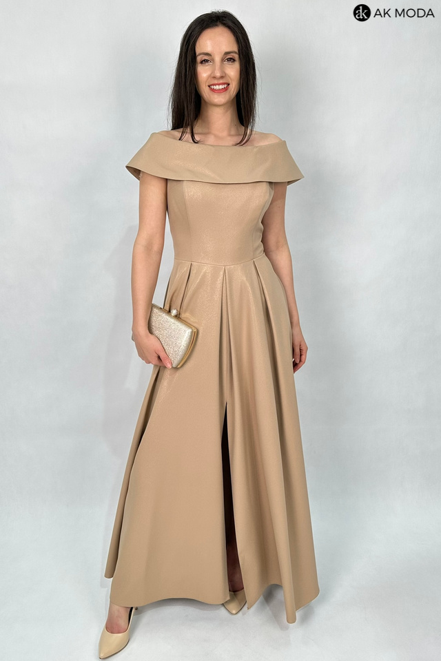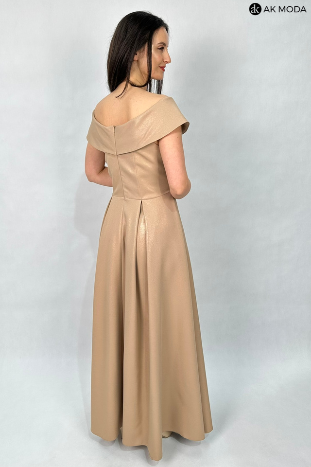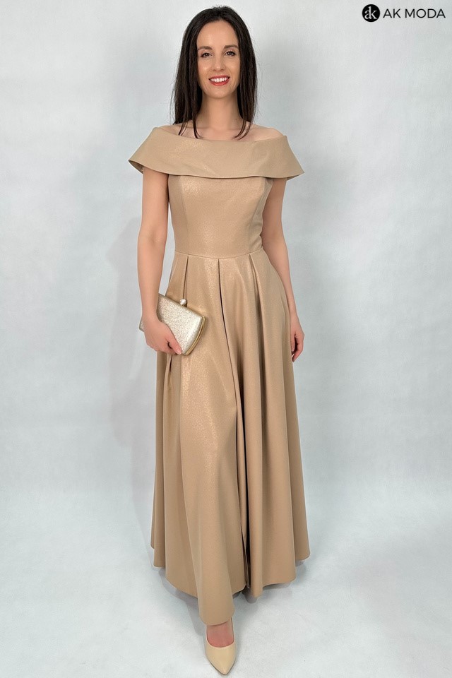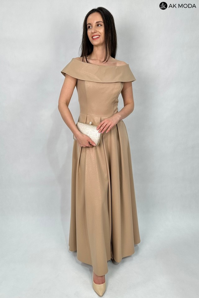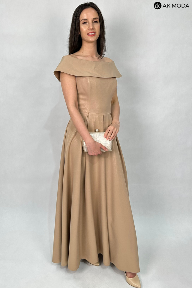 Rozkloszowana sukienka maxi w kolorze brązowym z delikatnym połyskiem. Dekolt okrągły z kołnierzem, dół plisowany, na biuście wszyte fiszbiny.