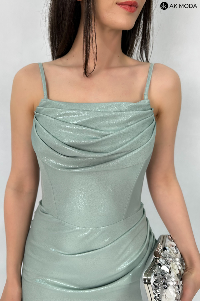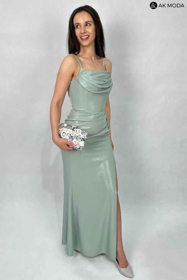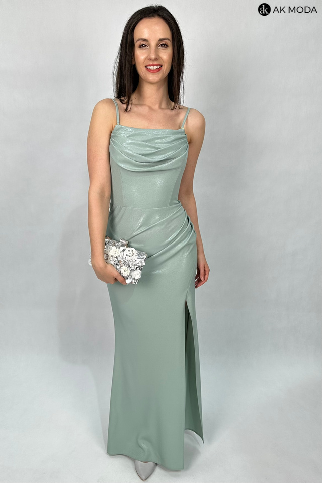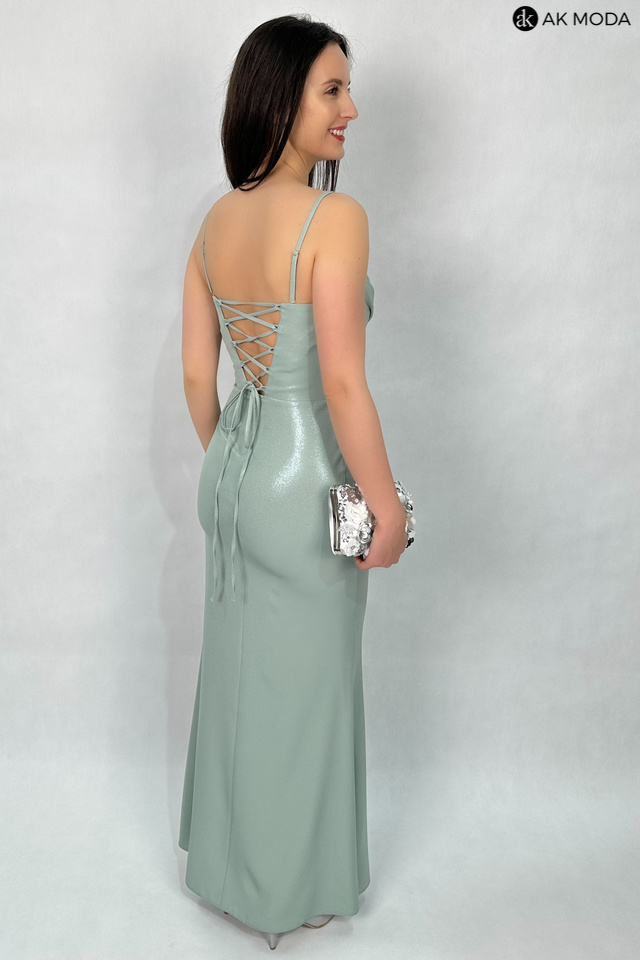 Długa dopasowana sukienka w kolorze miętowym z delikatnym połyskiem, na cienkich, regulowanych ramiączkach, z efektownym sznurowaniem na plechach. Dekolt typu "woda", z boku rozcięcie, w górnej części wszyte fiszbiny.
