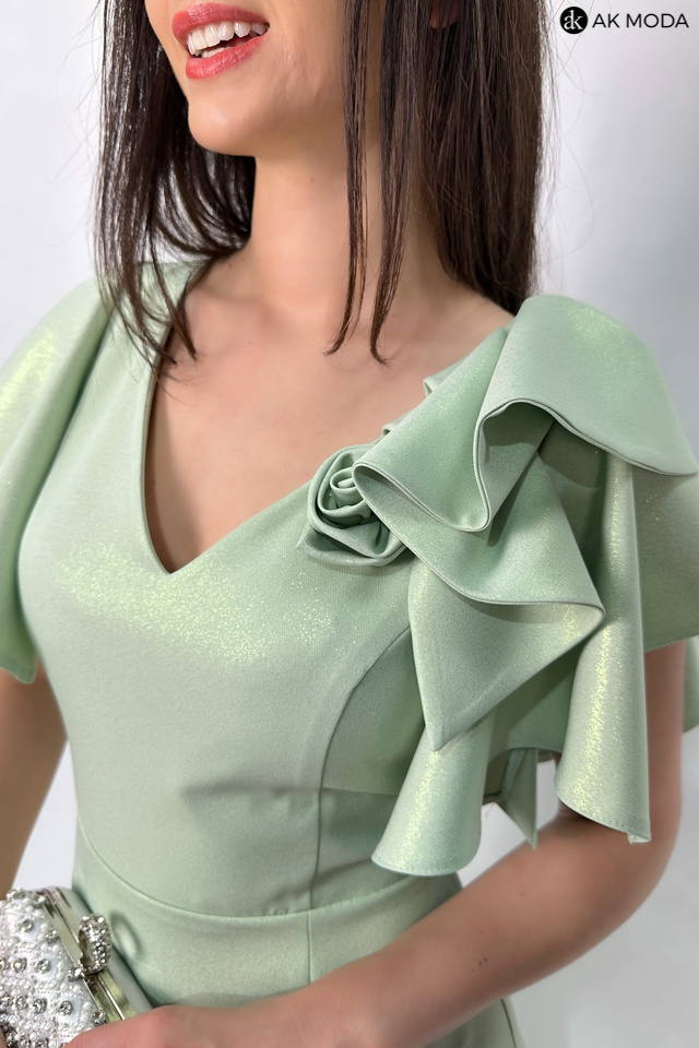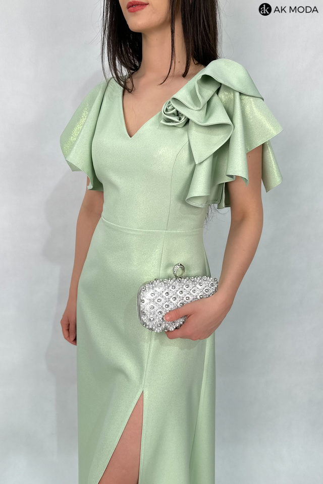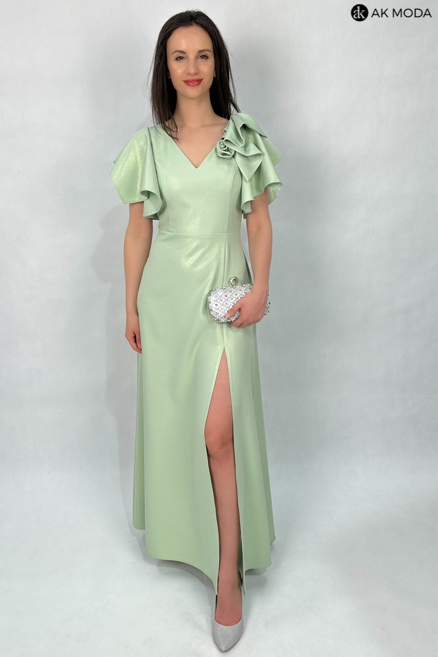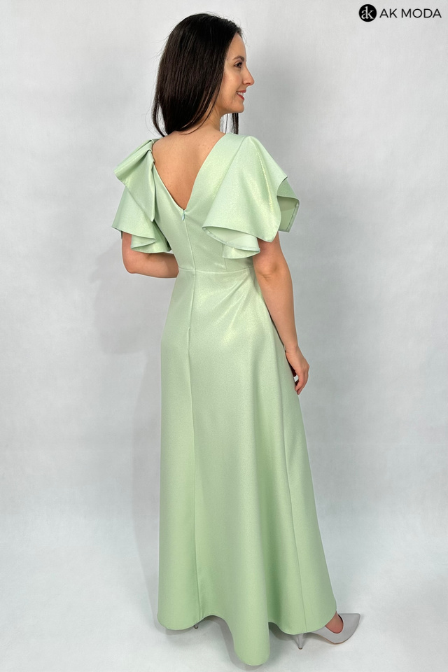 Rozkloszowana sukienka maxi w kolorze seledynowym z delikatnym połyskiem. Dekolt w szpic. krótkie rękawki w formie falbanek, na nodze rozcięcie.
