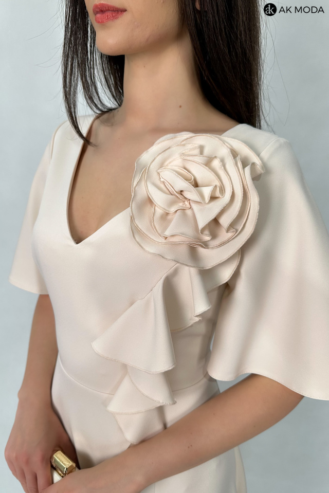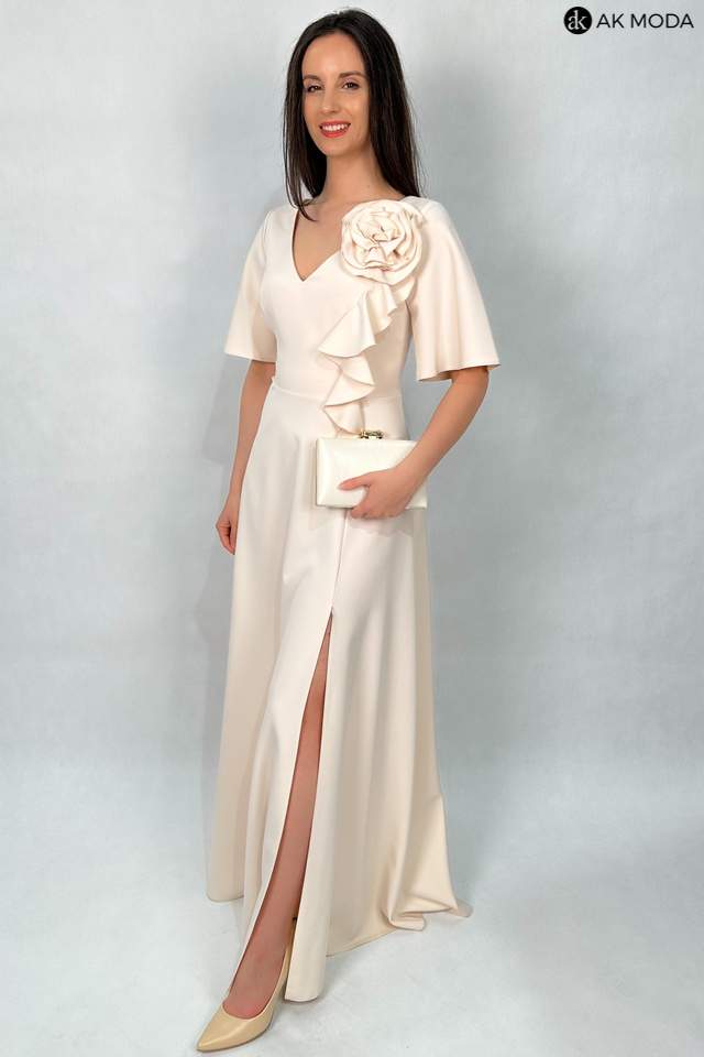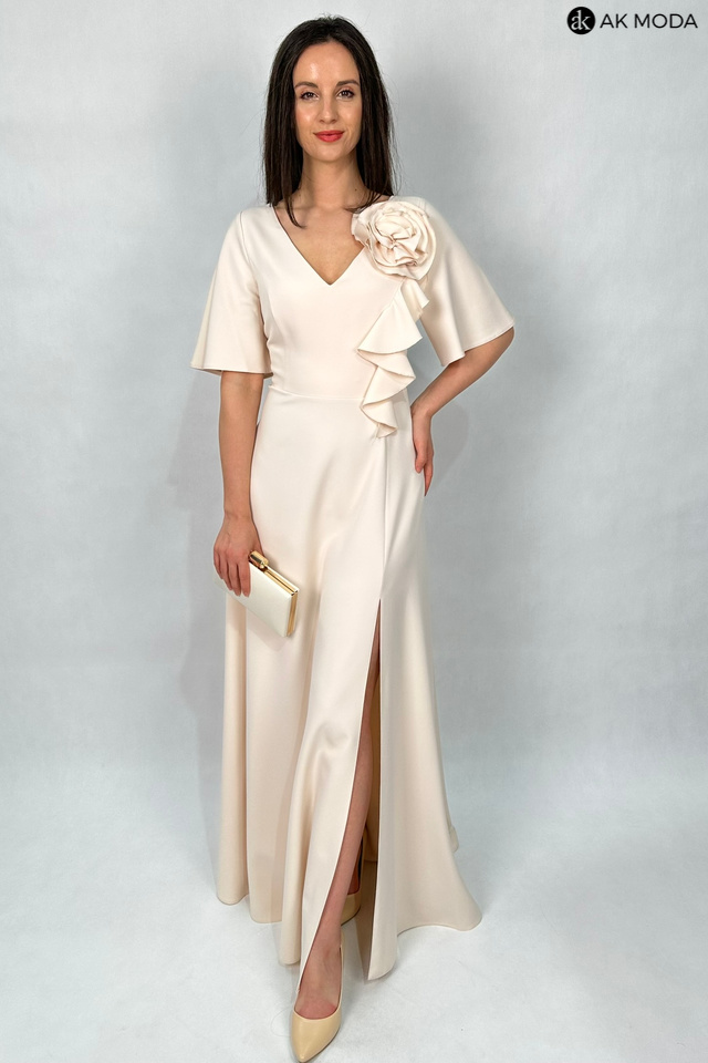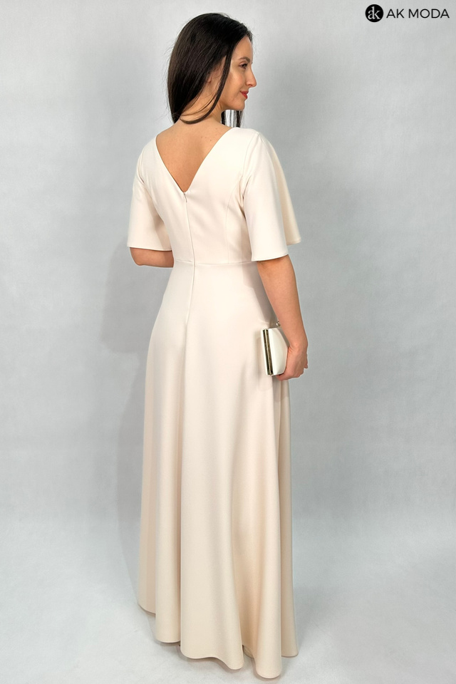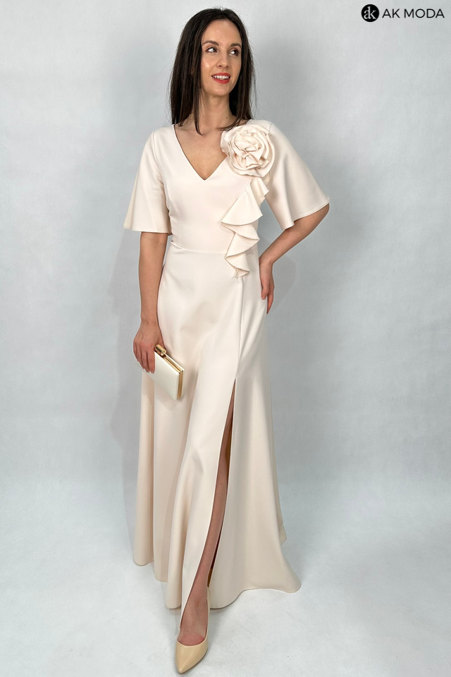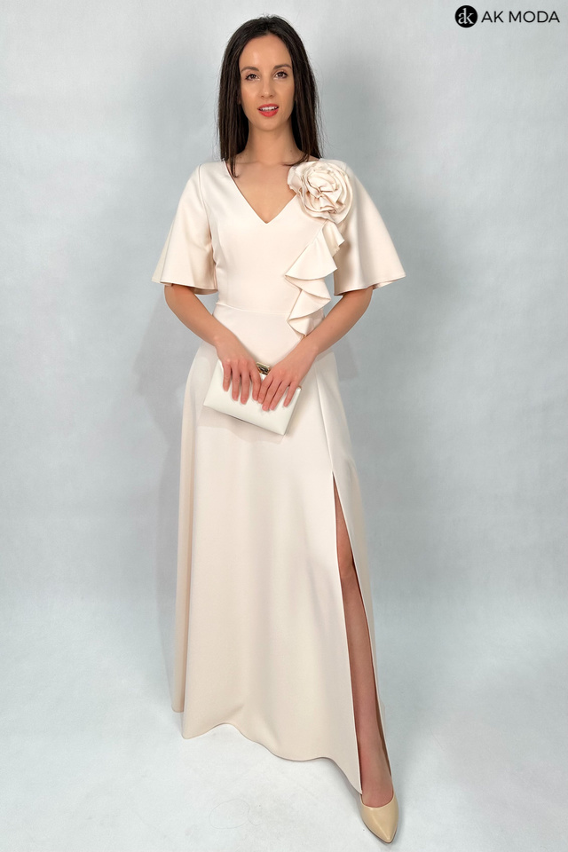 Elegancka, rozkloszowana sukienka maxi w kolorze beżowym z wycięciem na plecach. Dekolt w szpic, krótkie, luźne rękawy, rozcięcie na nodze. Przy dekolcie ozdobny kwiatek.