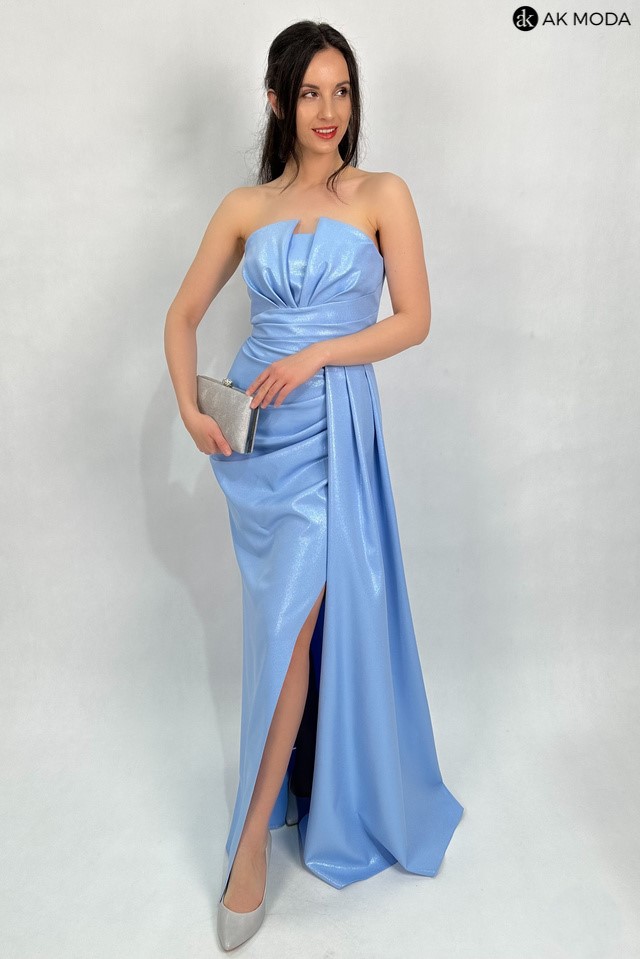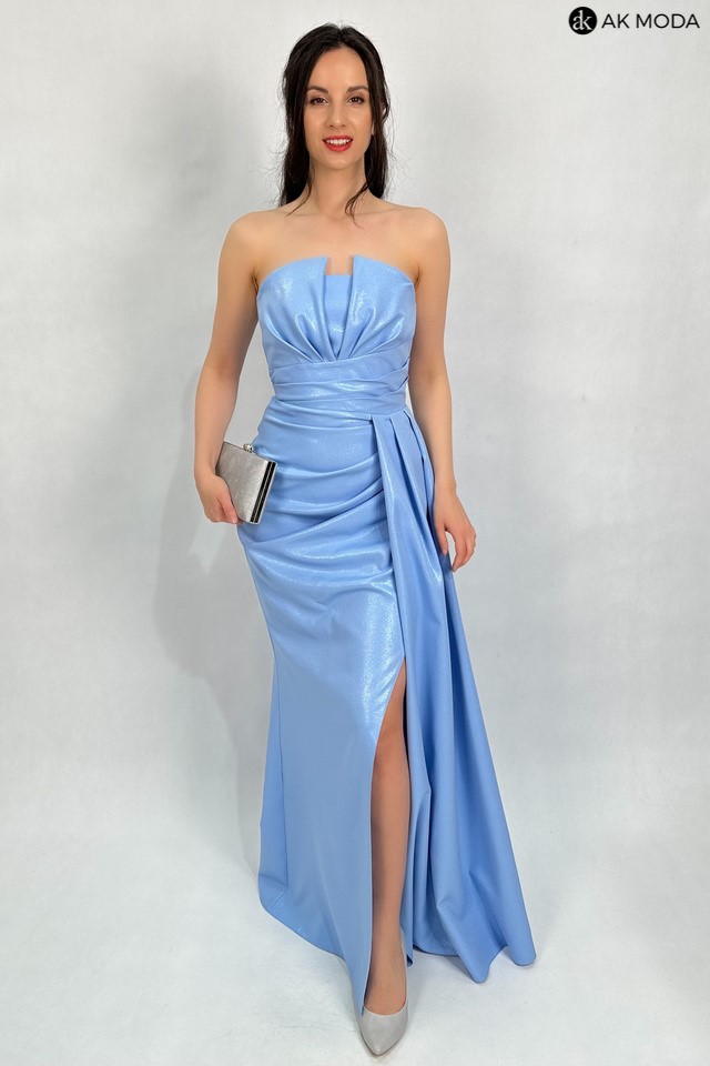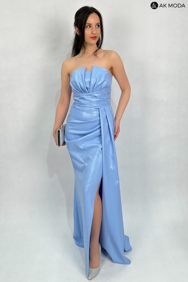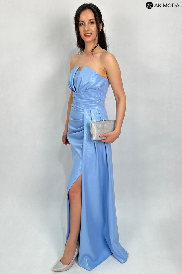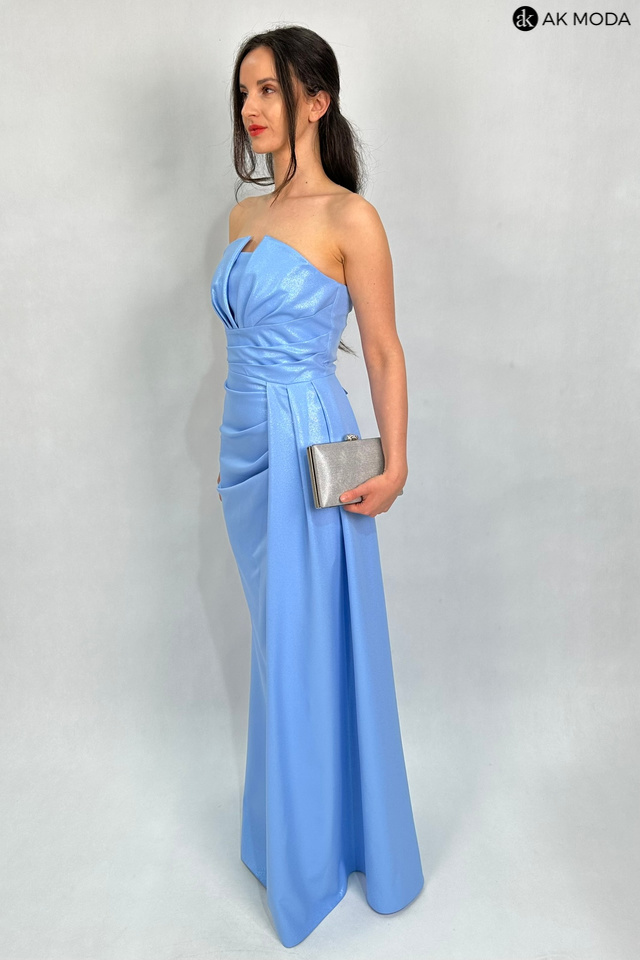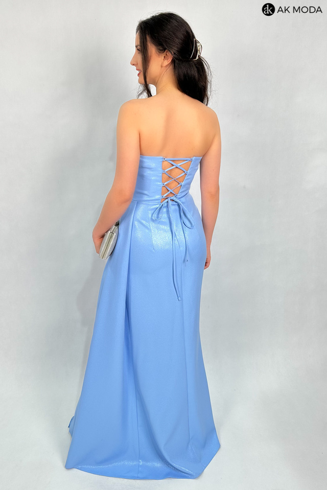 Elegancka sukienka maxi w kolorze błękitnym, na cienkich regulowanych ramiączkach, z efektownym sznurowaniem na plecach i gumką w talii. Sukienka uszyta z delikatnie błyszczącego materiału, posiada odpinane ramiączka.