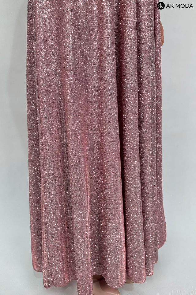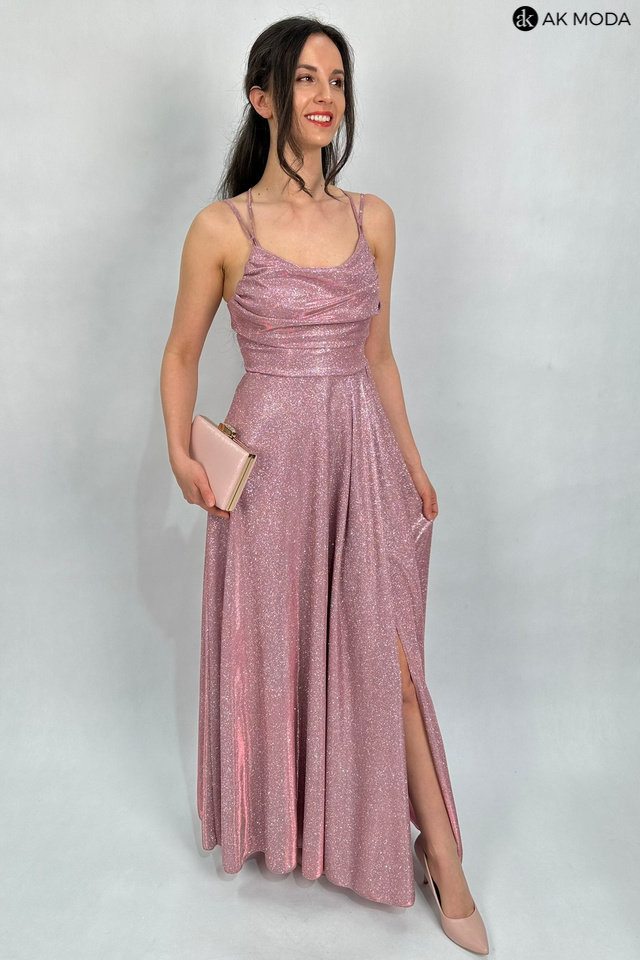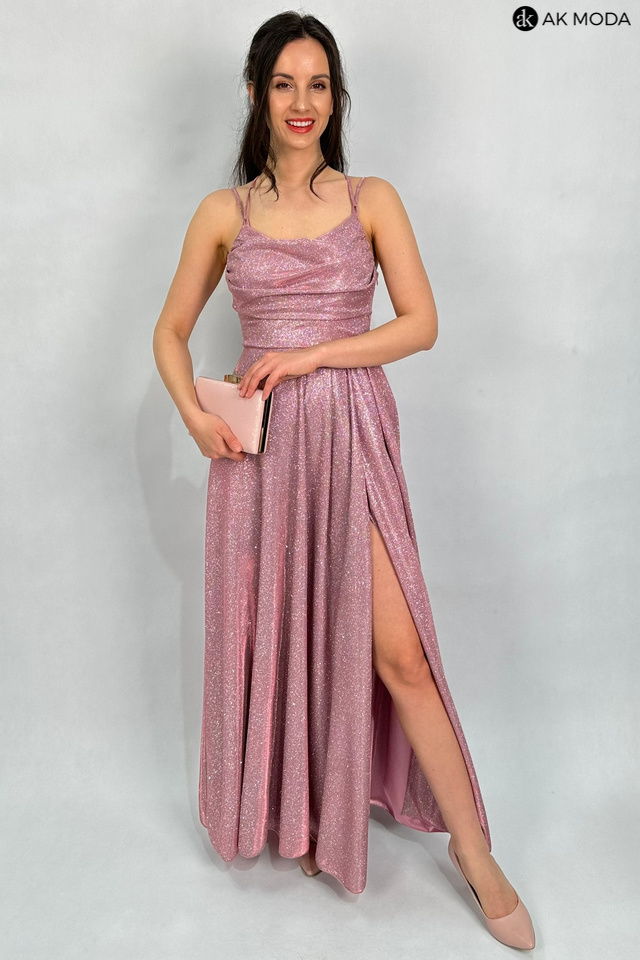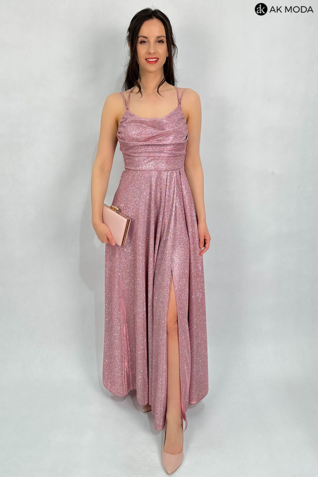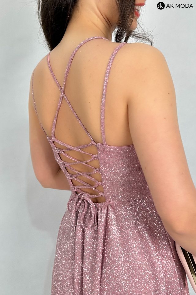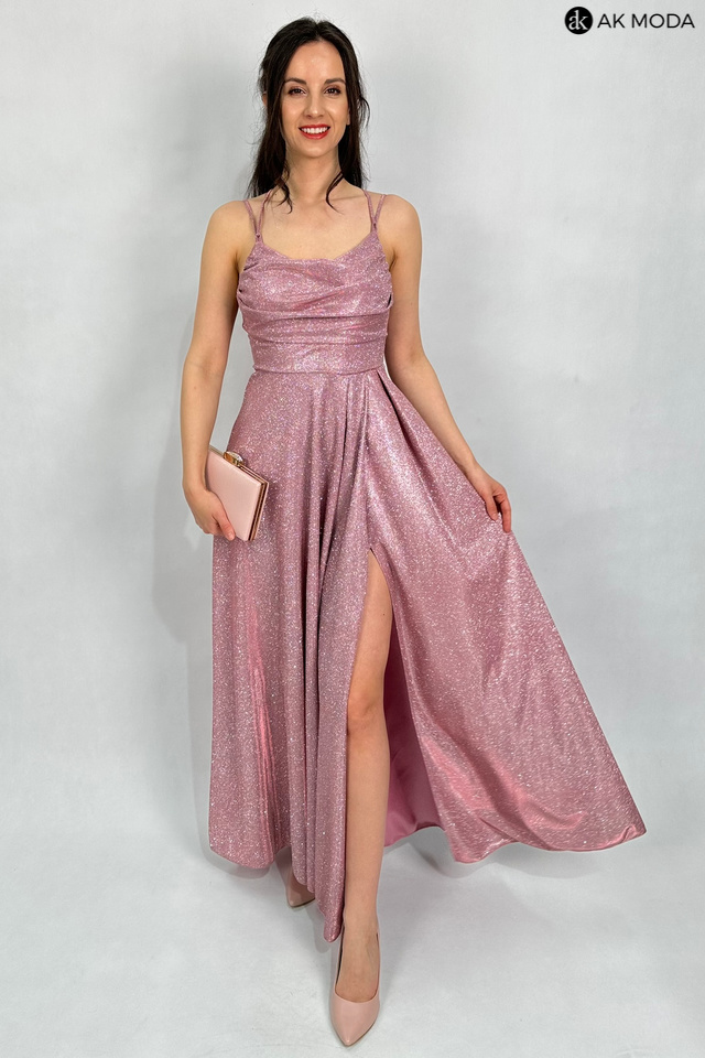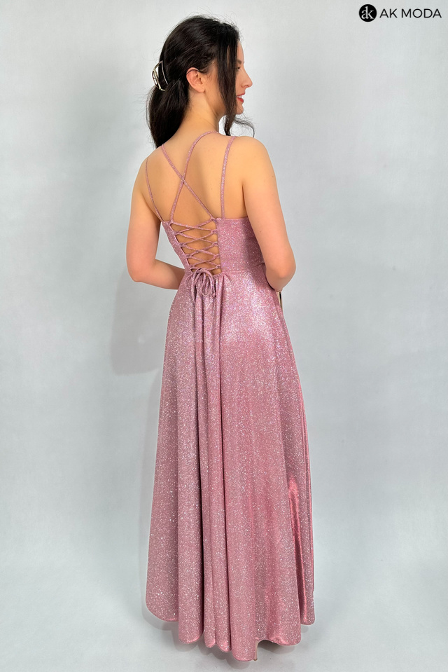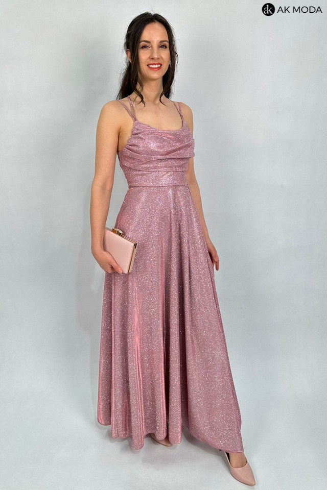 Długa rozkloszowana sukienka w kolorze różowym z efektownym sznurowaniem na plecach. Dekolt typu "woda", w pasie z tyłu gumka, materiał brokatowy.