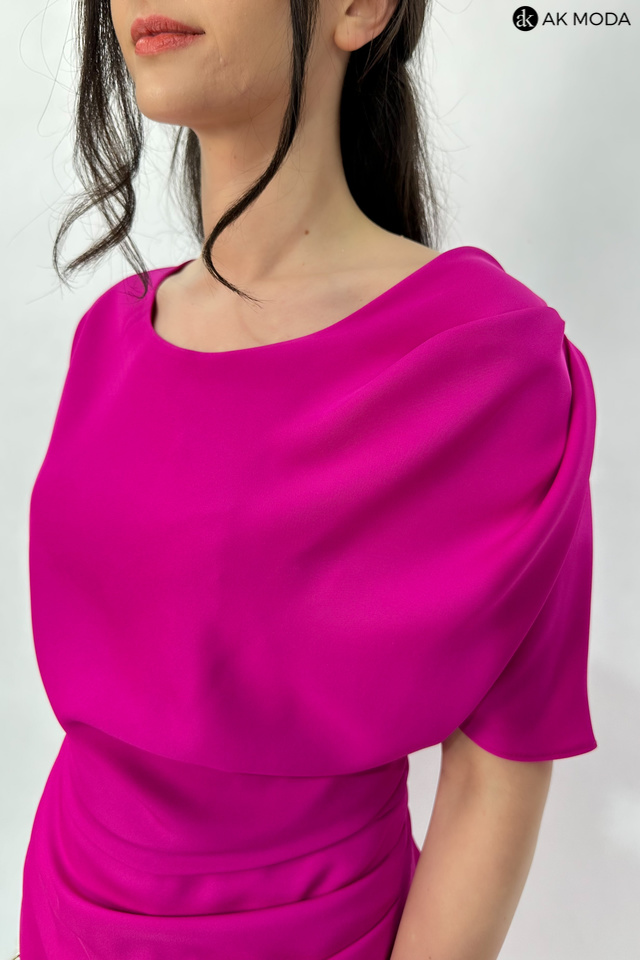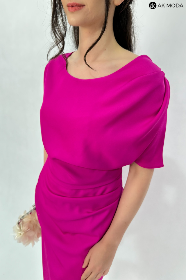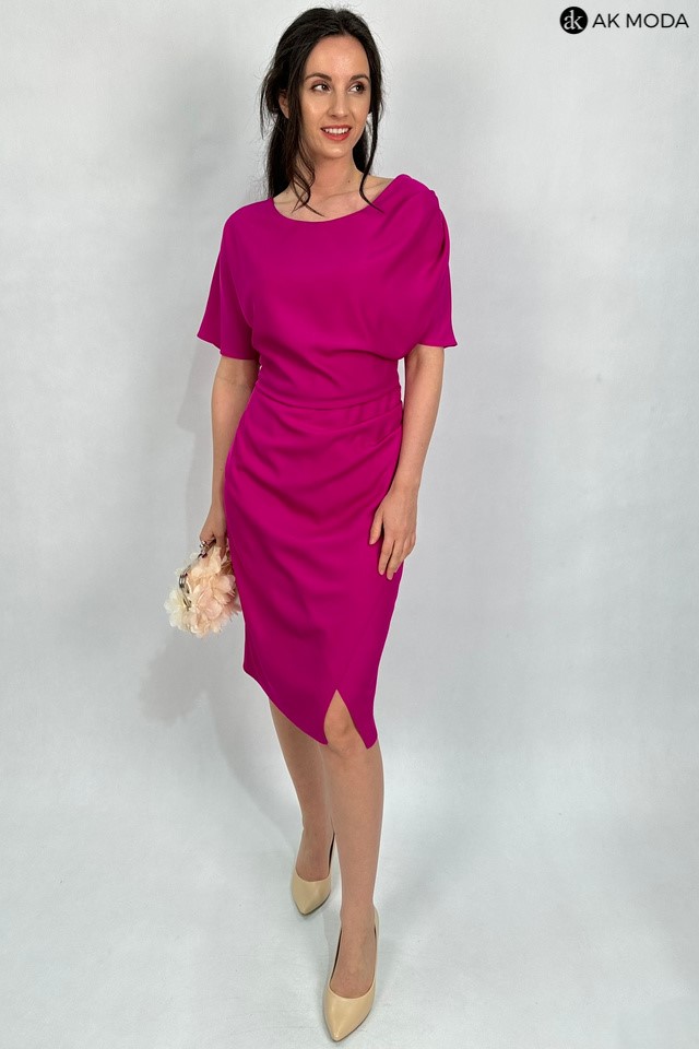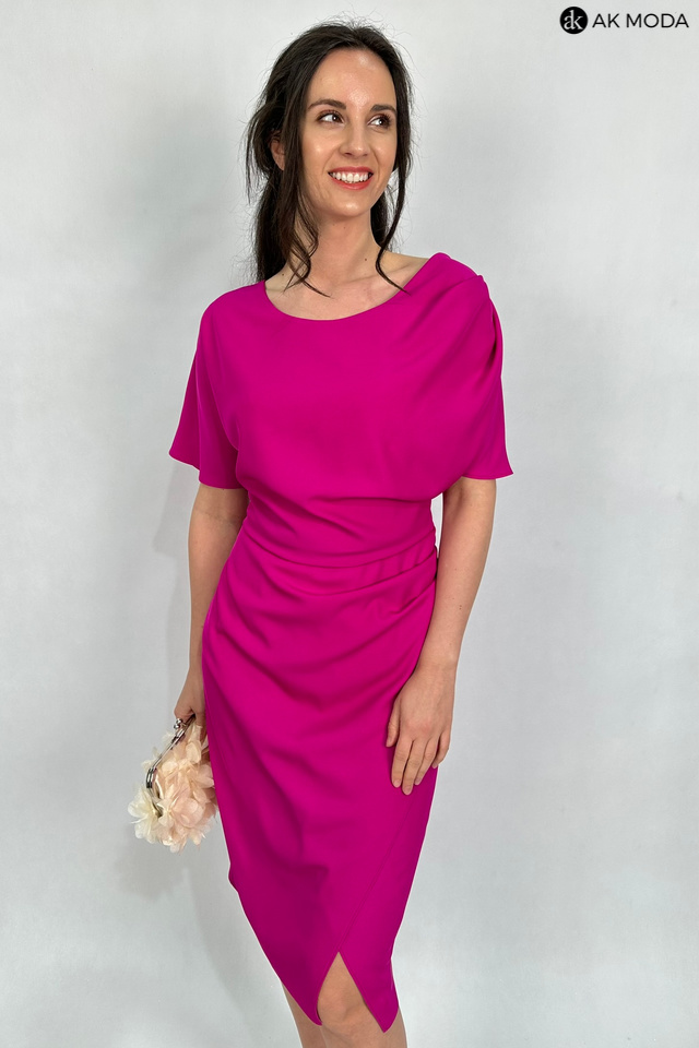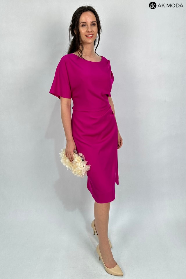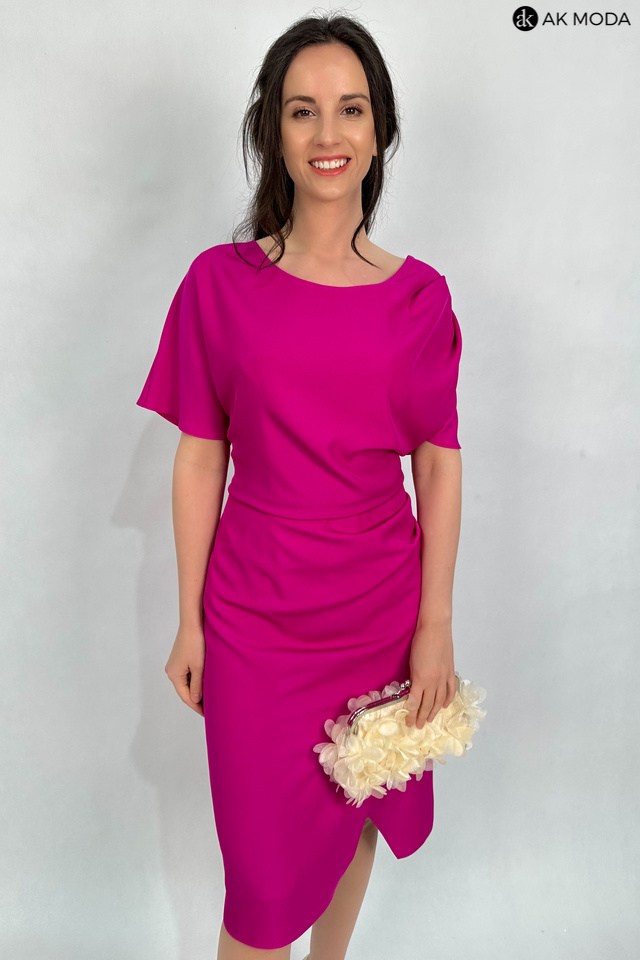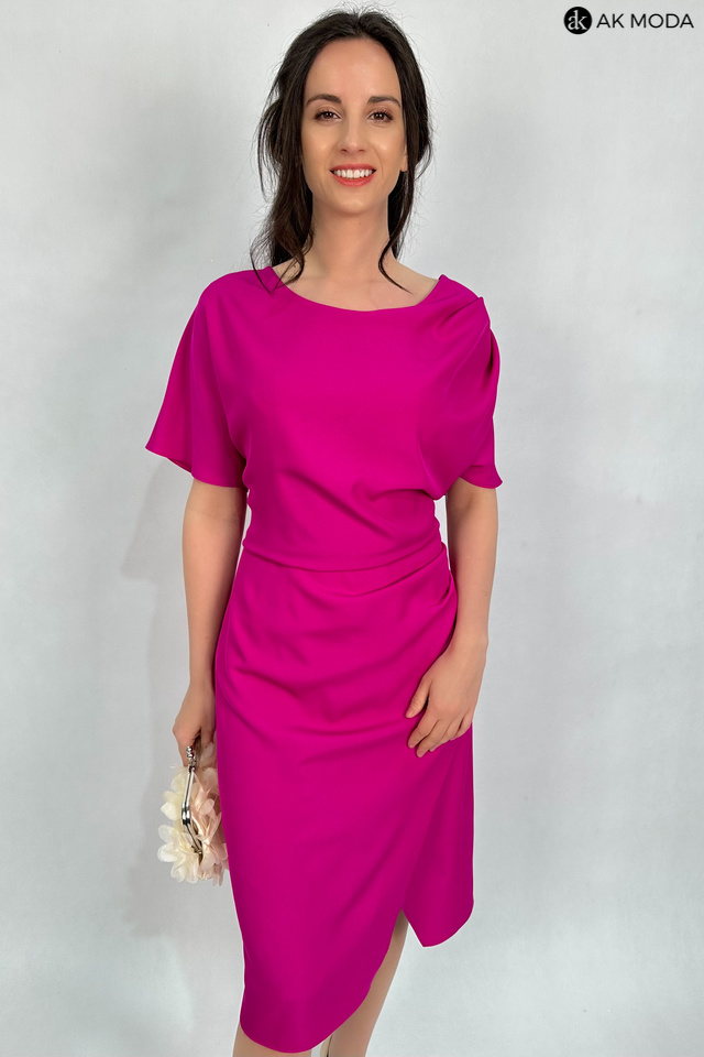 Elegancka sukienka midi w kolorze fuksjowym z krótkimi, kimonowymi rękawami i okrągłym dekoltem. Dół zakładany, góra luźniejsza.