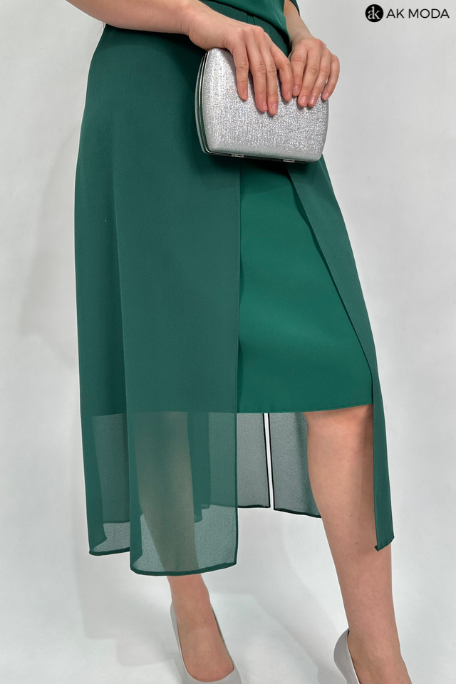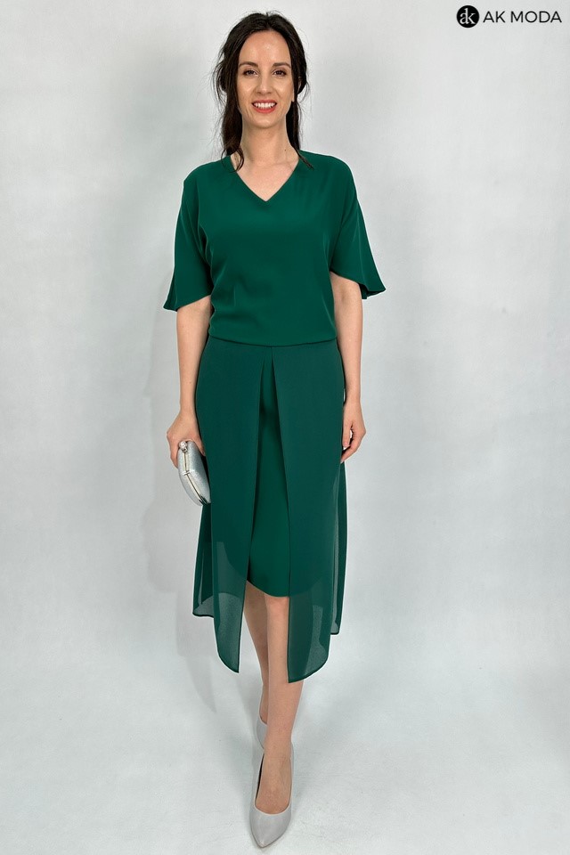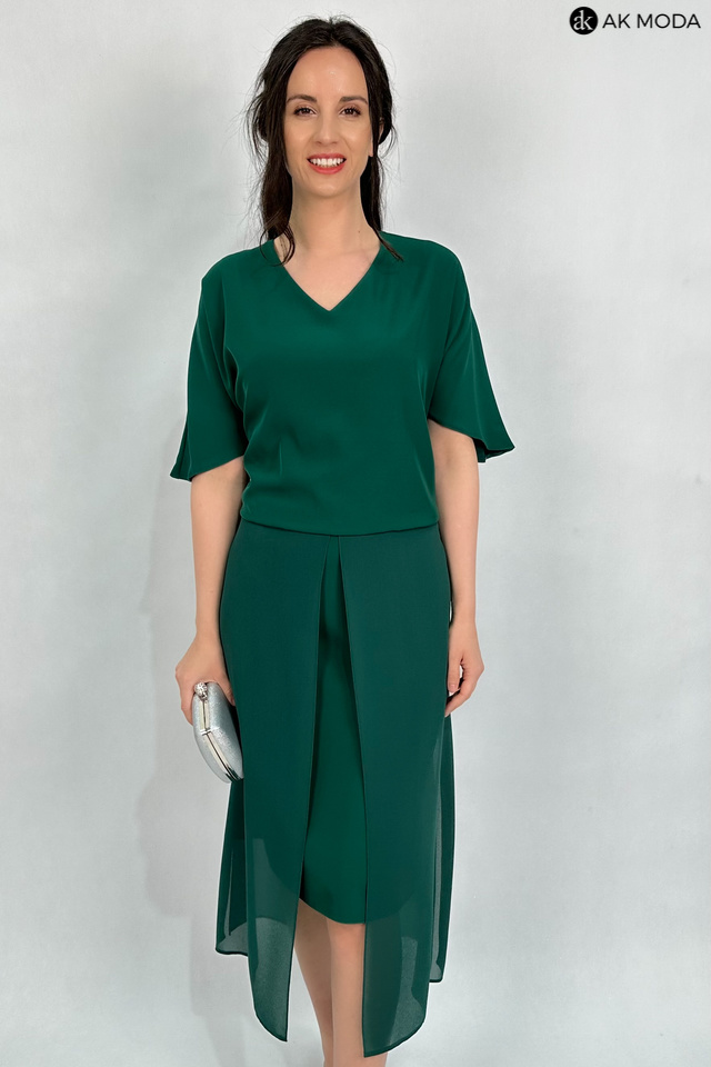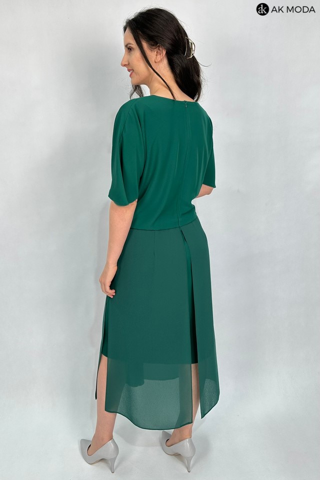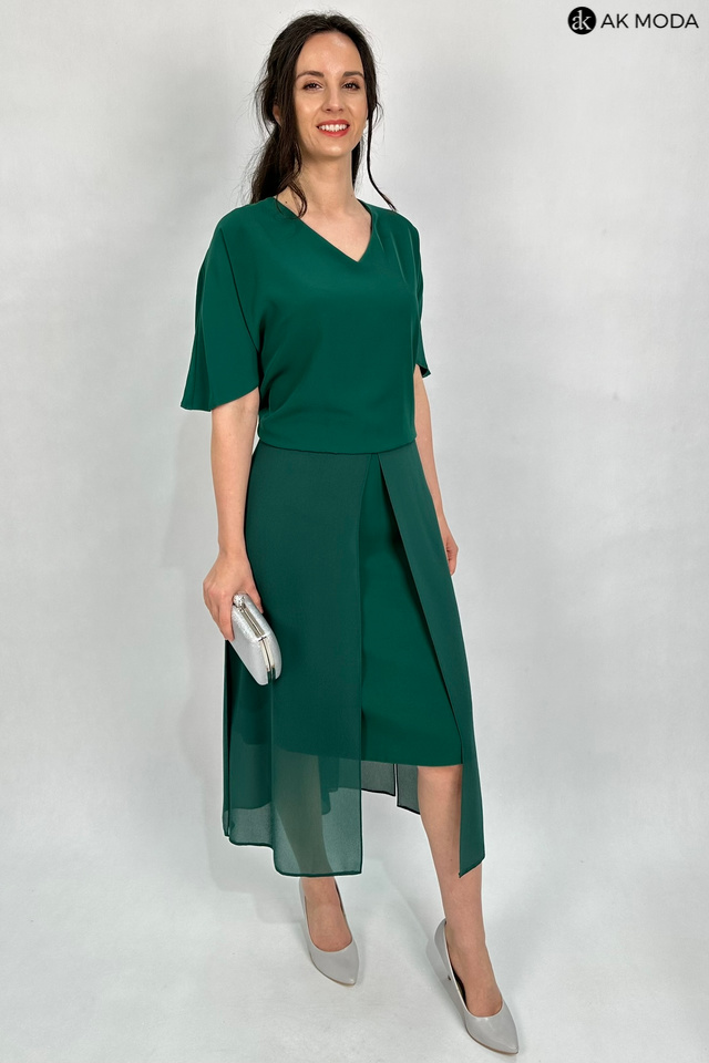 Elegancka sukienka midi w kolorze butelkowej zieleni z krótkimi kimonowymi rękawami i dekoltem w szpic. Dół dopasowany, z wierzchnią warstwą dłuższego tiulu, góra luźniejsza.
