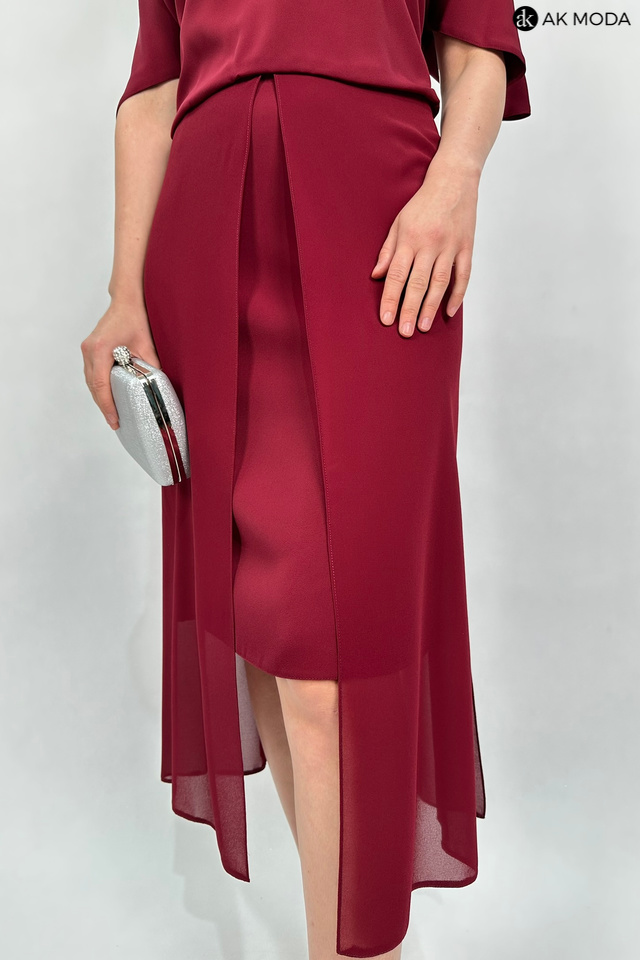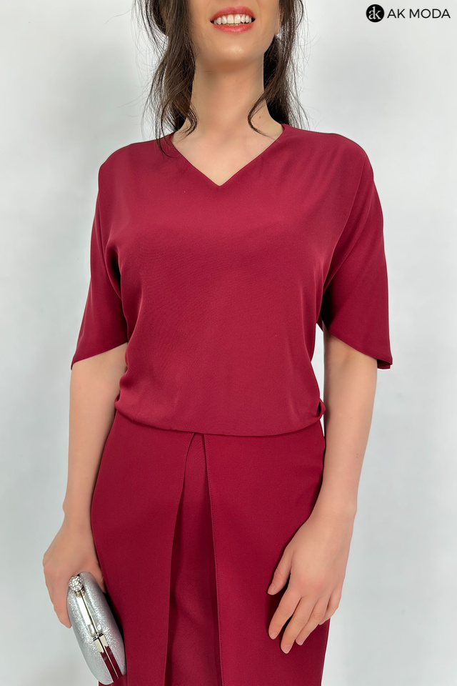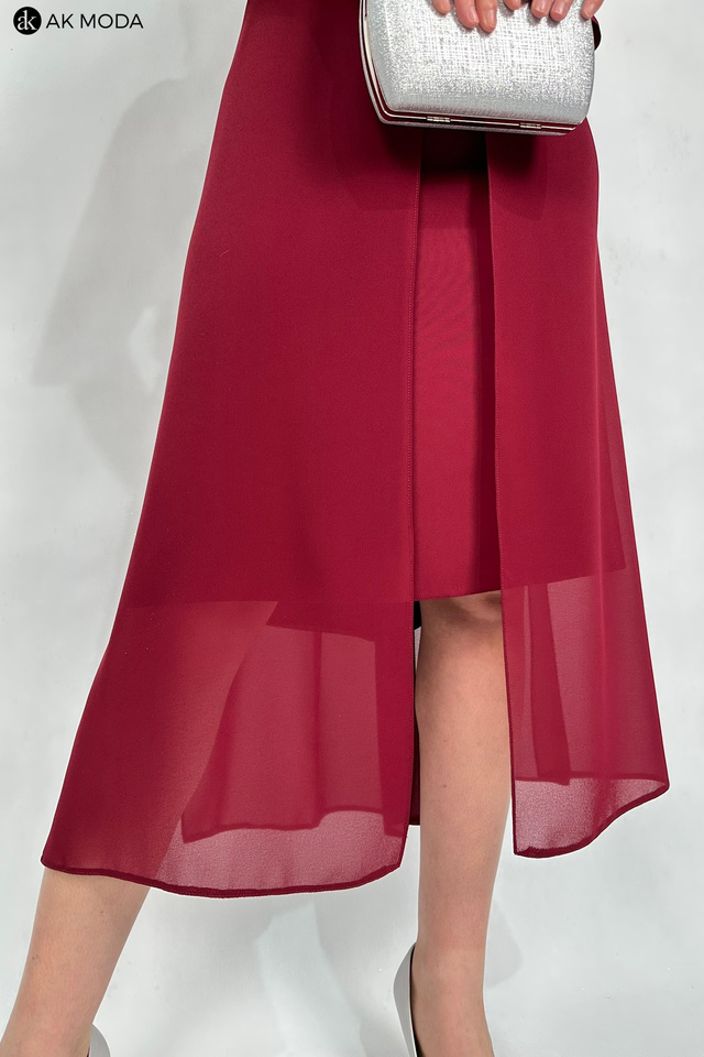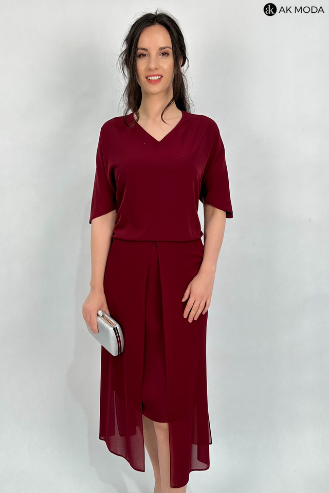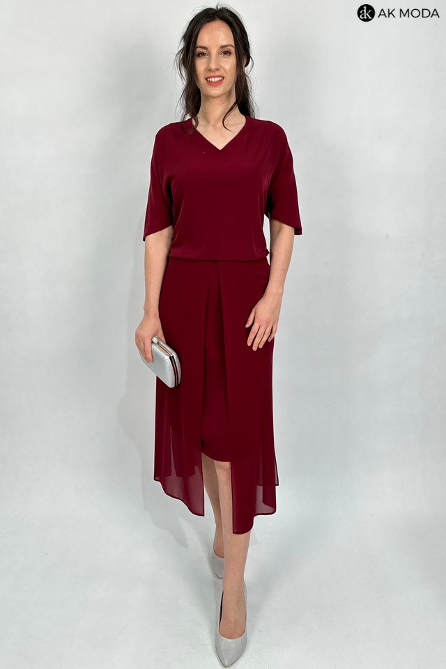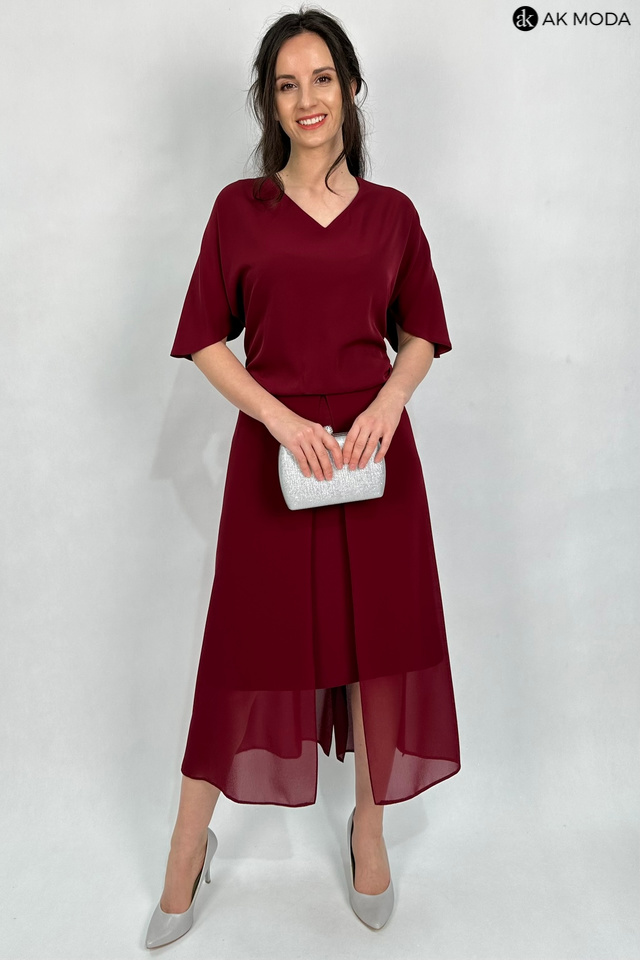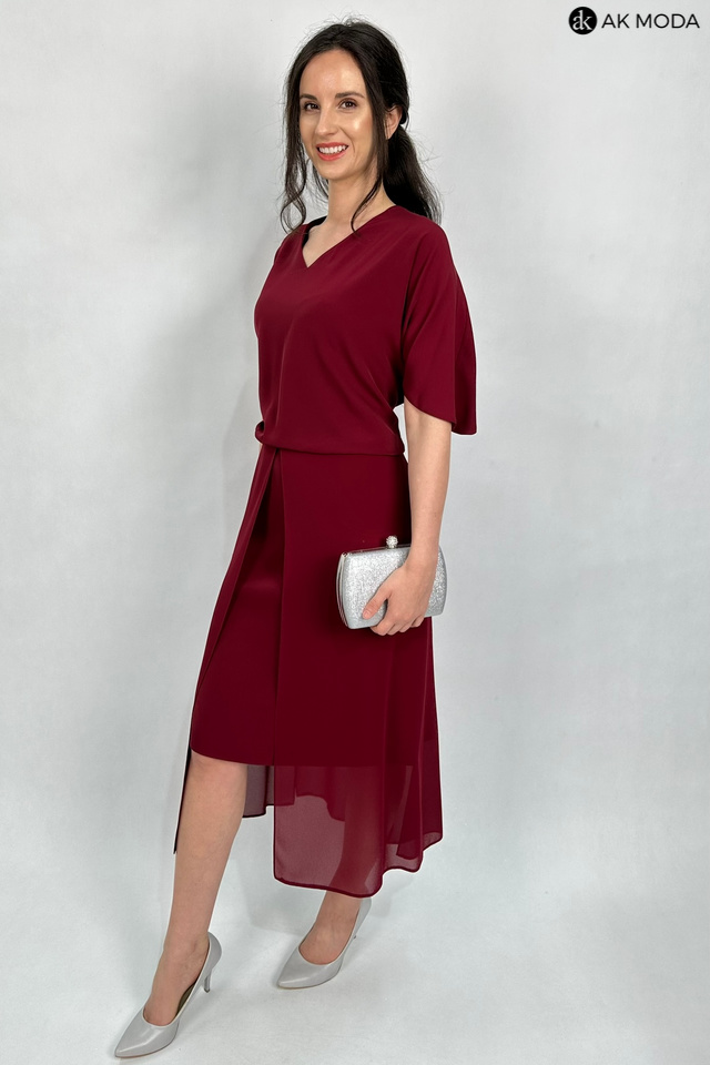 Elegancka sukienka midi w kolorze bordowym z krótkimi kimonowymi rękawami i dekoltem w szpic. Dół dopasowany, z wierzchnią warstwą dłuższego tiulu, góra luźniejsza.