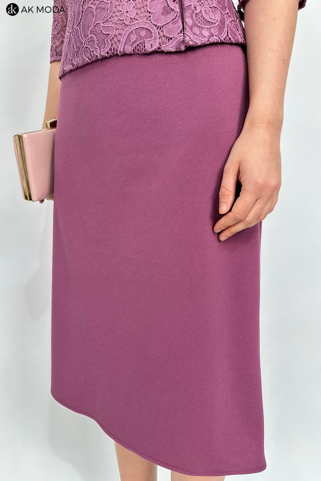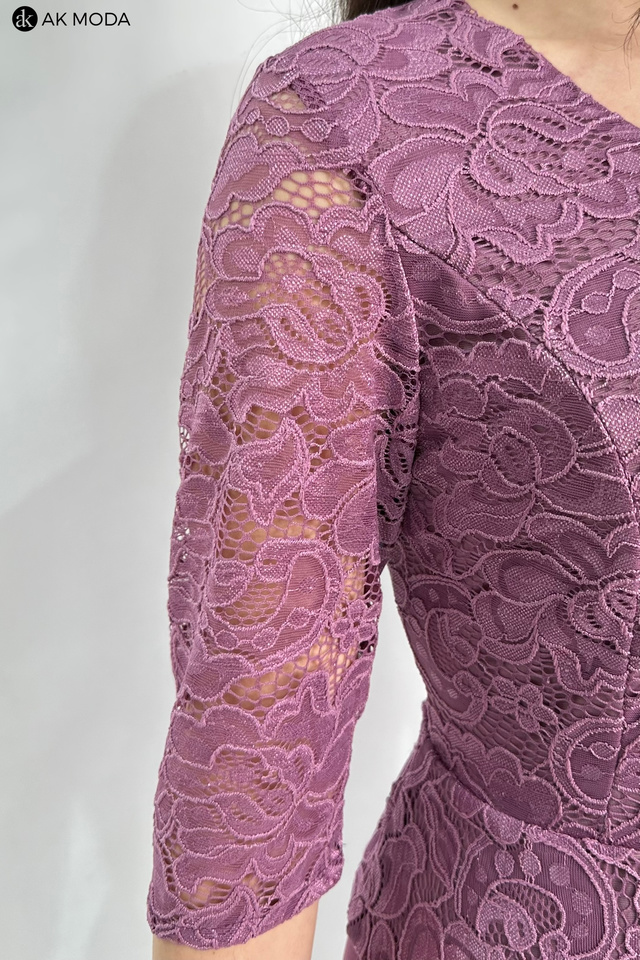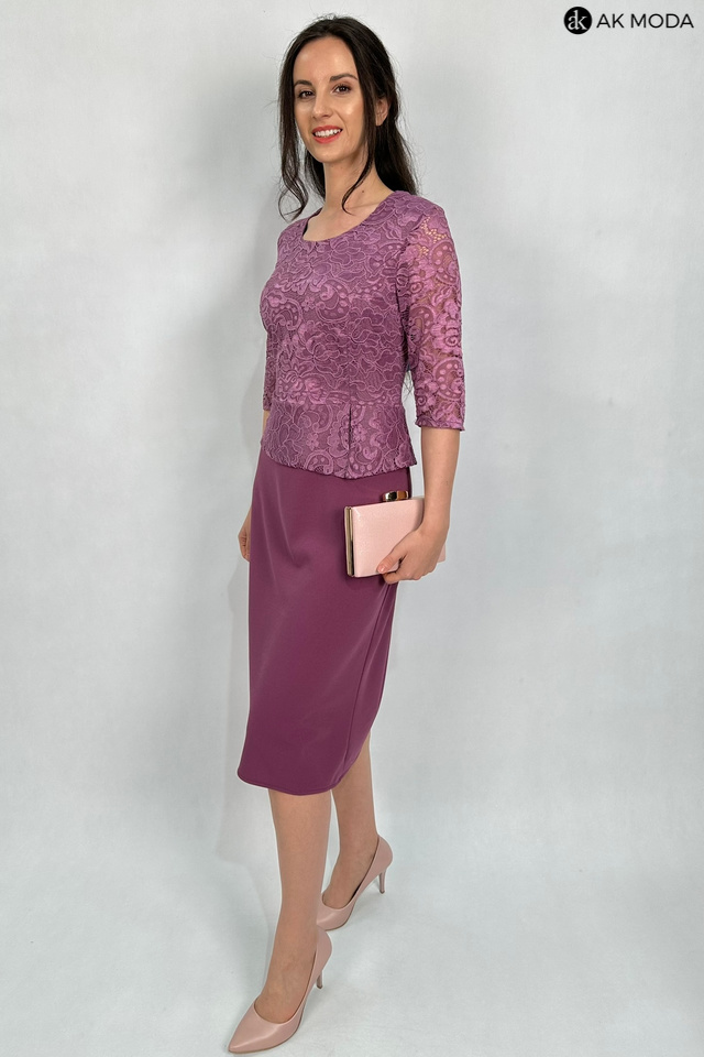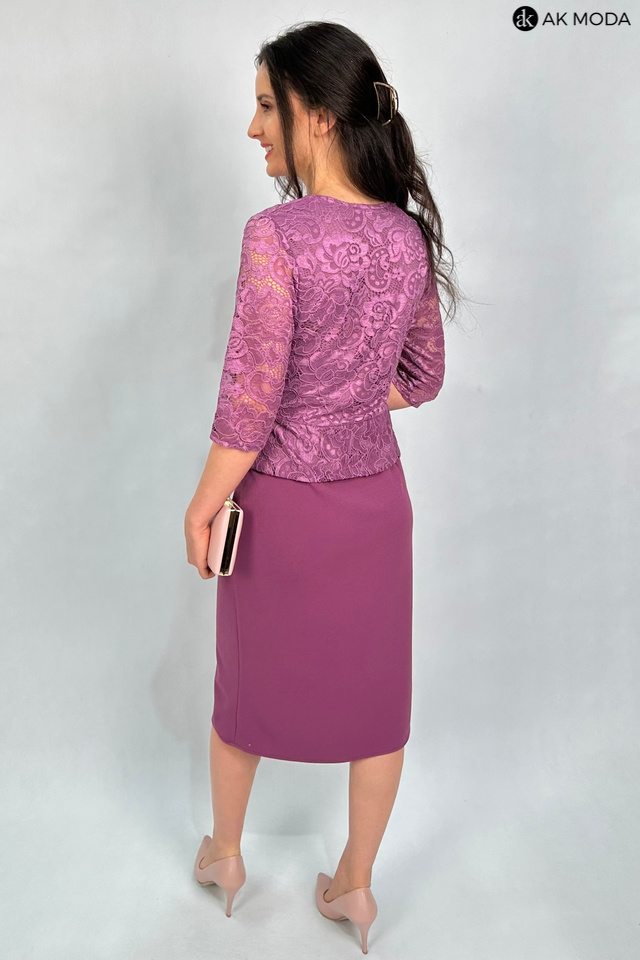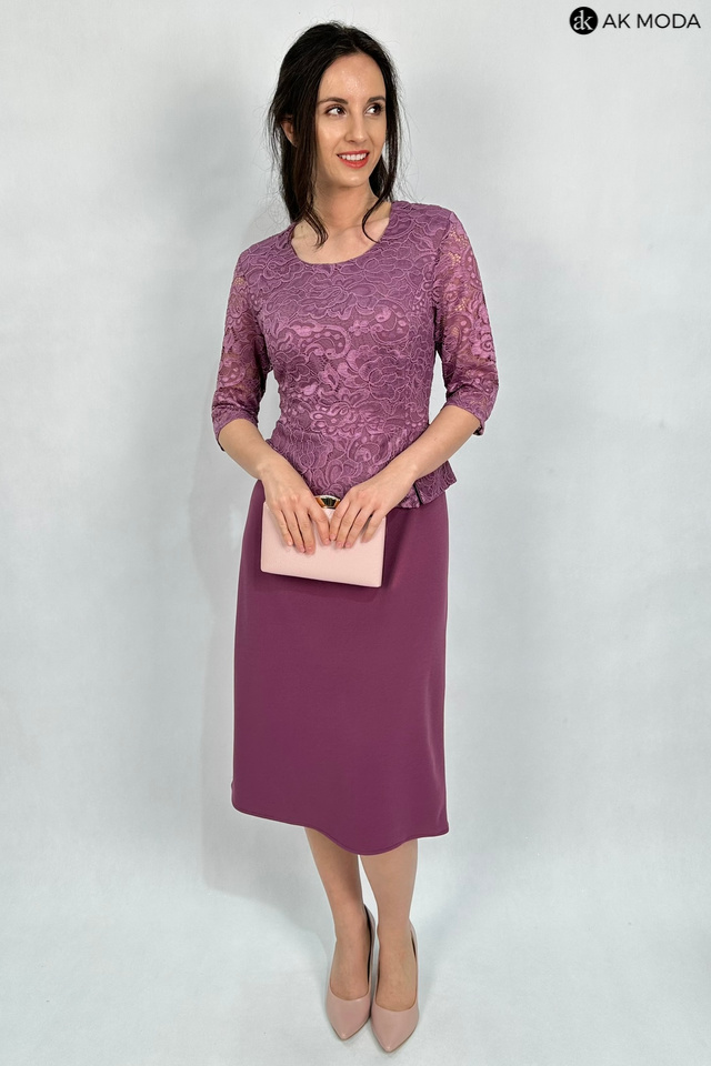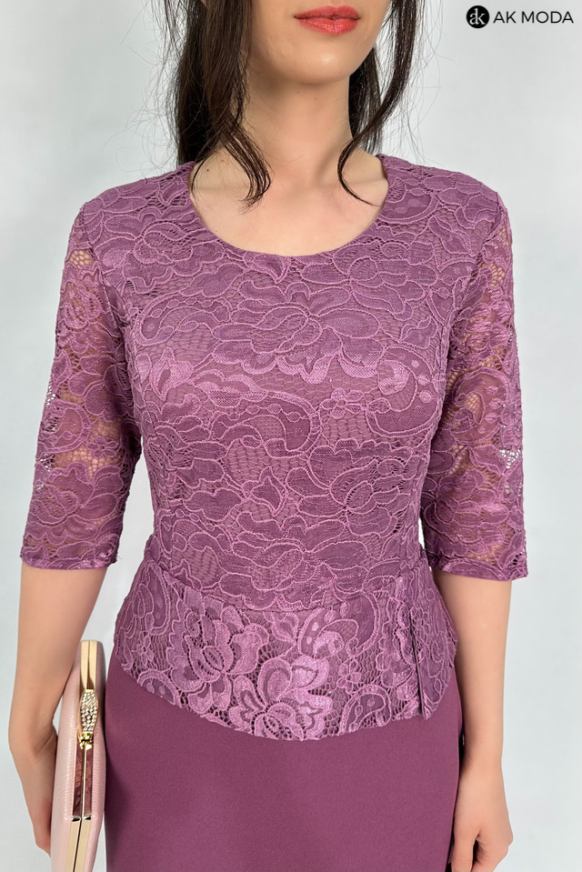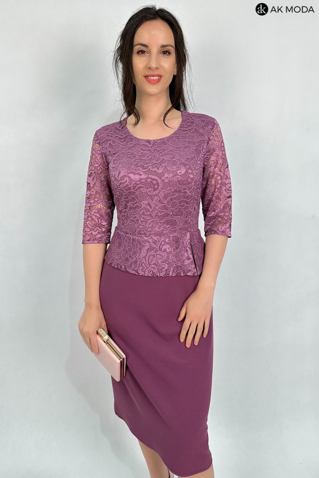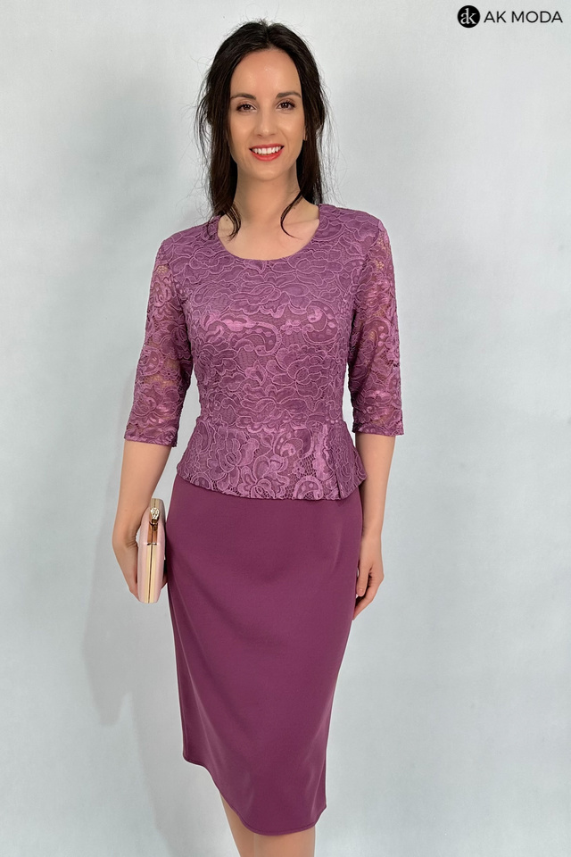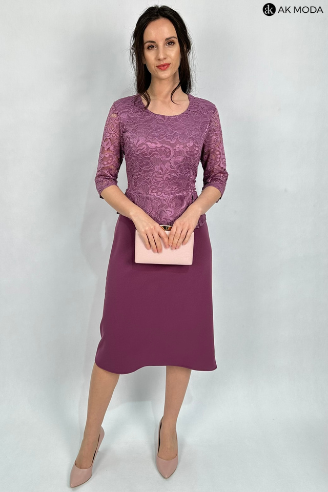 Elegancka, dopasowana sukienka z w kolorze wrzosowym z baskinką. Dekolt okrągły, rękawy do łokcia. Sukienka uszyta z elastycznego materiału, góra koronkowa, dół gładki.