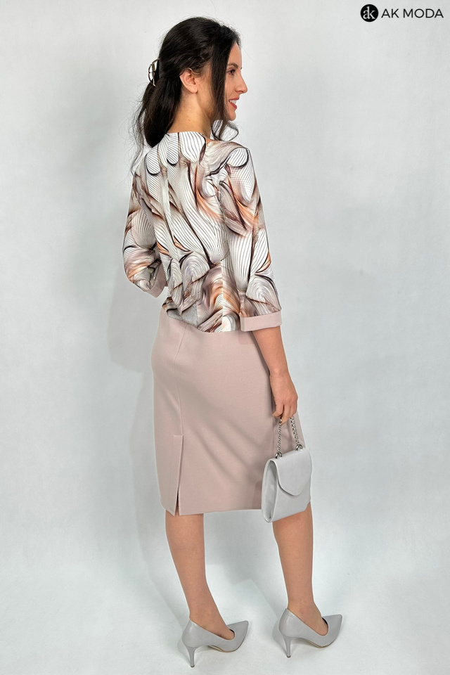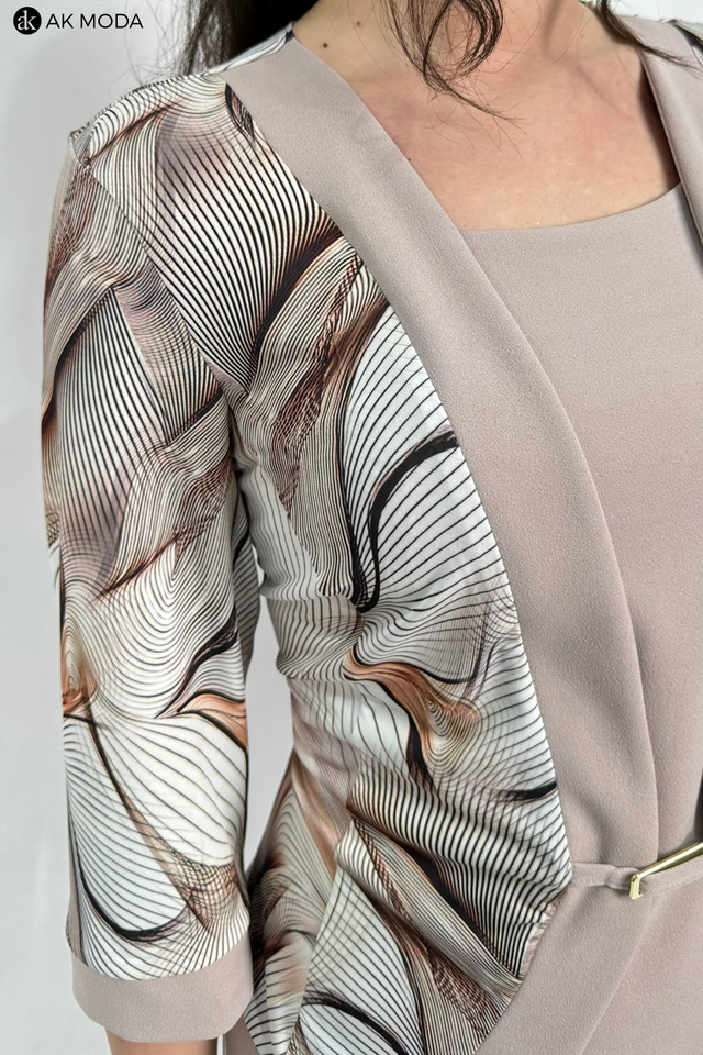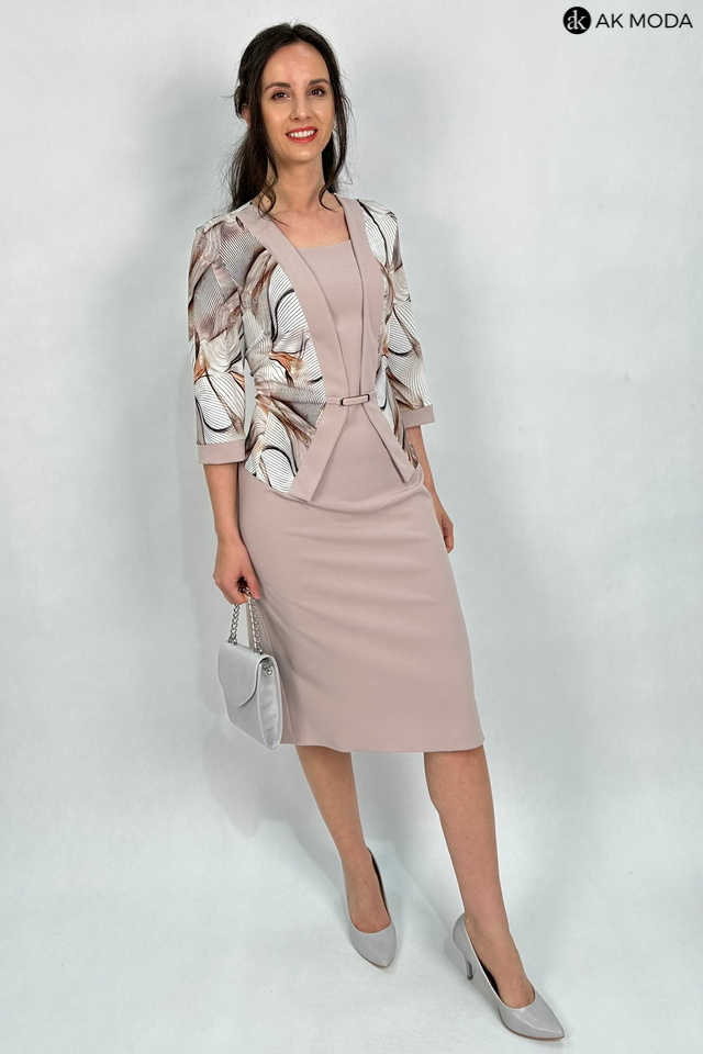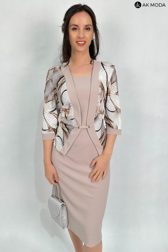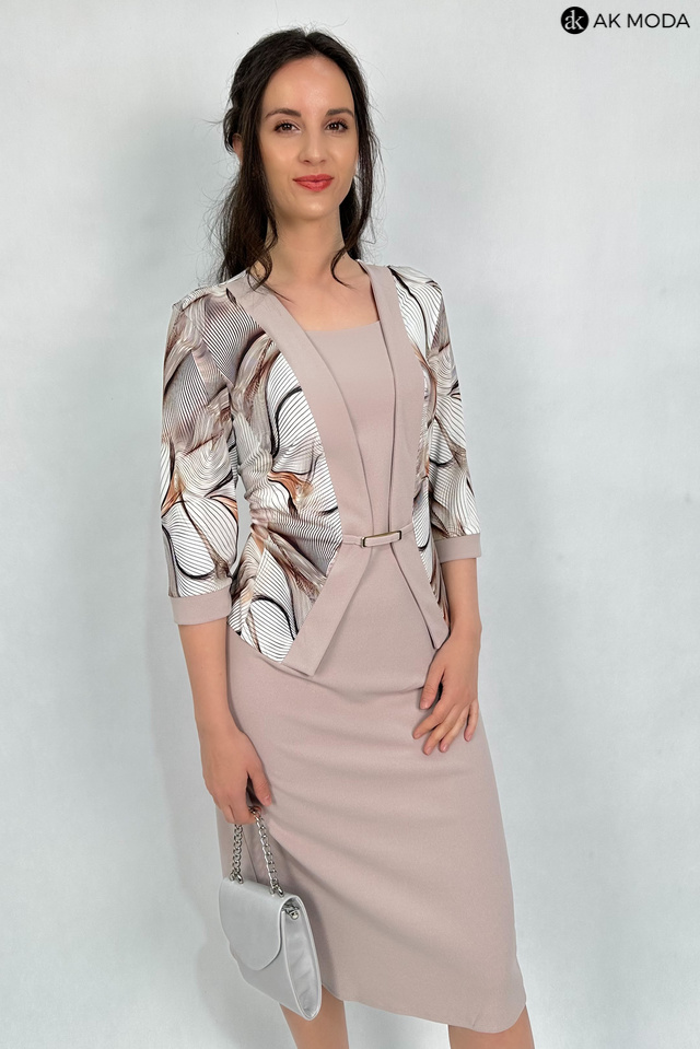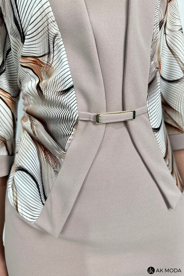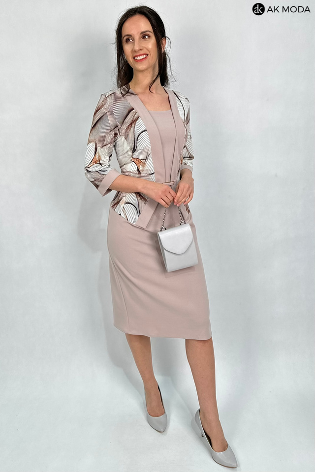 Elegancka, dopasowana sukienka utrzymana w beżowo-brązowej kolorystyce, uszyta z elastycznego materiału. Góra z wszytą częścią imitującą żakiet, z rękawami do łokcia.