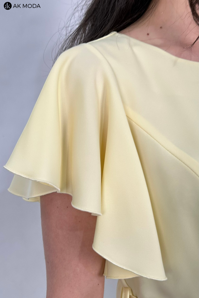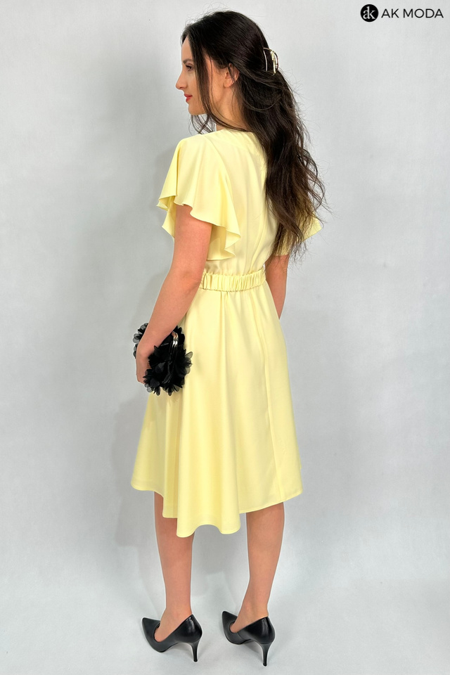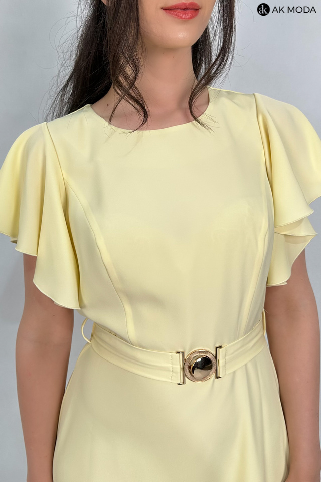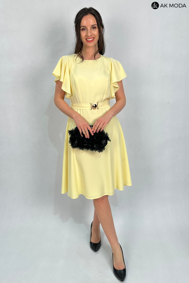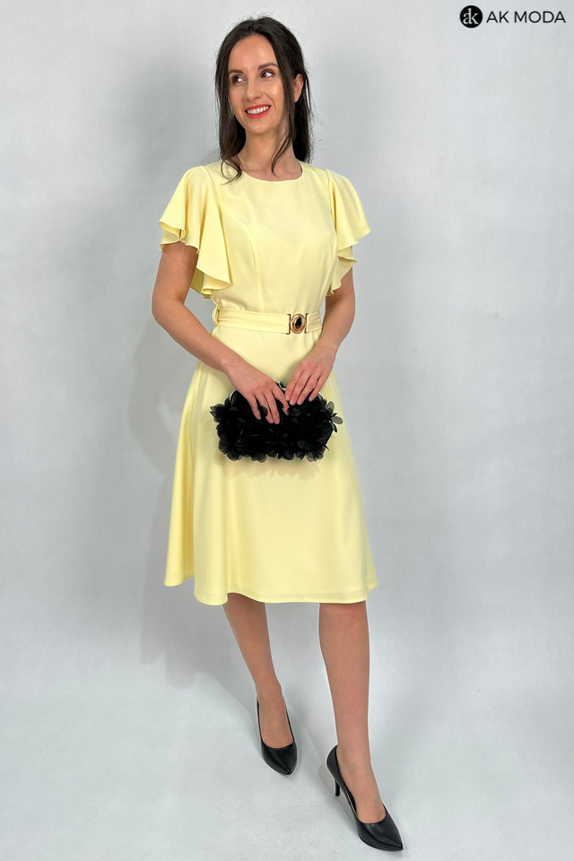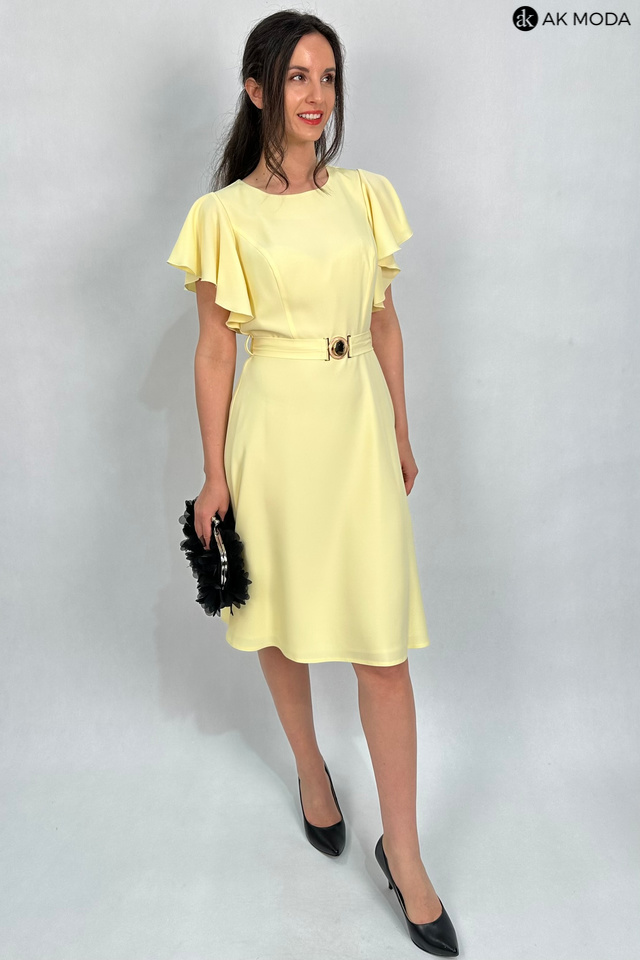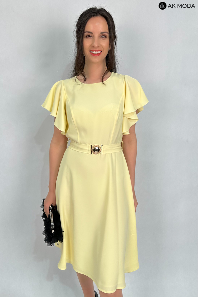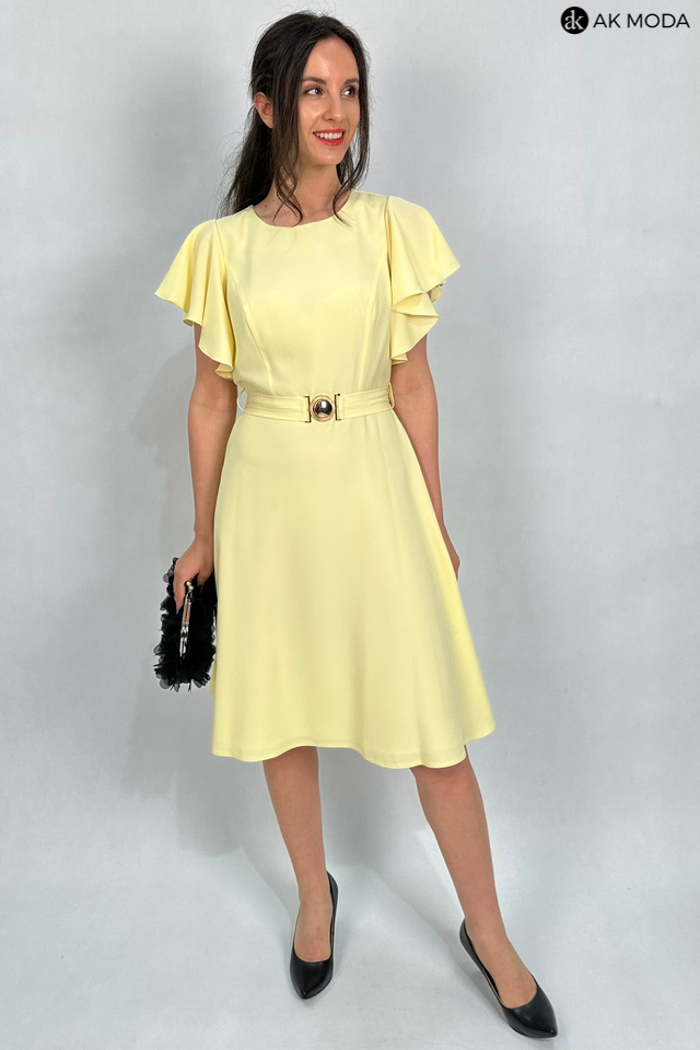 Elegancka rozkloszowana sukienka w kolorze żółtym. Dekolt okrągły, krótkie rękawy w formie falbanki, w talii elastyczny pasek z ozdobną klamrą.