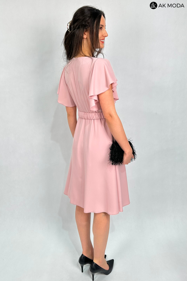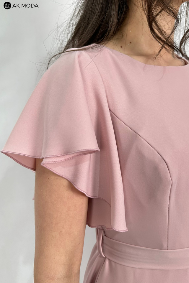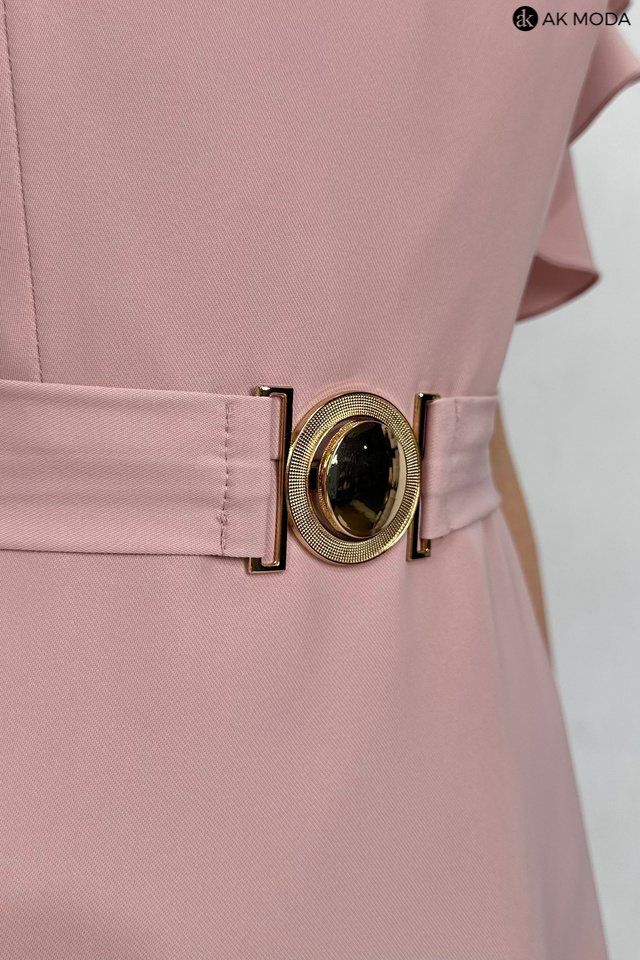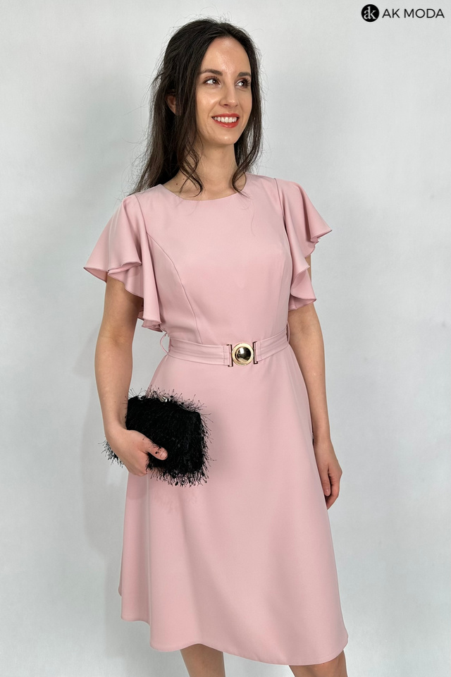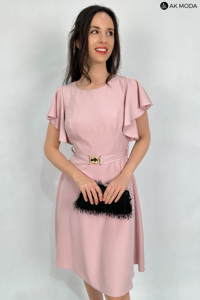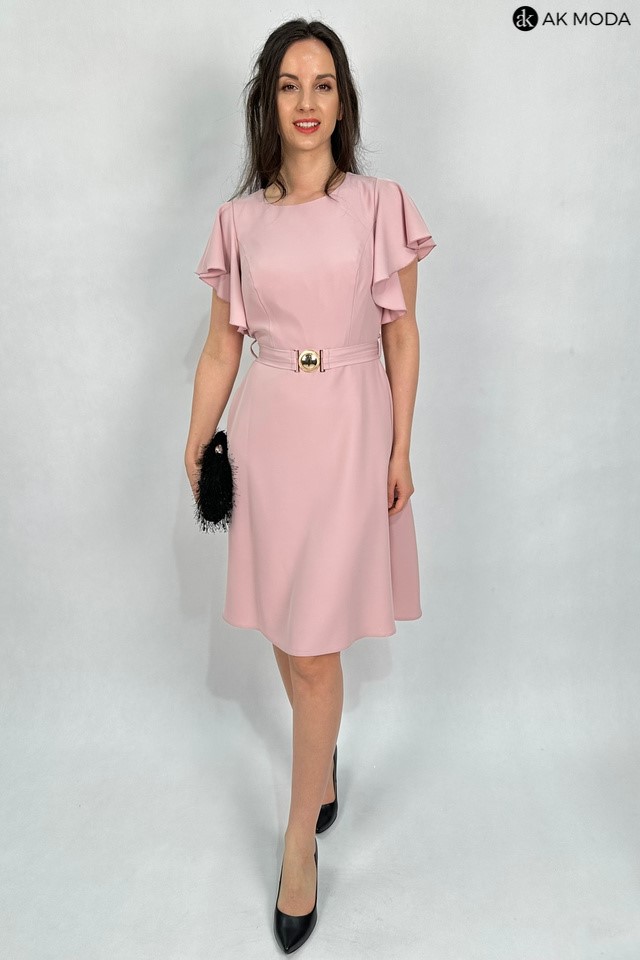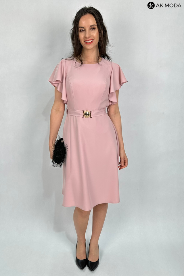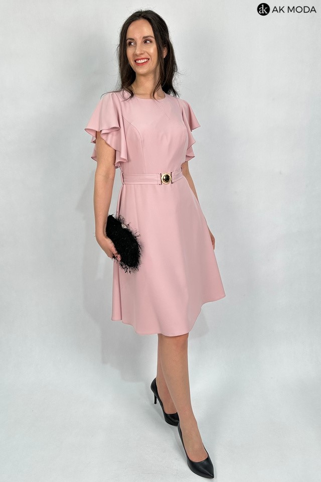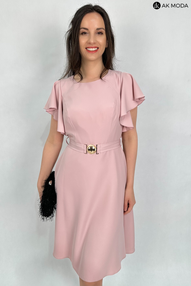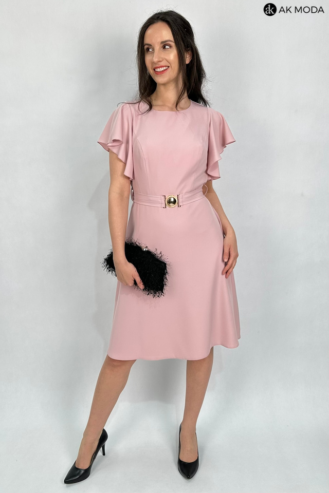 Elegancka rozkloszowana sukienka w kolorze pudrowego różu. Dekolt okrągły, krótkie rękawy w formie falbanki, w talii elastyczny pasek z ozdobną klamrą.